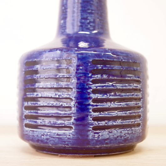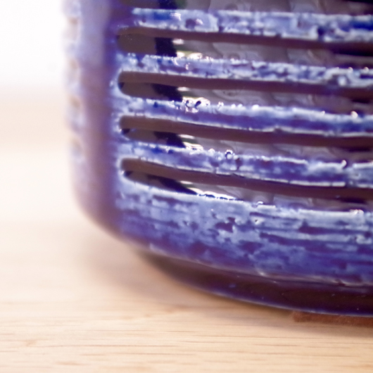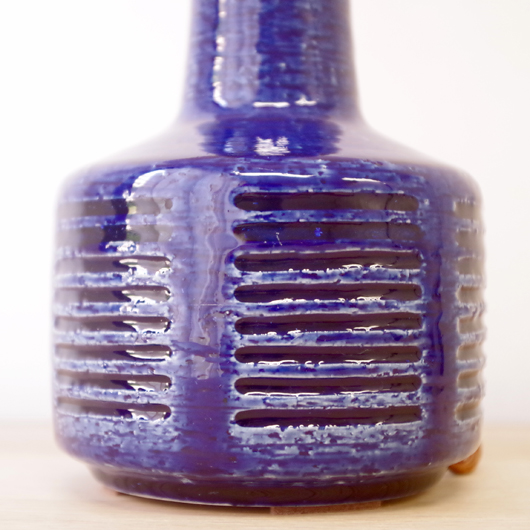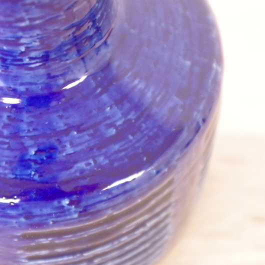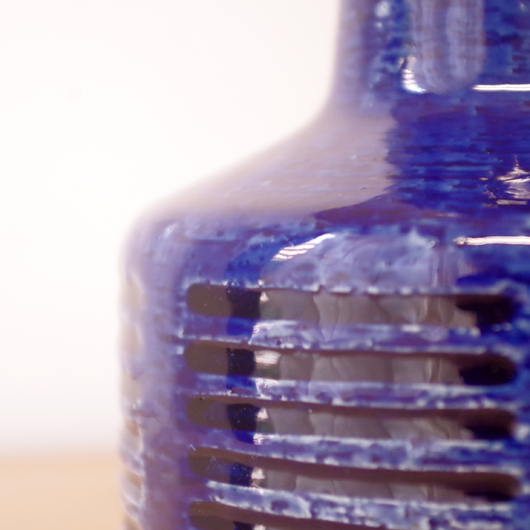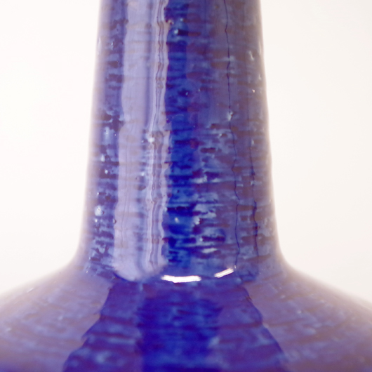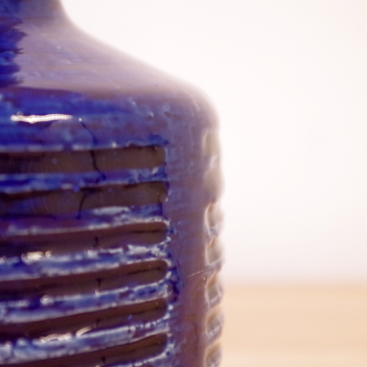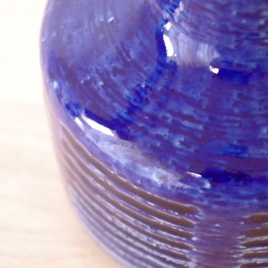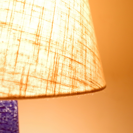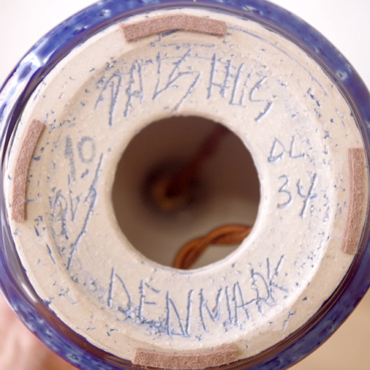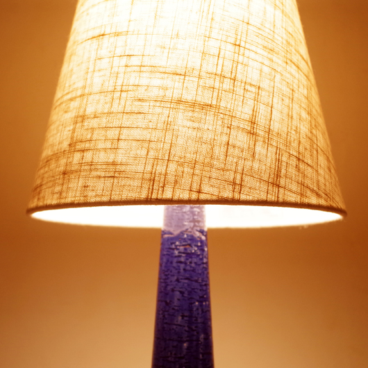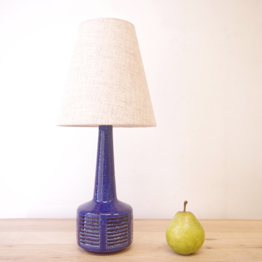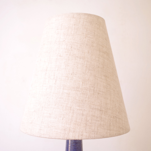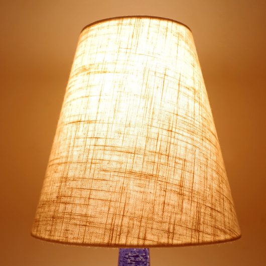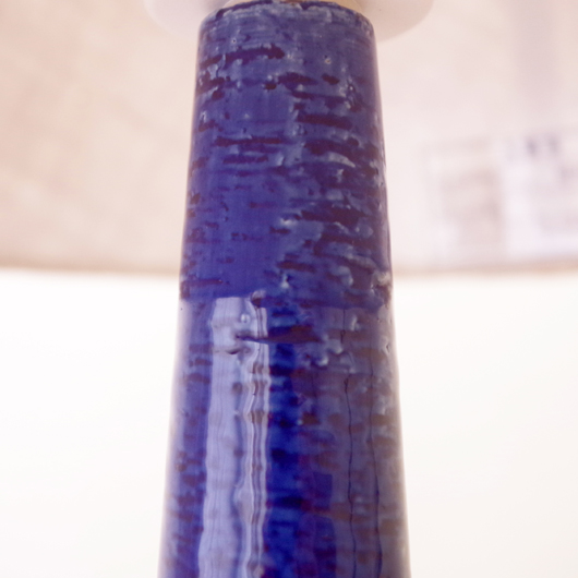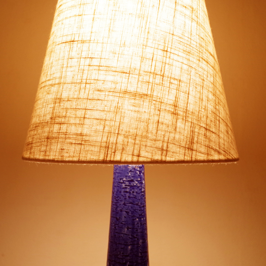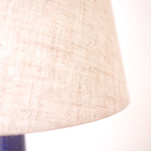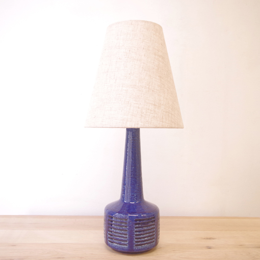 デンマークの名窯のひとつPalshus窯の陶製のベースを用いた、1960年代デンマーク製のヴィンテージ テーブルランプ。Palshus窯は1948年から1972年のわずか24年間シュミット夫婦が開いた窯で、こちらはその後期の作品の特徴を捉えた作品です。レンガの材料であるchamotteと呼ばれる焼成した耐火粘土を砕いて、細かい粒にしたものを混ぜて、荒々しい表情を作り出しています。藍色のグラデーションはまるで、移ろいゆく空を表しているようです。この落ち着いた色合いはどんなインテリアにも溶け込みやすく、和の空間にもすんなりと馴染んでしまうおおらかさがあります。 シェードは本体の形が美しく見えるように国内にてオーダーした手作りのもので、リネン地を通した灯りが部屋にやわらかく広がります。新しく交換したコードなども、ヴィンテージの風合いに合うデザインをセレクトました。また電気に関わる部分はすべて、電気用品安全法に基づいて制作しておりますので、新品同様に安心してご使用いただけます(詳しくは下記をご覧ください)。 丁寧な修復を行いまして、とても綺麗な状態です。空間の雰囲気をぐっと高めてくれる、観賞用としても素晴らしい一品です。