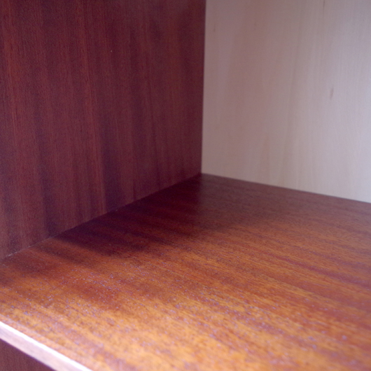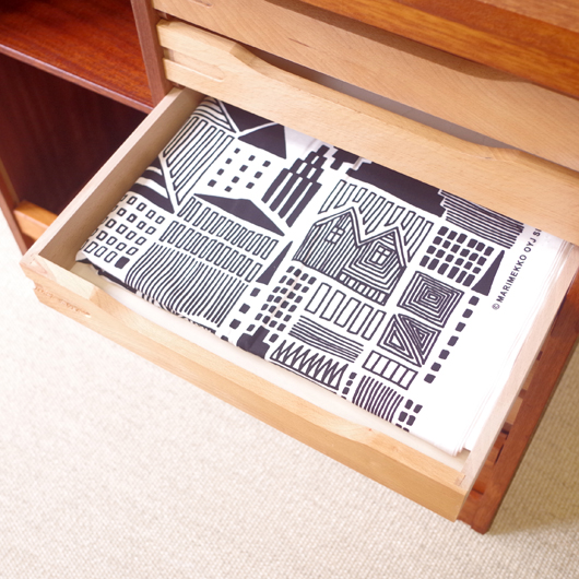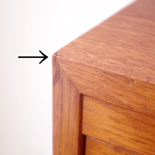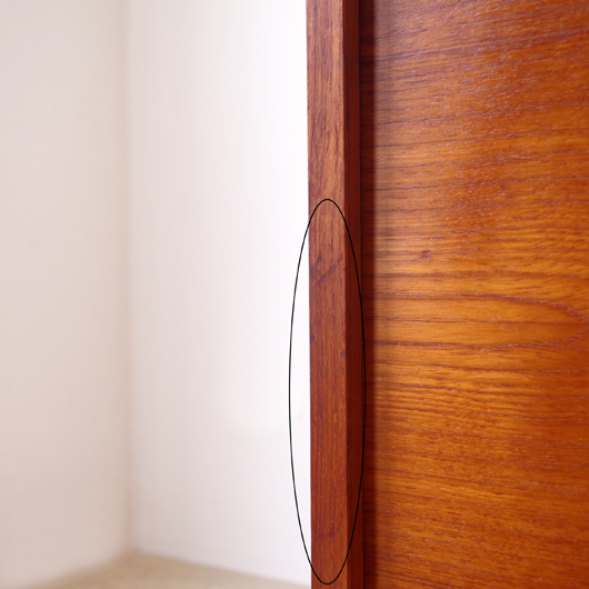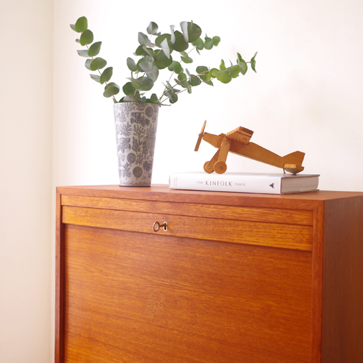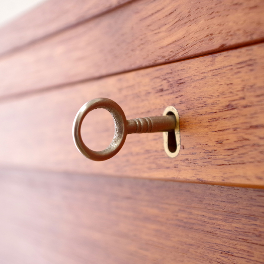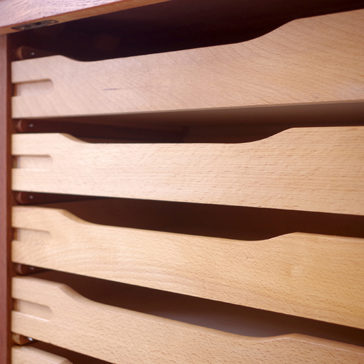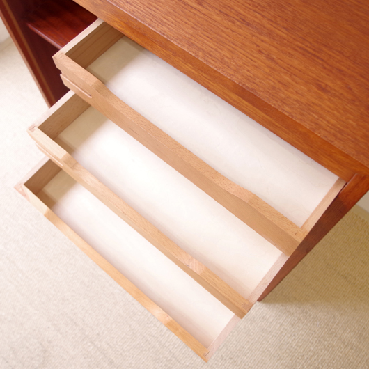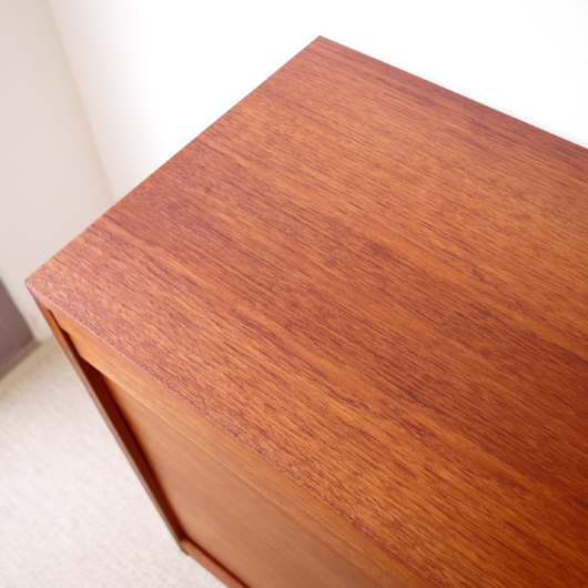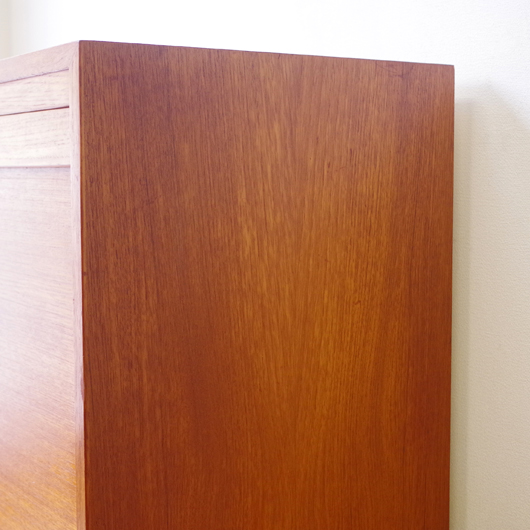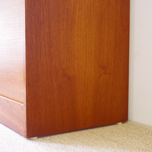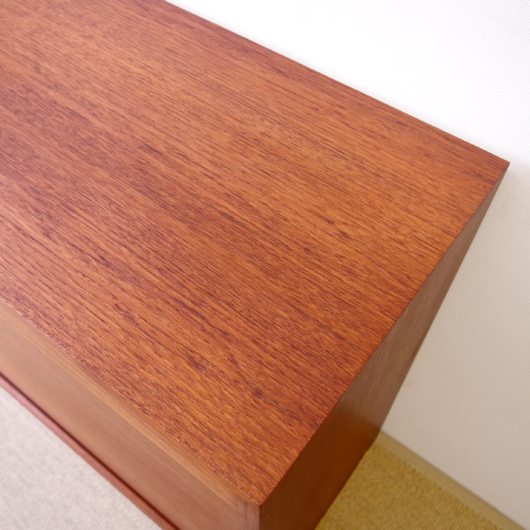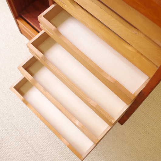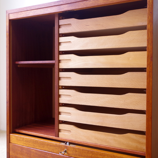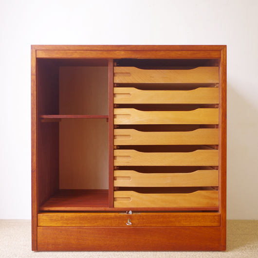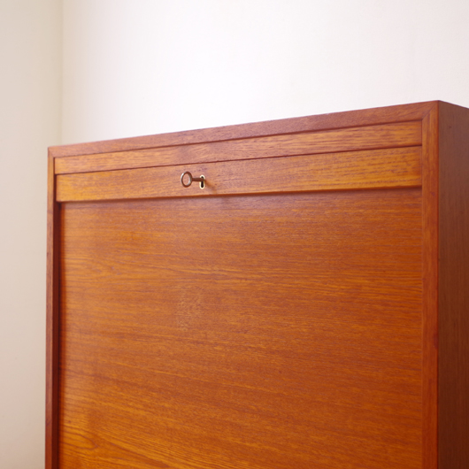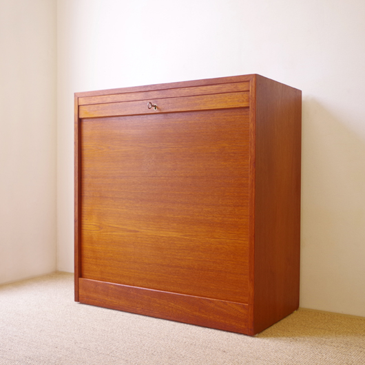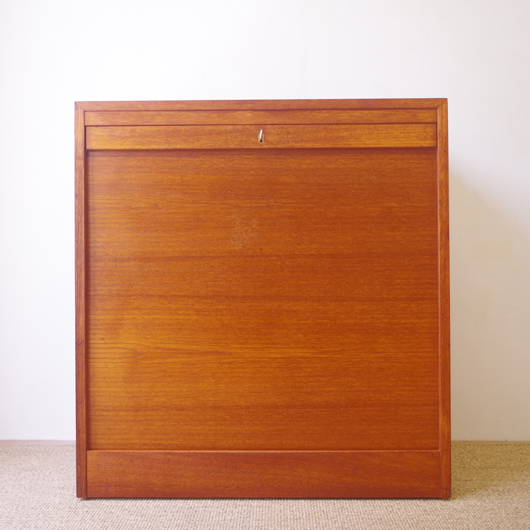 1960年代デンマーク製のヴィンテージロールフロントキャビネット。正面のチーク材の美しい杢目をよく見ると細かなスリットが入っており、鍵を回すと下側にサッと巻き込まれていく蛇腹式の扉となっています。近くで見ても分からないほどの細かなスリットは楽しい驚きを与えてくれるとともに、丁寧で高度な技術であることが伺えます。 内部は左側に2段のオープン棚、右側に収納ケースが7段備わった収納部となっています。 広い天板にプリンターなどを設置したり小物をディスプレイをしたりと、用途に応じた活用方法が考えられます。ケースには書類や切り抜きなどを分かりやすく種分けし、実用的な一台として活躍してくれそうです。 丁寧な修復を施しまして、良好な状態です。収納ケースの底板はすべて交換し、清潔にお使いいただけます。いくつかある小キズなどを考慮したお値段となっておりますが、雰囲気を損なわない程度のものかと思います。詳しくは画像にてご確認ください。