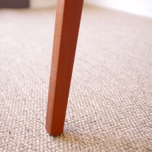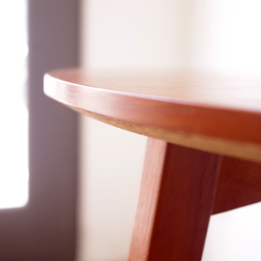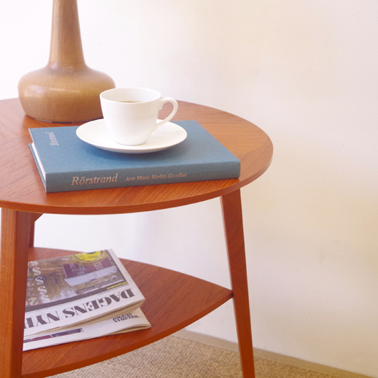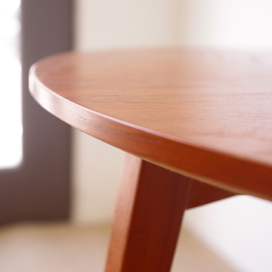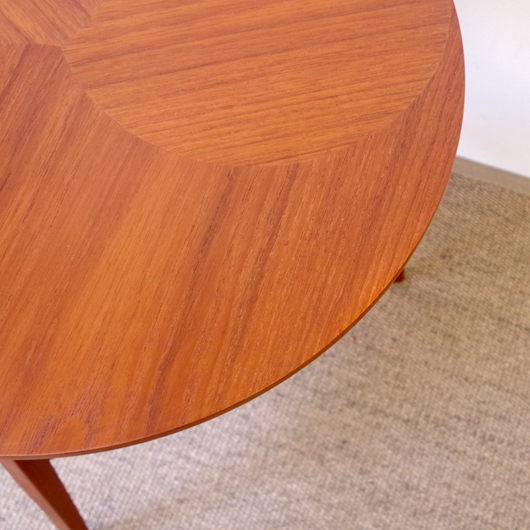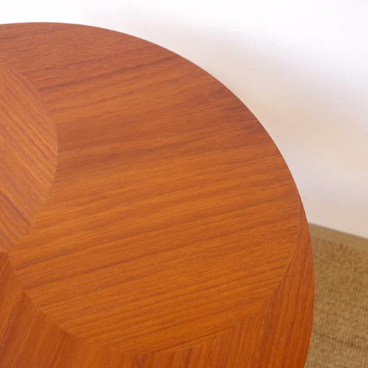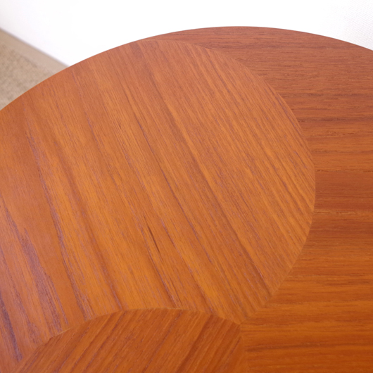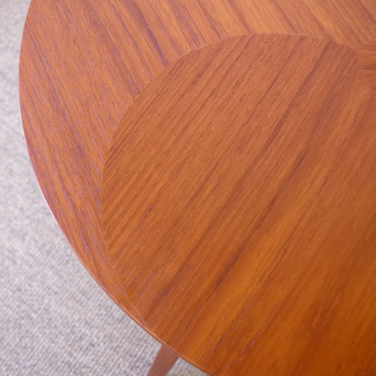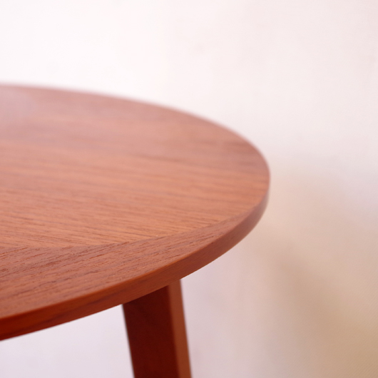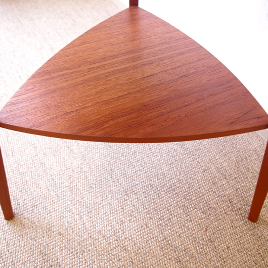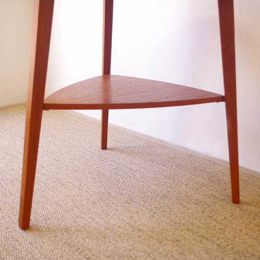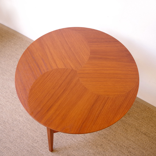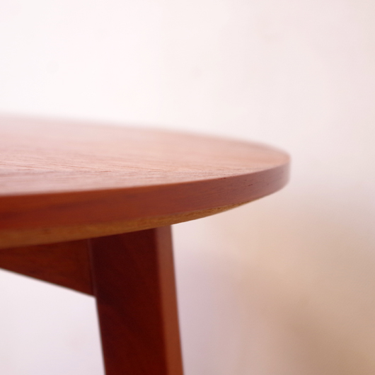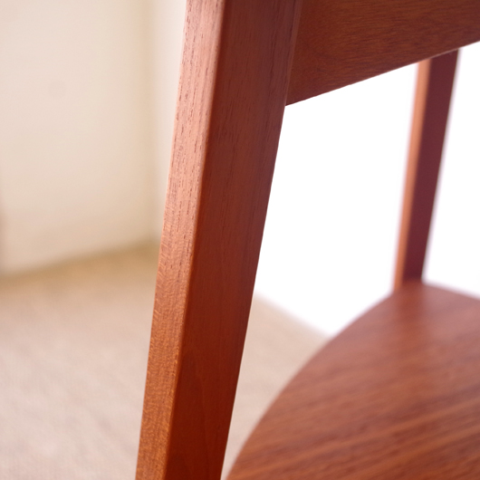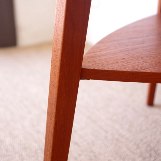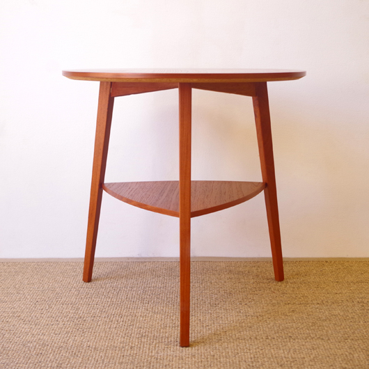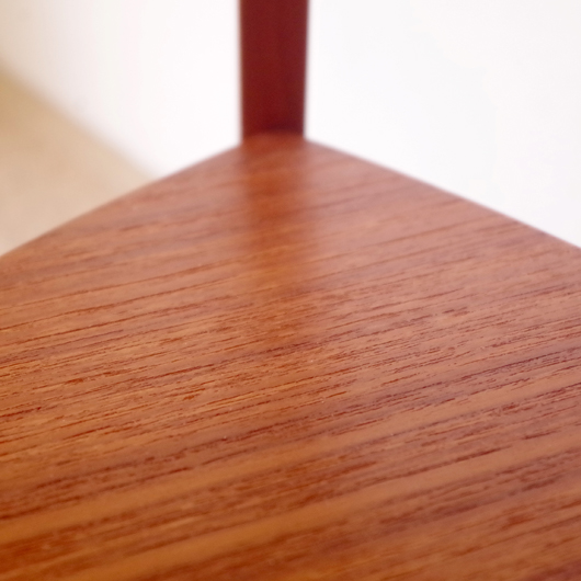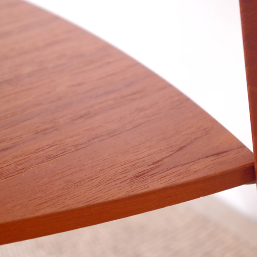 1960年代デンマーク製の、ヴィンテージサイドテーブル。まるで”かざぐるま”の羽のように、3枚の突き板が渦巻き模様を作り出す天板に目を奪われます。その下には辺に膨らみのある三角形ルーロー・トライアングルの形をした棚板が付いており、すっと伸びた脚が本体を支えています。 特徴は何といっても、突板の高度な貼り合わせ技術による天板の細工。一見するとシンプルなようで、職人の技術の上に成り立っている遊び心とこだわりの詰まった一台です。 ソファの横に置いて天板にはコーヒーカップを、下のラックには雑誌やリモートコントローラーを置いたりと、暮らしに寄り添った使い方が思い浮かびます。チーク材の暖かな色味が北欧のヴィンテージらしく、部屋の雰囲気作りに活躍してくれそうです。 丁寧な修復を施しまして、非常に綺麗な状態です。天板には多少の水濡れにも問題のない塗装を施しております。詳しくは画像にてご確認ください。