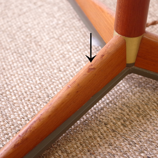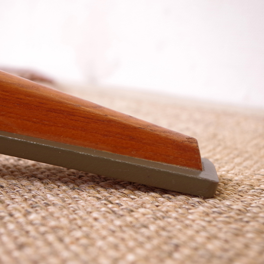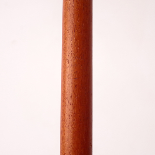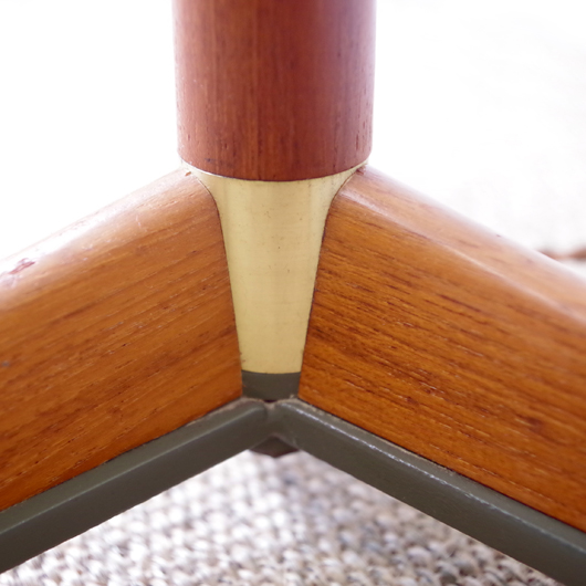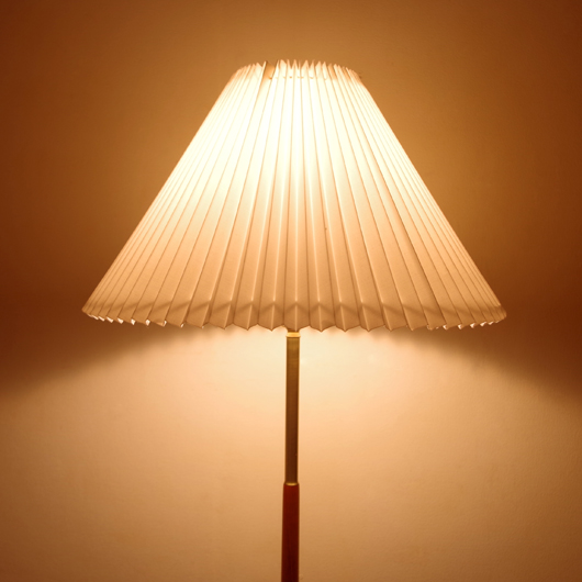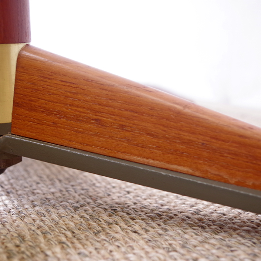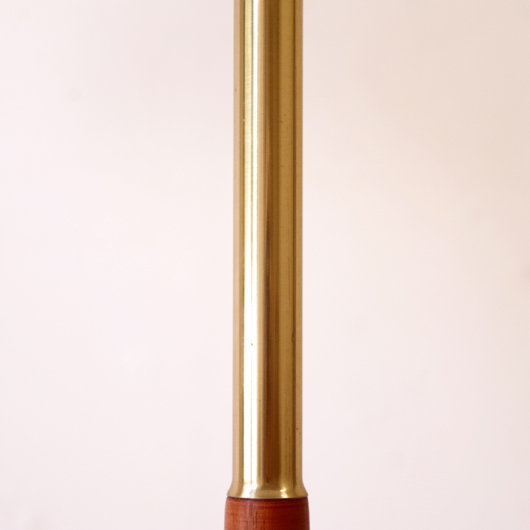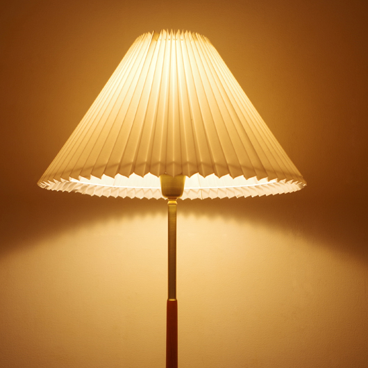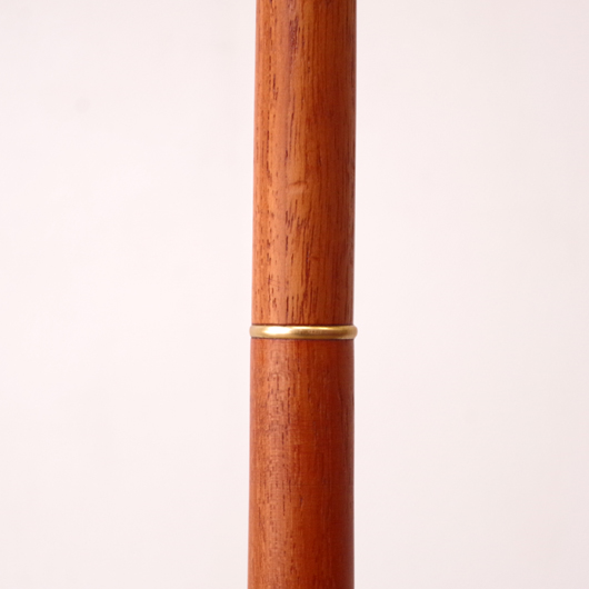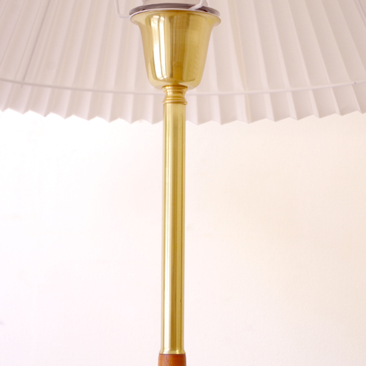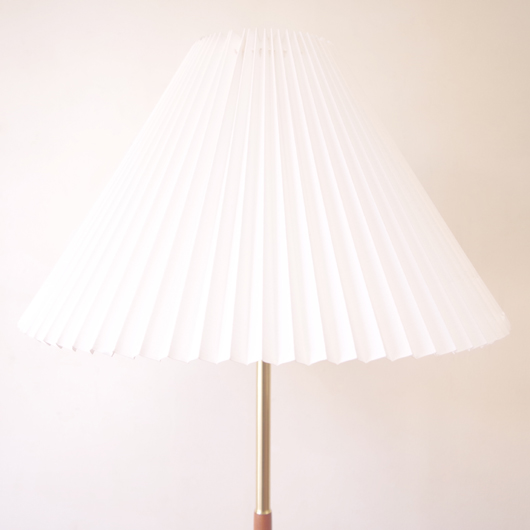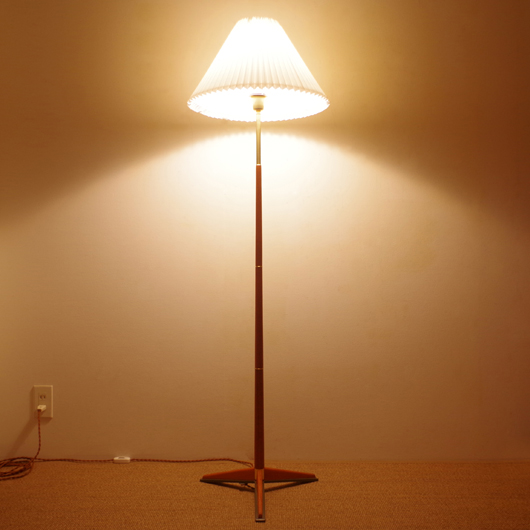1960年代スウェーデン製のヴィンテージフロアランプ。真鍮メッキのゴールドの支柱から明るめのチーク無垢材へと切り替わり、下方に行くにつれて緩やかに径が大きくなってゆきます。特徴は3本に分かれた脚部で、すっきりとモダンな印象を与えてくれます。また3本脚の繊細さを補うように下側にはグレーにペイントされたスチールの支えが付き、しっかりとした安定性を備えています。 合わせたシェードはデンマーク製の新しいもので、光を灯すとプリーツが美しい陰影を作り出してくれます(水色の円で示した箇所などに折れがみられますが、製品クオリティとしてご了承下さい)。新しく交換したコードなども、ヴィンテージの風合いに合うデザインをセレクトました。お使いのインテリアにプラスするだけで、やわらかな灯りによってお部屋の雰囲気をぐっと増してくれます。 電気工事士の資格を持つ職人によりソケット・コード・プラグ等の電気に関わる部分は全て交換し、電気用品安全法に基づいた点検なども行いPSEマークを表示しておりますので、新しいもの同様に安心してご使用いただけます(詳細下記ご参照)。脚部に打ちキズなどがみられますが、雰囲気を損なうものではないかと思います。詳しくは画像にてご確認ください。