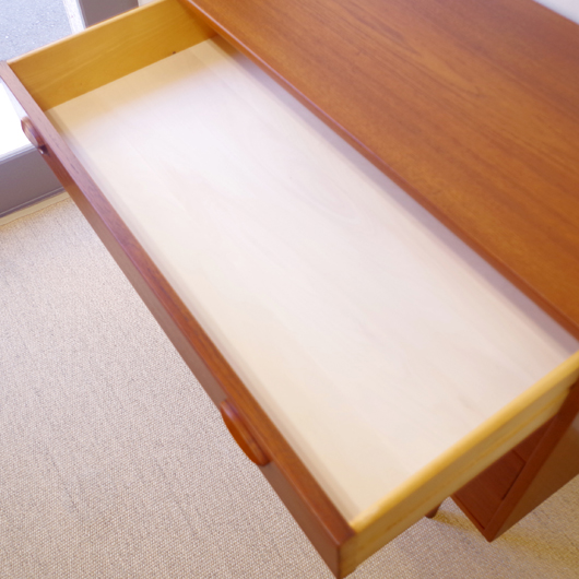 1960年代に活躍した家具デザイナーの一人、カイ・クリスチャンセンがデザインしました4段チェストです。トレードマークとなっている特徴的な取手が並び、シンプルなデザインのアクセントとなっています。もちろんデザインだけでなく指がかりもよく実用性を兼ね備えており、こうしたことが製造されてから半世紀経った今でも愛される理由なのかも知れません。素材は脚部まで全てチーク材を使用しており、年を経て美しい色合いへと変化しております。 同シリーズのいくつかあるサイズの中でも収納力のあるタイプで、衣類などをたっぷり収納していただけます。落ち着いた佇まいのチェストで、広い天板には小物をディスプレイしたりとお楽しみいただけます。 丁寧なメンテナンスを施しまして、天板は輪ジミなどなく綺麗な状態です。引出しの底板も交換済みのため、清潔にお使いいただけます。天板に小キズなどが見られますが、まず気にならない程度のものかと思います。ただお値段はそれらを考慮したものとなっております。詳しくは画像にてご確認ください。