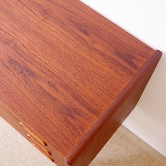 1960年代デンマーク製の、ヴィンテージ3段チェスト。小ぶりなサイズにコロンとした楕円形の取っ手が付き、北欧家具らしいやわらかな雰囲気を醸し出しています。 玄関やリビングなどに置いて、文具など細かなものを収納してはいかがでしょうか。また天板にはお気に入りの小物や花瓶などなどをディスプレイしたりしてお楽しみいただけます。そして程よい高さのため、上の空間にポスターや壁掛けミラーを合わせても良さそうです。 丁寧な修復を行いまして、綺麗な状態です。引出しの底板は全て新しく交換しておりますので、清潔に気持ち良くお使いいただけます。詳しくは画像にてご確認下さい。