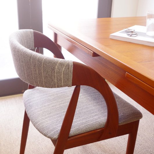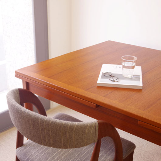 1960年代デンマーク Kai Winding デザインによる、Slagelse Møbelvaerk社製のヴィンテージ ダイニングテーブル。幅・奥行き共に程よいサイズで、脚と脚との間も十分な広さがあり、ゆったりとお座りいただけます。天板エッジには縁取りを付け、直線を意識したデザインとなっています。脚部は一転して接合部の複雑なアールから円柱へと切り替わり、そんな細やかなデザインが見どころかと思います。 素材にはこの時代ならではの木目の美しい上質なチーク材が用いられており、ぬくもりのある素材が日々の暮らしに寛ぎをプラスしてくれそうです。また短手方向に木目を持ってくることで、天板のシャープなデザインを強調しているようです。アルネ・ヴォッダーやオーレ・ヴァンシャーの作品も多く手がけるSlagelse Møbelvaerk社ならではの実直な仕事ぶりが伺えます。天板下に内蔵された2枚のエクステンション(伸張)板を使用することで、必要に応じて最大8名まで対応し、片側のみ広げての使用も可能です。 全体を丁寧に研磨(サンディング)をして小キズや輪ジミを取り除き、その後に再塗装を行い、自然な艶の良い雰囲気に仕上がりました。また修復時には天板とエクステンション板の色味を合わせていることも修復時に心がけているポイントで、広げた際にとても気持ち良くお使いいただけます。多少の水濡れにも問題のない塗装を施しておりますので、人が集まった際や小さなお子様のいるご家庭でも安心してご使用いただけます。詳しくは画像にてご確認ください。