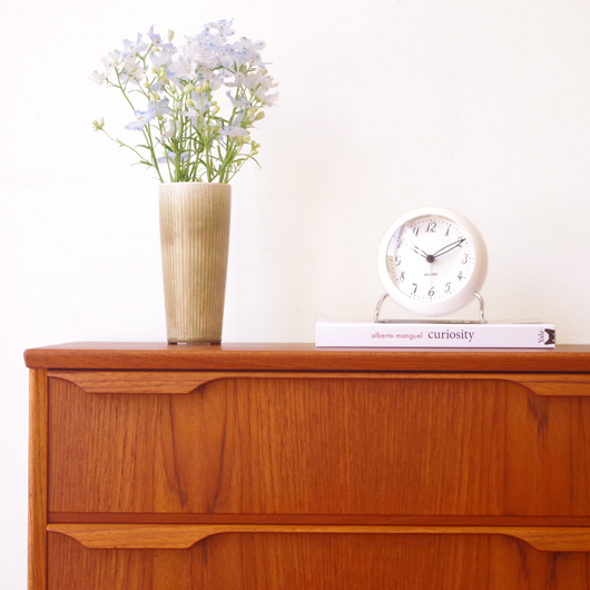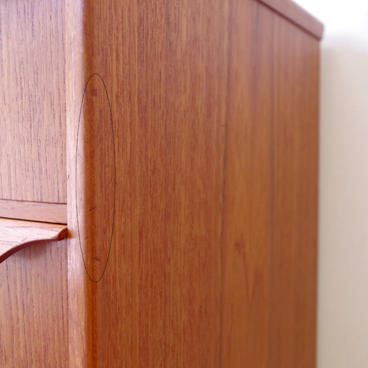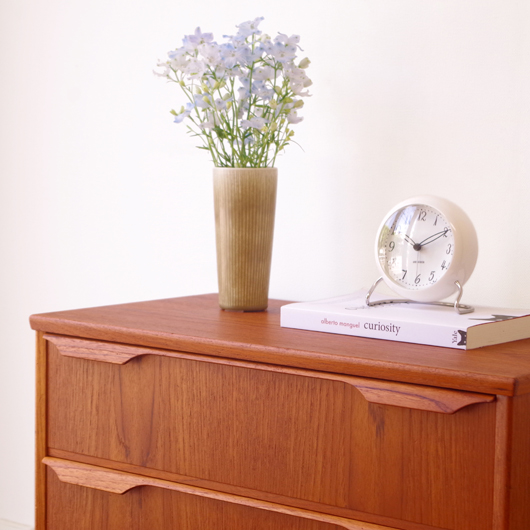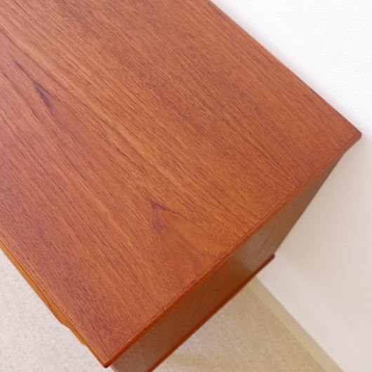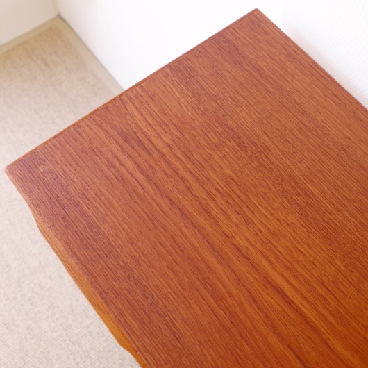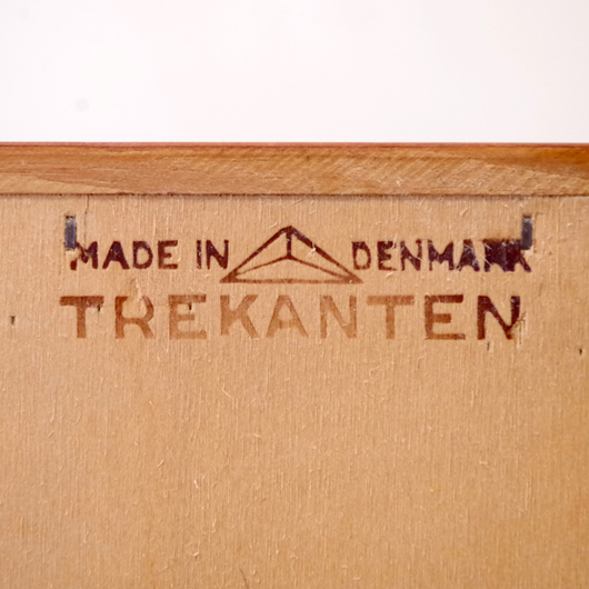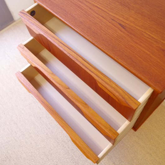 1960年代デンマークTrekanten Mobelfabrik製の、ヴィンテージ3段チェスト。引き出しの取っ手はプライウッドの特性を生かしたラインの美しい取っ手で、指掛かりも良好です。全体的にシンプルで飽きのこないデザインながら、素材の良さや造りの丁寧さなどが感じられます。それは製品の素材・耐久性・品質など、一定の条件を満たしたもののみに付けられる「DANISH FURNITUREMAKERS' QUALITY CONTROL」のマークがあることからも窺い知ることができます。また正面から見て上下に揃った杢目も、丁寧に作られたデンマーク製のヴィンテージ家具らしいポイントのひとつです。 玄関やリビングなどに置いて、文具など細かなものを収納してはいかがでしょうか。また天板にはお気に入りの小物や花瓶などなどをディスプレイしたりしてお楽しみいただけます。そして程よい高さのため、上の空間にポスターや壁掛けミラーを合わせても良さそうです。 丁寧な修復を行いまして、綺麗あな状態です。引き出しの底板も新しい物に交換しておりますので、清潔にお使いいただけます。わずかな小キズなどございますが、気にならない程度かと思います。詳しくは画像にてご確認下さい。