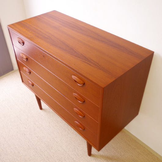 1960年代に活躍した家具デザイナーの一人、カイ・クリスチャンセンがデザインしました4段チェストです。トレードマークとなっている特徴的な取手が並び、シンプルなデザインのアクセントとなっています。もちろんデザインだけでなく指がかりもよく実用性を兼ね備えており、こうしたことが製造されてから半世紀経った今でも愛される理由なのかも知れません。素材は脚部まで全てチーク材を使用しており、年を経て美しい色合いへと変化しております。 同シリーズのいくつかあるサイズの中でも収納力のあるタイプで、衣類などをたっぷり収納していただけます。落ち着いた佇まいのチェストで、広い天板には小物をディスプレイしたりとお楽しみいただけます。 丁寧なメンテナンスを施しまして、天板は輪ジミなどなくとても綺麗な状態です。引出しの底板も交換済みのため、清潔にお使いいただけます。古い補修跡などが見られますが、気にならない程度のものかと思います。詳しくは画像にてご確認ください。