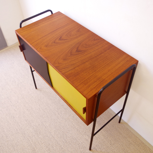 1950年代スウェーデン製のヴィンテージ サイドキャビネット。チーク材を用いた本体と、側面に取り付けられたスチールのフレームが軽快なリズムを奏でています。また脚先にはチーク材の靴下を履き、異なる素材を上手く融合しております。 扉部分のブラックとスカンジナビアンイエローのカラー が全体をモダンな印象に仕上げています。内部の棚板は指をかけて手前にスライドさせるユニークな構造です。そして手前の扉をスライドさせた際にもう片方の取っ手に当たらないように、さりげなく"くの字"にデザインされた扉のデザインも見所の一つかと思います。 絵やポスター、鏡などを組み合わせたりと空間作りのアクセントにお勧めです。広い天板には小物をディスプレイしてお楽しみいただけます。 丁寧な修復を行いまして、全体的に良好な状態です。フレームなどに若干の経年感が見られますが、雰囲気を損ねるものではございません。詳しくは画像にてご確認ください。