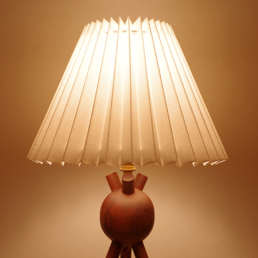 1950〜60年代デンマーク製のテーブルランプ。木目に見ごたえのあるチーク無垢材の球体を中心に据え、その下には三角錐を形づくるように3本の脚が伸び、そこに入った斜めの貫によって複雑なフォルムを呈しています。また脚先には真鍮の靴下を履かせ、年を経て鈍い光を讃える真鍮にてアクセントを付けています。 合わせたシェードはデンマーク製の新しいもので、光を灯すとプリーツが美しい陰影を作り出してくれます。新しく交換したコードなども、ヴィンテージの風合いに合うデザインをセレクトました。 シェードやチーク無垢材の球体は、光を灯した時に特に美しい陰影を作り出します。コーヒーテーブルやチェストの上に置いて、お気に入りの空間を作り出してはいかがでしょうか。 電気工事士の資格を持つ職人によりソケット・コード・プラグ等の電気に関わる部分は全て交換しまして、電気用品安全法に基づいた点検なども行いPSEマークを表示しておりますので、新しいもの同様に安心してご使用いただけます(詳しくは下記をご覧ください)。 丁寧な修復を行いまして、綺麗な状態です。詳しくは画像にてご確認ください。
