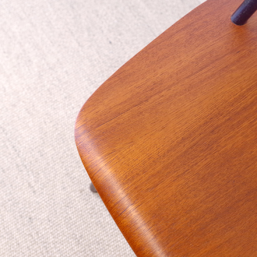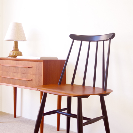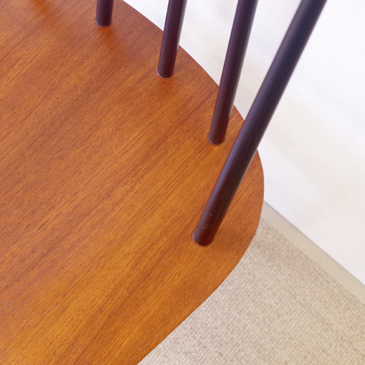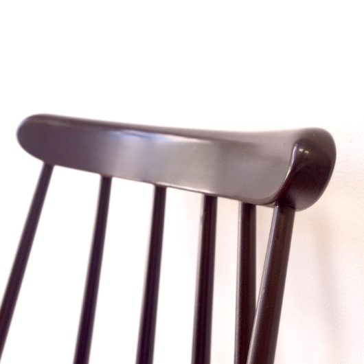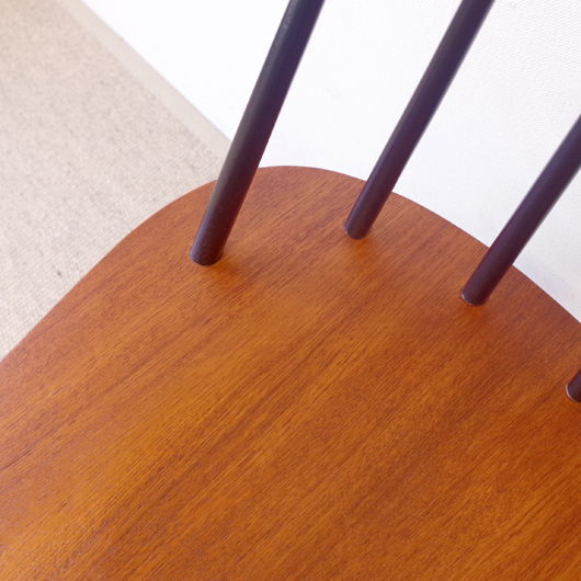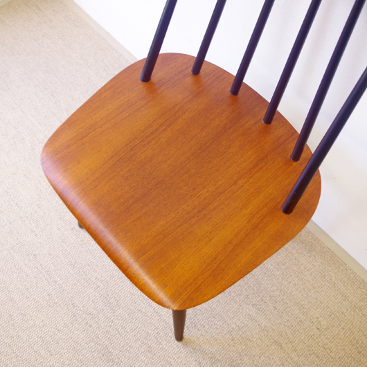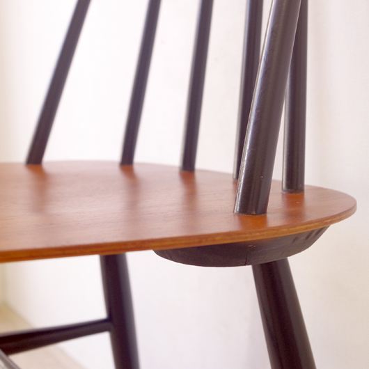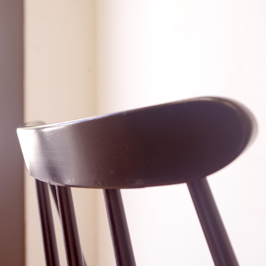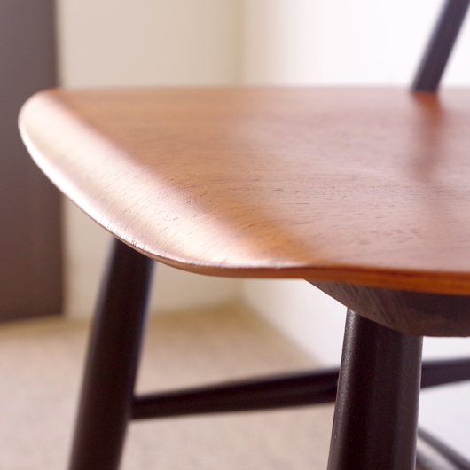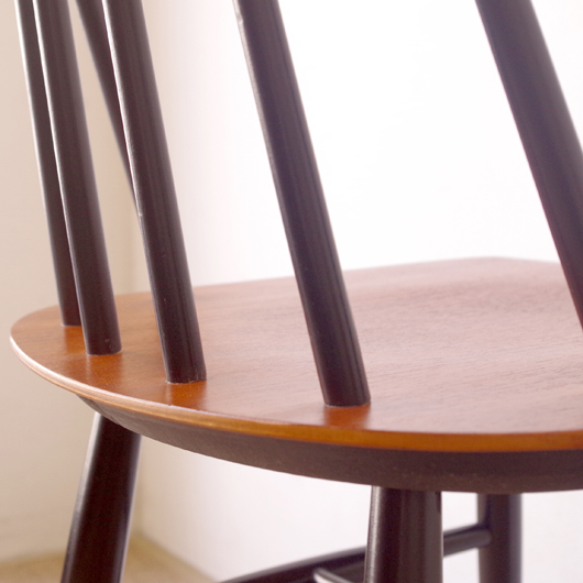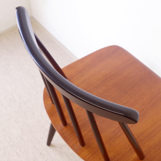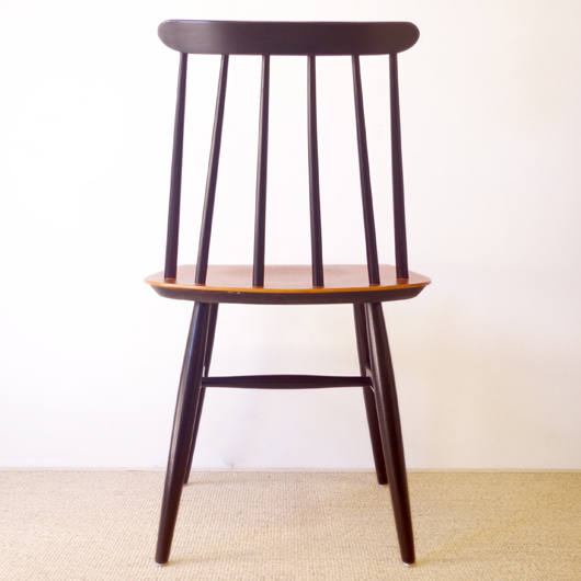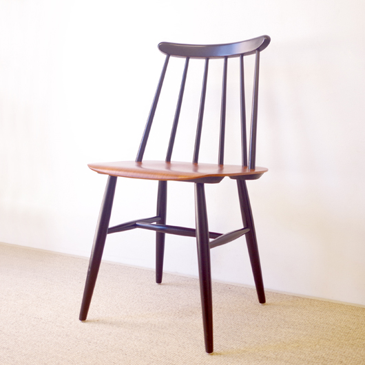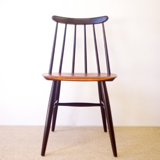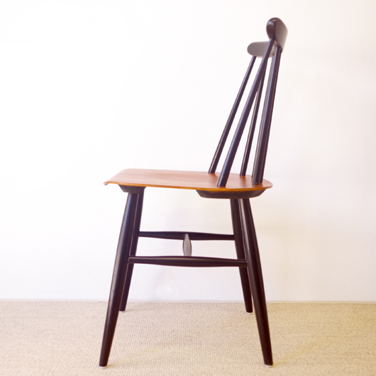 イルマリ・タピオヴァーラが1955年にデザインしました、スウェーデンEDSBY VERKEN社製のFanett Chair55Tです。絶妙な角度の付いた6本のスポークがふわりと背を支えてくれる、シンプルながら計算された構造となっています。そして座面はお尻の部分にくぼみがつけられていたり、膝裏の当たる部分は緩やかなアールを描いていたりと、座り心地もよく考えられていることが分かります。 座面はナチュラルな木目を生かし、その他フレームはブラックで引き締めるという、色のコントラスを効かせたデザインが印象的です。 タピオヴァーラのデザインしたチェアの中でも特に人気があり、復刻されていないためにヴィンテージでしか手に入らないモデルとなります。特にこちらは裏面の刻印により1950年代製と、とても初期のものとなります。 丁寧な修復を施しまして、全体的にとても綺麗な状態です。わずかに打ちキズなどございますが、雰囲気を損ねない程度かと思います。詳しくは画像にてご確認ください。