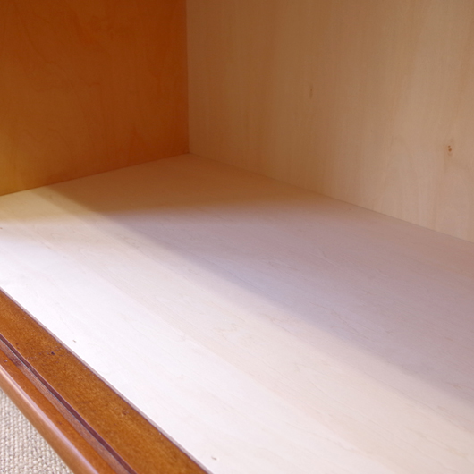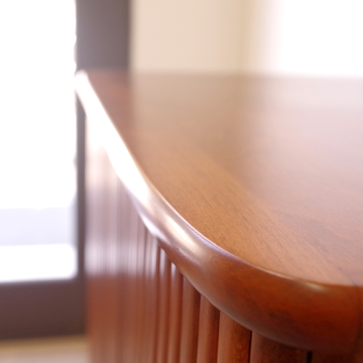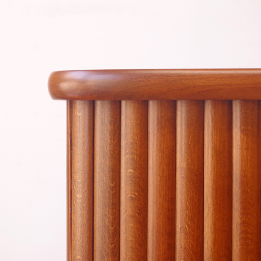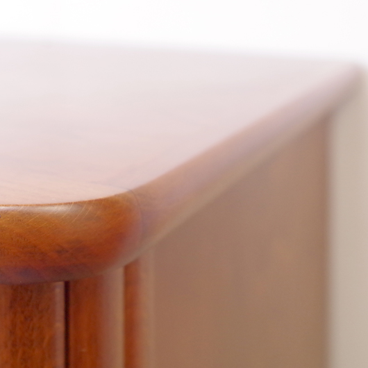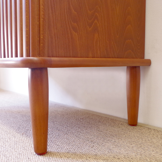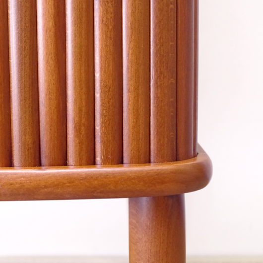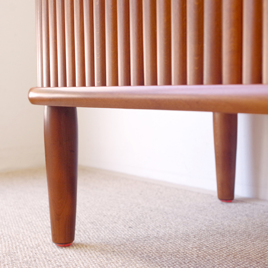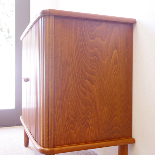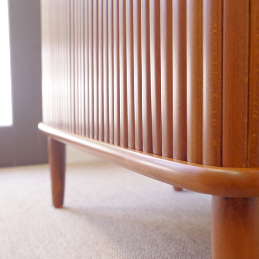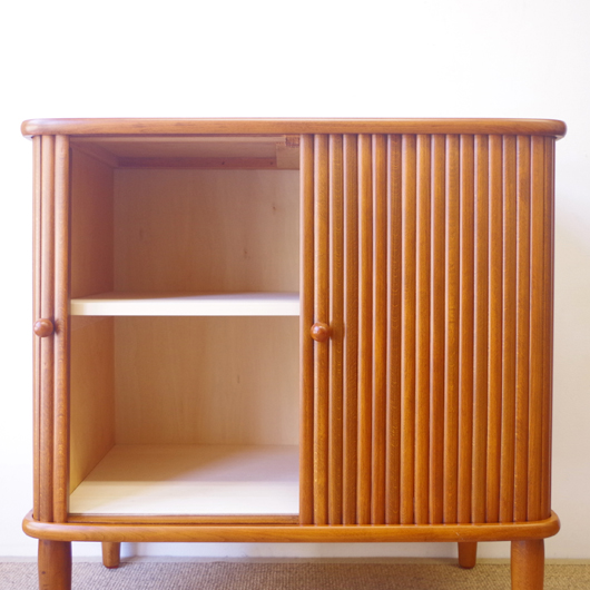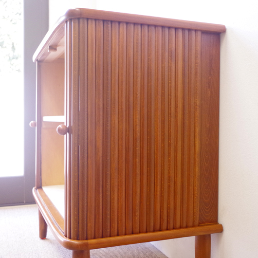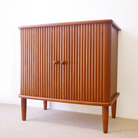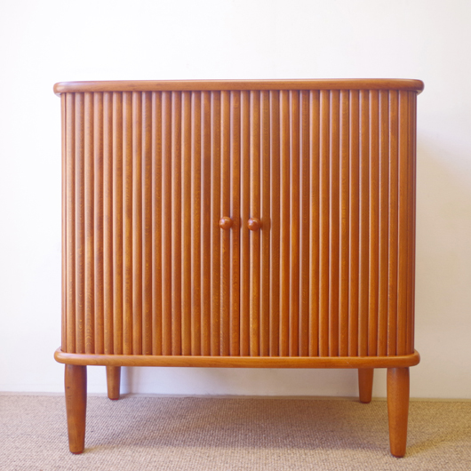 1960年代デンマーク製のヴィンテージ ロールフロントキャビネット。前面の扉がロールフロント(蛇腹)式となっており、置いておくだけで絵になる北欧らしいデザインです。内部は棚板が1枚付いており、取り外し可能です。現在では作る職人も減っている蛇腹構造はどこか懐かしさを感じ、日本のご家庭にもよく合うかと思います。 リビングや寝室などに置いて、雑然となる生活用具をさっと収納するキャビネットとして場所を問わずに活躍してくれそうです。天板にはお気に入りの雑貨や当番などを飾って、自分らしいワンコーナーを作ってはいかがでしょうか。 丁寧な修復を行いまして、全体的に非常に綺麗な状態です。背面や棚板、底板も交換しましたので、清潔にお使いいただけます。詳しくは画像にてご確認ください。