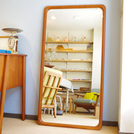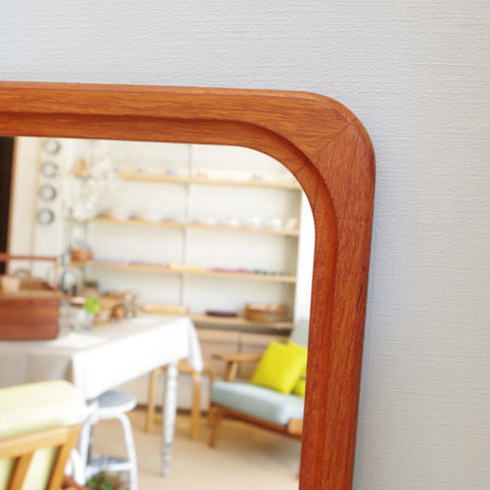1960年代の壁掛けミラーです。 フレームはチークの無垢材を使用しております。 ずっしりとした重量がございますので、床置きにして姿見として活用するのもおすすめです。