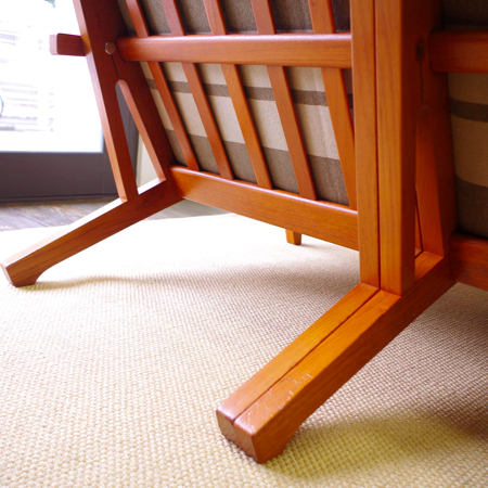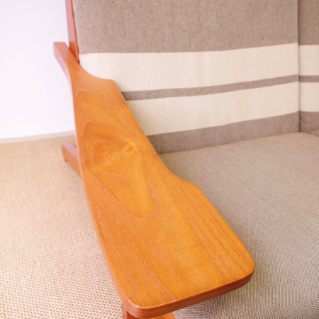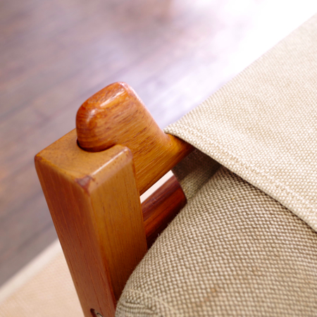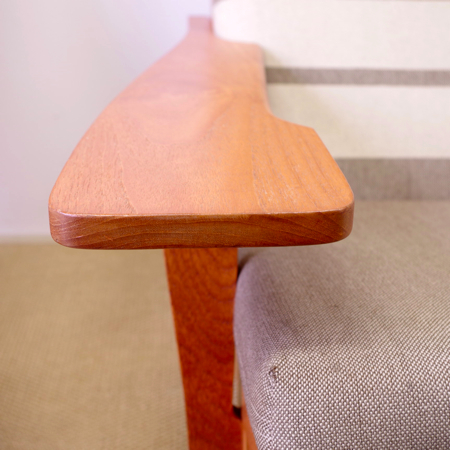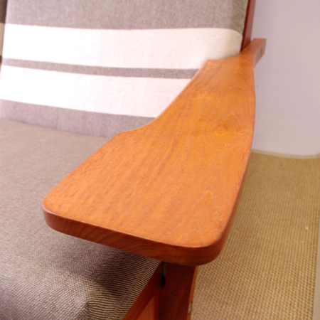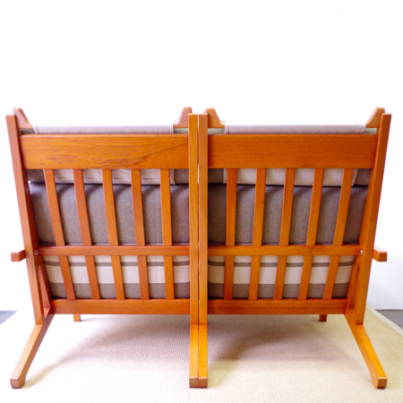 1969年発表ハンス・J・ウェグナーのデザインによる、現在もGetama社のラインナップに残る名作ソファ「GE375」です。 座の延長が後脚になるウェグナーの得意とする構造で、背と座の角度が深いためゆったりと身体を預けることができます。また水平に付けられたアームの先が広くなっているため、コーヒーカップなどを置いて読書をしても素敵です。 中央の連結金具を外すだけで簡単にセパレートし、1台の両側にアームを付けることで両アームの1人掛とアームレスの1人掛というスタイルでの使用も可能になります。 現行品ではオーク材でしか作られていないため、チーク材を用いたものはヴィンテージ品のみで、全体的に目立ったキズなどのないとても綺麗な状態です。