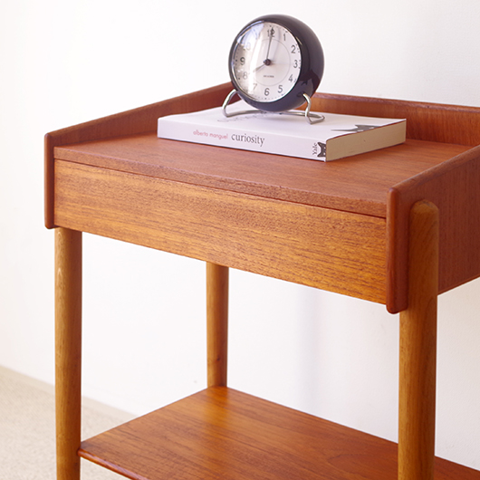 ボーエ・モーエンセンが1950年代初頭にデザインしました、Soborg Mobler社製のサイドチェストModel.148。チーク材の本体にオーク材の脚部と、色味の異なる2種類の樹種を使用したコントラストが美しい一台です。丸みのある円柱の脚部を側面に見えるように取り付け、シンプルゆえに際立つさり気ないデザインにモーエンセンらしさを感じます。そして天板の両脇が後方斜めに上がり、3方向に立ち上がっているため、繊細な照明なども安心して置くことができそうです。 元々ベッドサイド用に作られたものですが(下記【参考資料】欄にて、同シリーズのベッド合わせた様子を掲載しています)、ソファの脇に置いてサイドテーブルのように使用したり、リビングの片隅で文具や印鑑を収納したりと、様々な用途が考えられます。 丁寧な修復を行いまして、綺麗な状態です。引出しの底板も交換済みのため、清潔にお使いいただけます。詳しくは画像にてご確認ください。