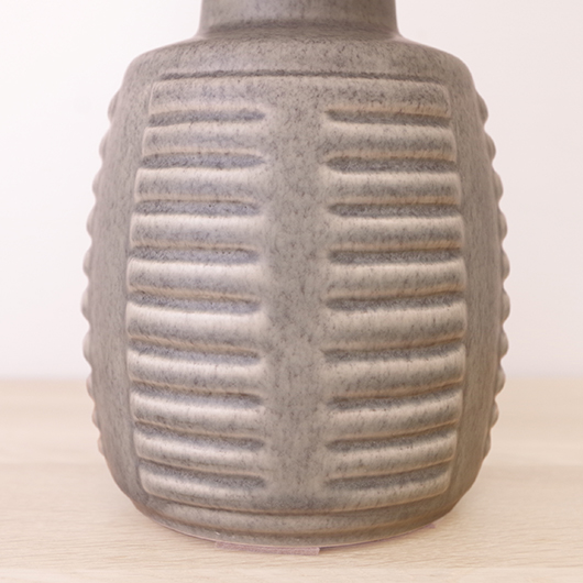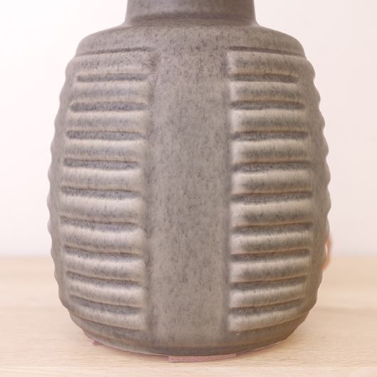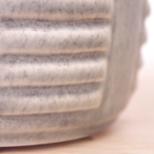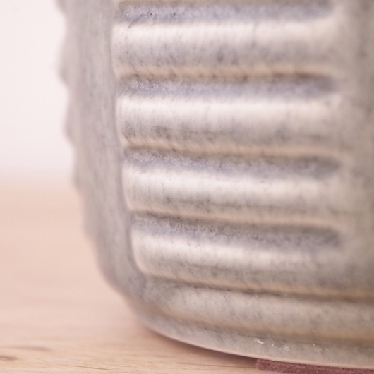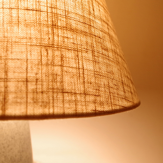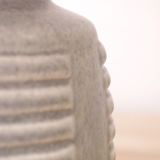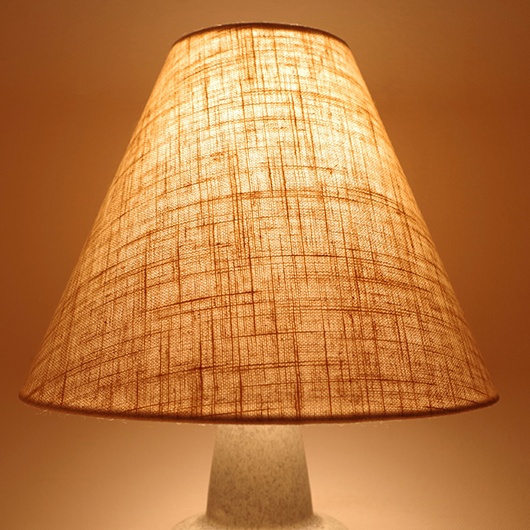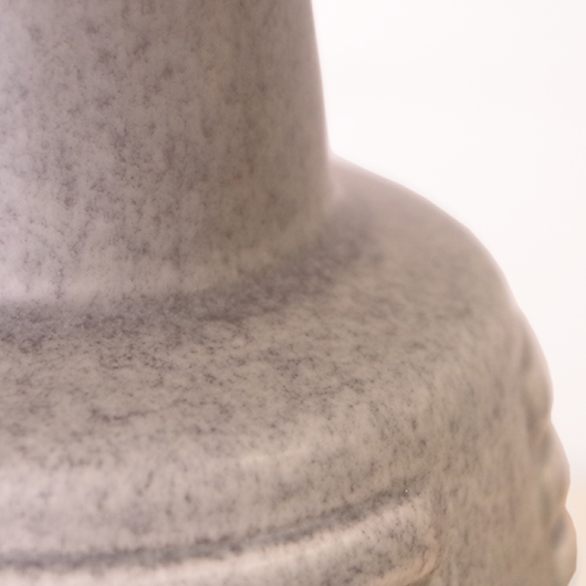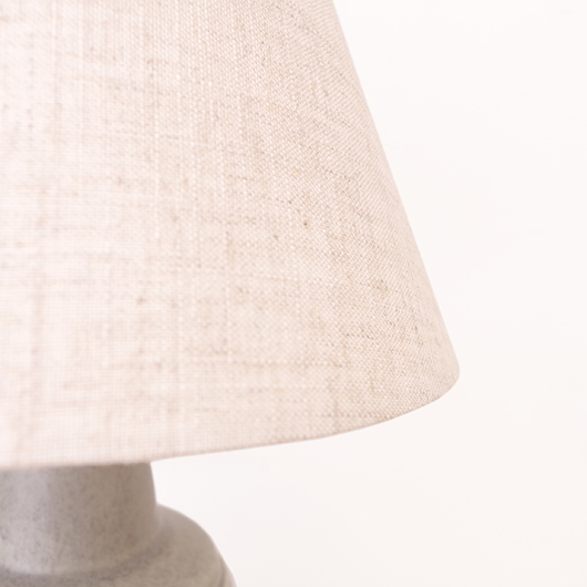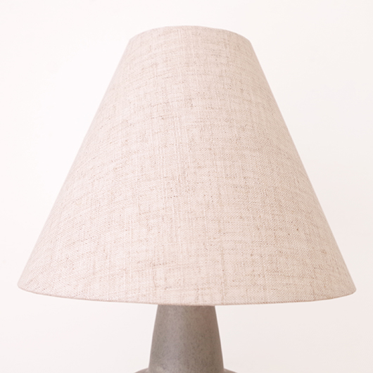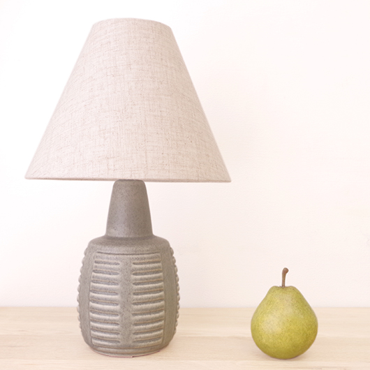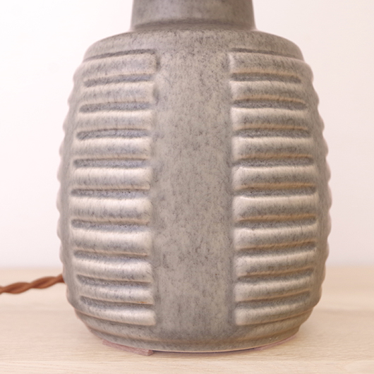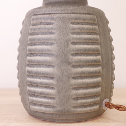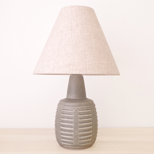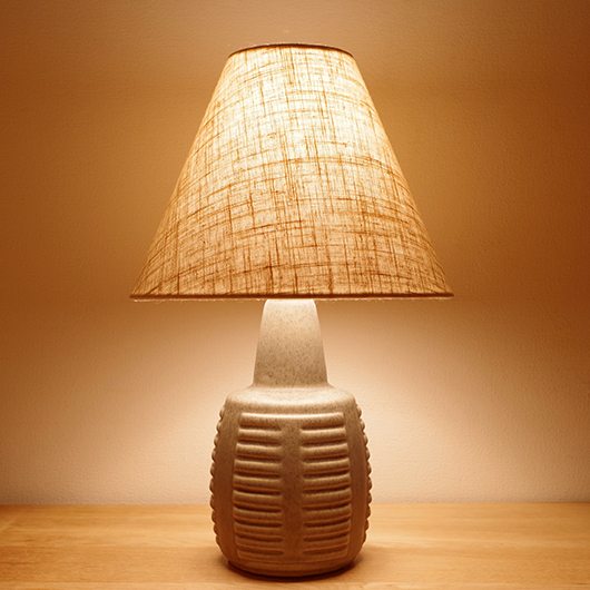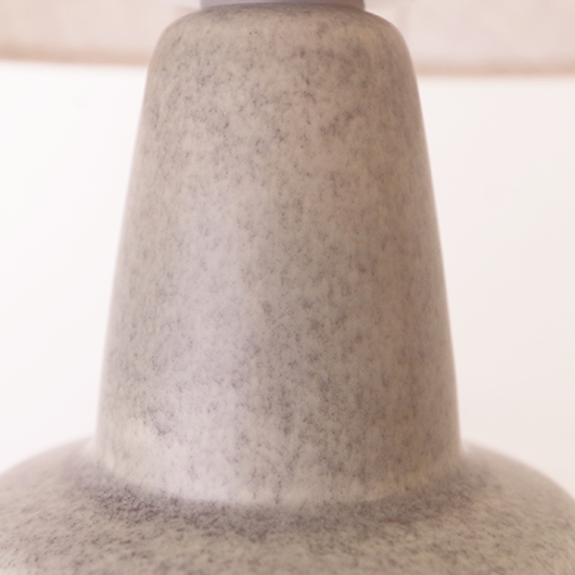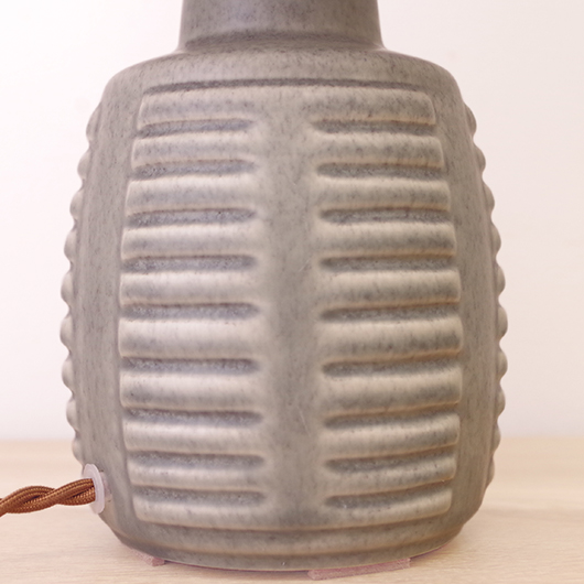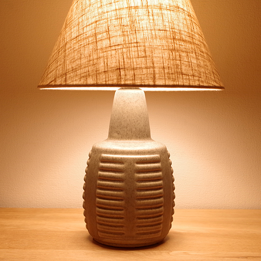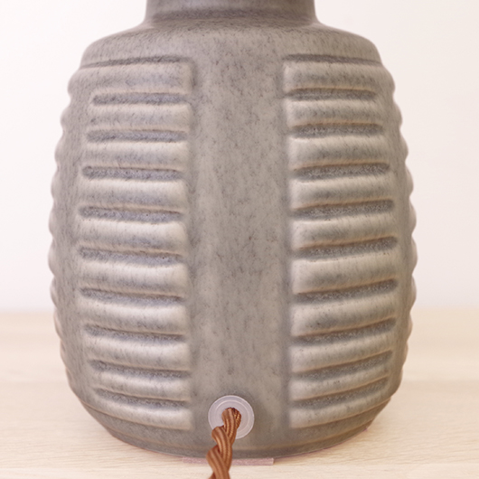 1835年にデンマークのボーンホルム島に窯を開いた、Soholm窯の陶製ベースを用いたヴィンテージ テーブルランプです。ぷっくりと膨らんだ本体には幾何学模様が刻まれています。そのはっきりとした凹凸により変わる釉薬のかかり具合によって色のグラデーションを作り出し、明かりを灯した際にまた違った表情を見せてくれます。和のテイストにも通じるようなグレーグリーンの釉薬は、きりりとした青の釉薬を得意とするこの窯の作品の中で珍しい色合いです。ほっこりとした雰囲気は、お部屋の程よいアクセントになるのではないでしょうか。 シェードは本体の形が美しく見えるように国内にてオーダーしたもので、明かりを灯すとリネン地の風合いがまた違った表情を作り出してくれます。新しく交換したコードなども、ヴィンテージの風合いに合うデザインをセレクトました。 電気工事士の資格を持つ職人によりソケット・コード・プラグ等の電気に関わる部分は全て交換しまして、電気用品安全法に基づいた点検なども行いPSEマークを表示しておりますので、新しいもの同様に安心してご使用いただけます(詳しくは下記をご覧ください)。