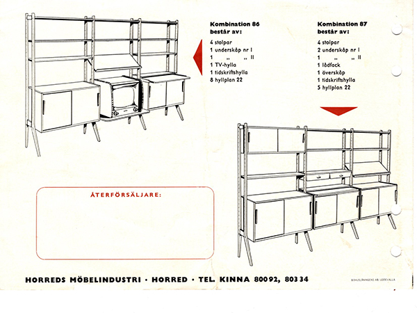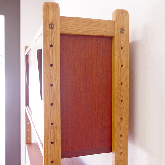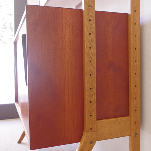 こちらは発売当時に販売店舗で配られていた広告。必要なパーツと支柱を組み合わせて作る、セミオーダーのようなシェルフだったことが伺えます。パーツには今回のシェルフに用いた棚板や大小引き戸の引き出しのほかに、テレビ台やデスク仕様になる天板などもあったのですね。