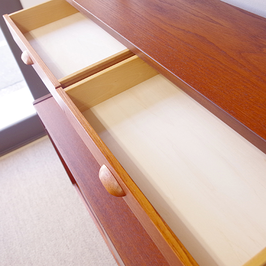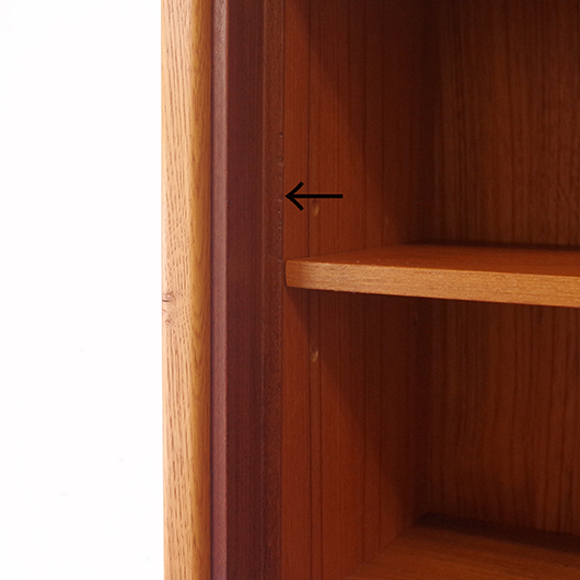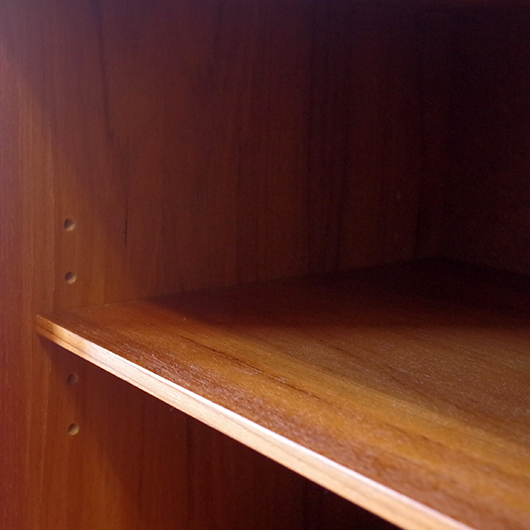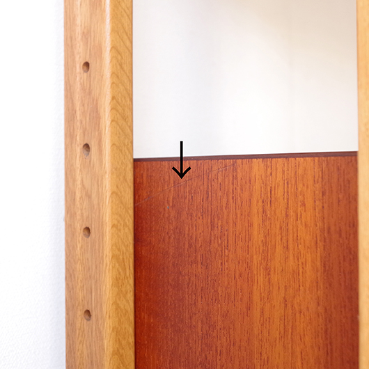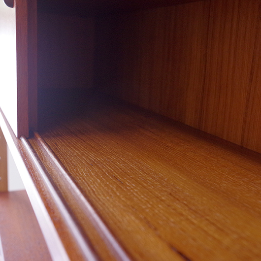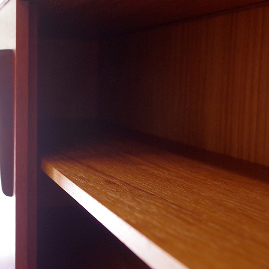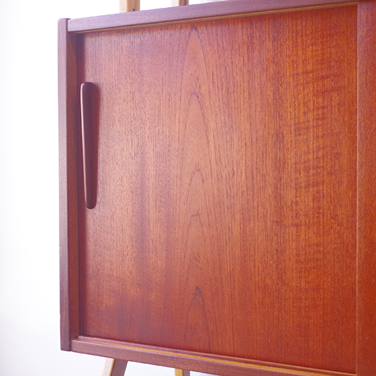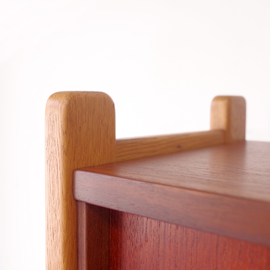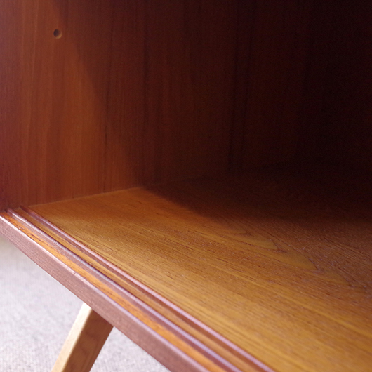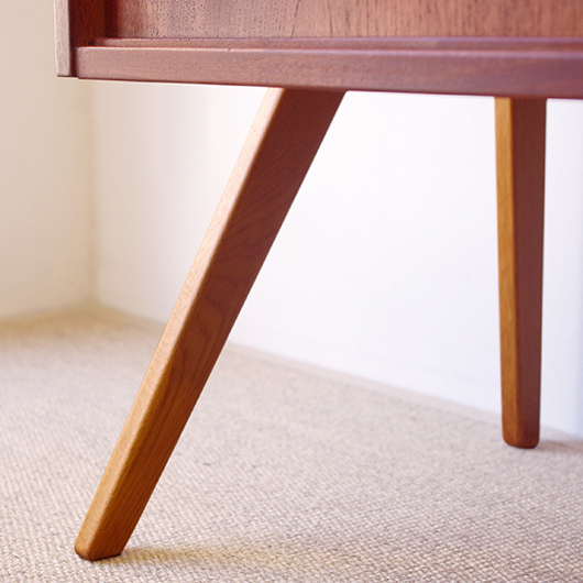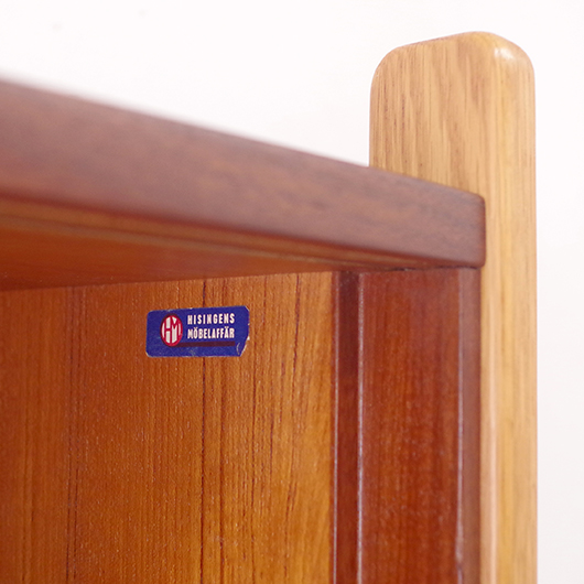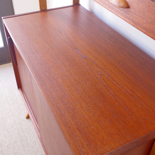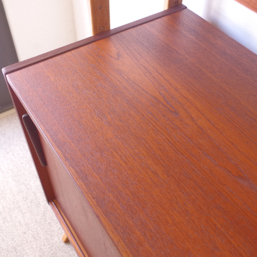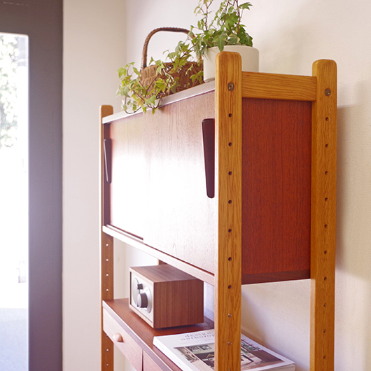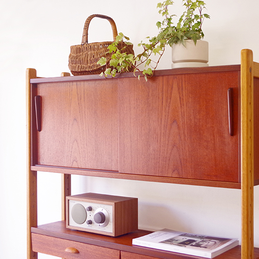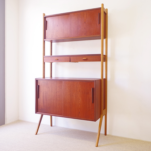 1960年代スウェーデンHorreds Möbelindustr製、Picasso serieのヴィンテージオープンシェルフ。引き違い戸の付いた収納部が大小一つずつと棚板1枚を、側面から2本の支柱で支えております。本体はチーク材、フレームはオーク材と、色味の異なる木材のコンビネーションが非常に軽やかに感じます。天板の下に小引出しが2杯備わった棚板はあまり見かけることのない作りで、コロンと丸みを帯びた取っ手もデザインのアクセントとなっています。下側の収納部を開けると棚板が1枚備わり、可動式のため便利にお使いいただけます。背面が抜けていることで圧迫感がなく、斜めに伸びる脚部が伸びやかな印象を与えてくれます。 飾り棚や食器棚など、それぞれの暮らしに合った使い方が考えられます。背面が抜けているためオーディオ機器などを置いた際の配線処理もスムーズに行えます。見せる収納と隠す収納を上下で使い分けて、すっきりと部屋を見せるのに一役買ってくれそうです。 丁寧な修復を施し、全体的に綺麗な状態です。わずかな小キズなどはございますが、雰囲気を損なう程ではないかと思います。詳しくは画像にてご確認ください。
