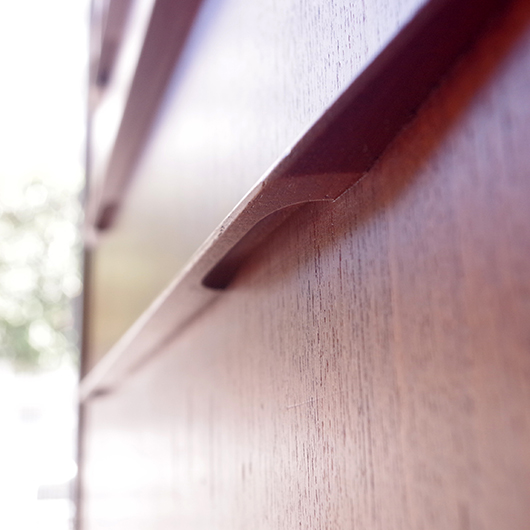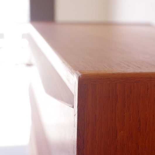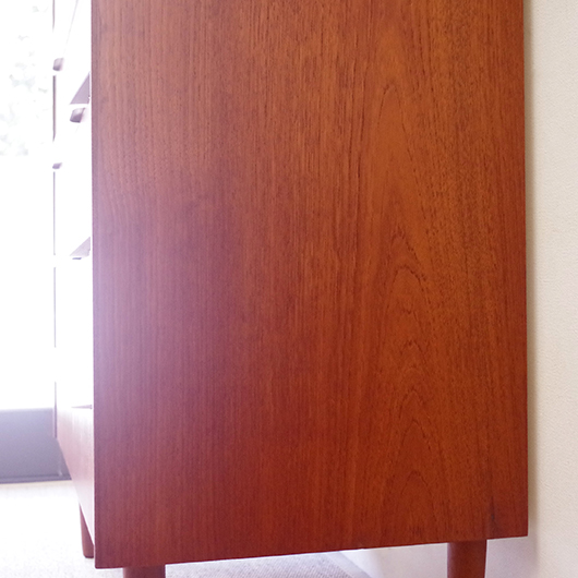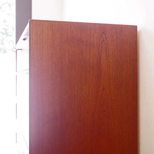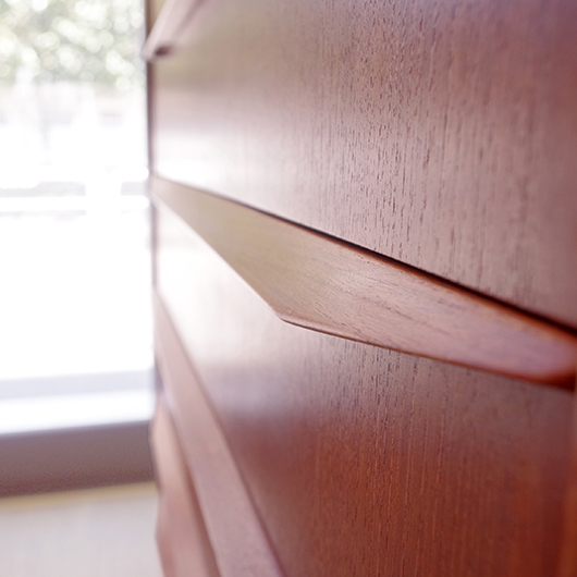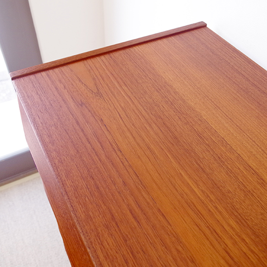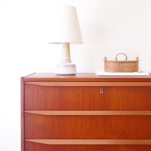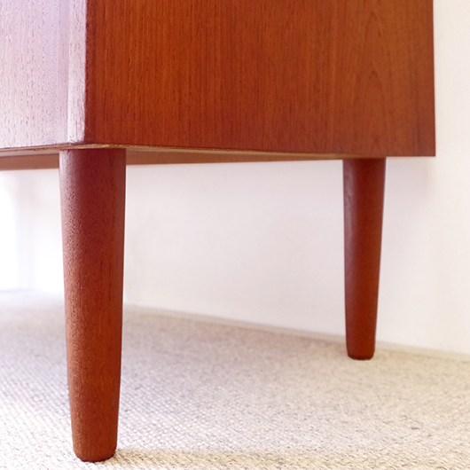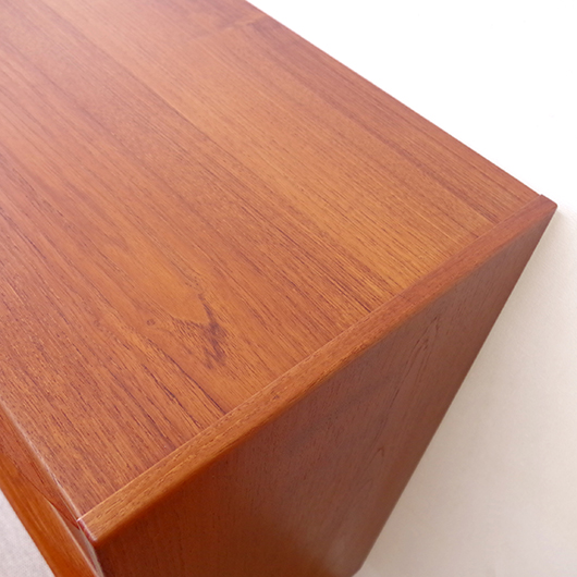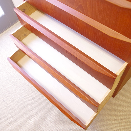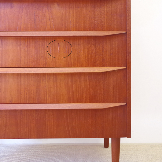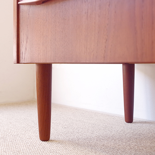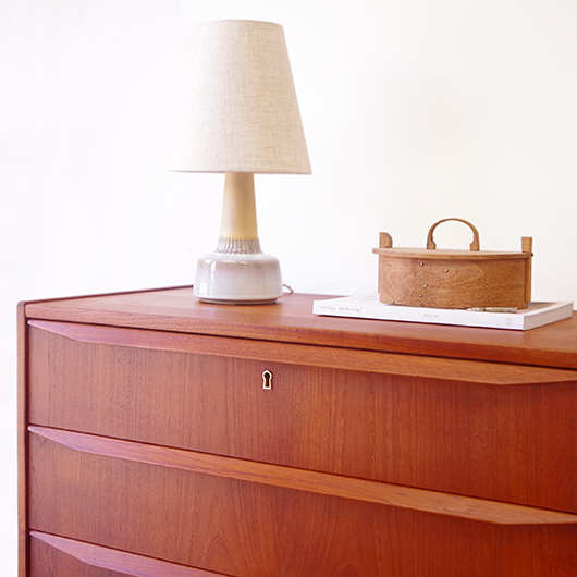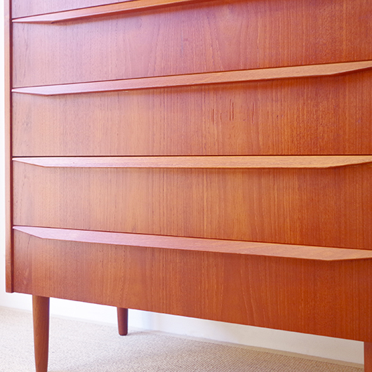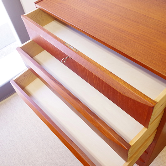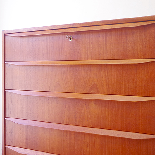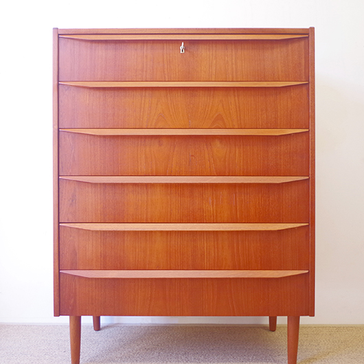 1960年代デンマーク製の、ヴィンテージ鍵付6段チェスト。引出しの縁に沿って付けられた厚みのあるチーク無垢材の取っ手は指掛かりも良く、バータイプですっきりとした印象を与えてくれます。また正面から見て上下に揃った杢目も、丁寧に作られたデンマーク製のヴィンテージらしさのひとつです。 確りとした収納力を備えており、衣服などをたっぷりと収納していただけます。そして高さも程よく広い天板には、小物をディスプレイしてお楽しみいただけます。また引出しの最上段には鍵が付属しておりますので、貴重品などの保管にも良さそうです。 丁寧な修復を行いまして、全体的に綺麗な状態です。引出しの底板は全て新しく交換しておりますので、清潔に気持ち良くお使いいただけます。正面のまるで示した箇所に、キズがございます。木目に沿ったものであることと普段視線のいかない下方のため、気にならない程度かと思いますが、それを考慮したお値段となっております。詳しくは画像にてご確認ください。