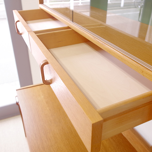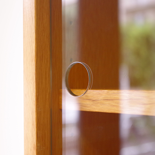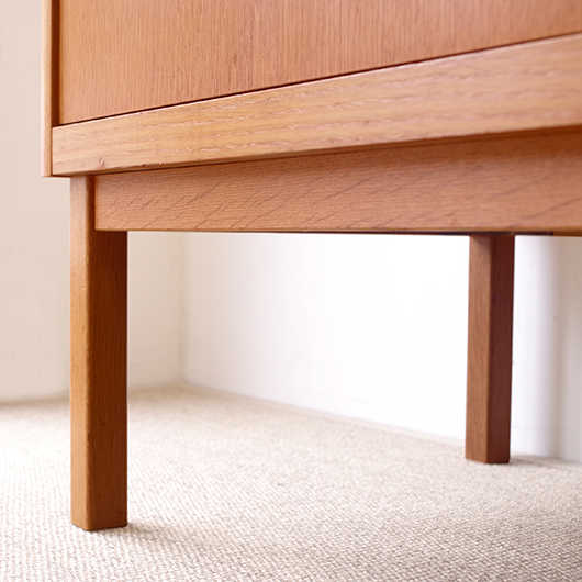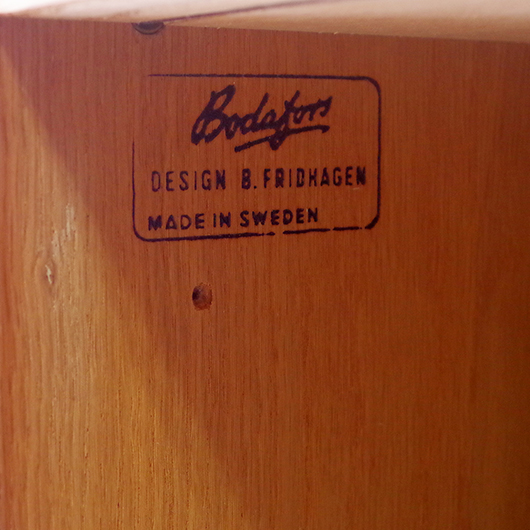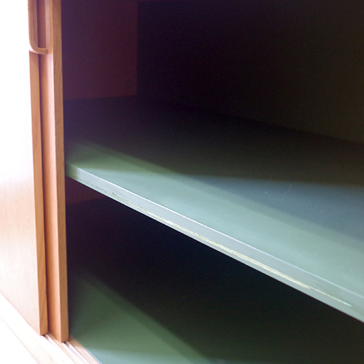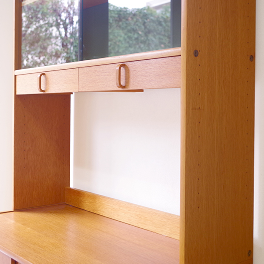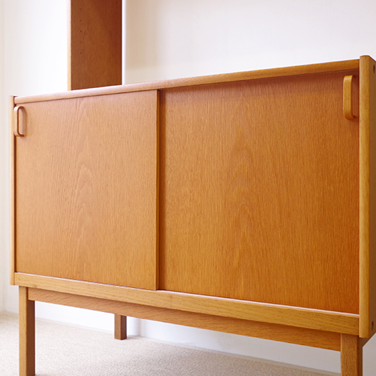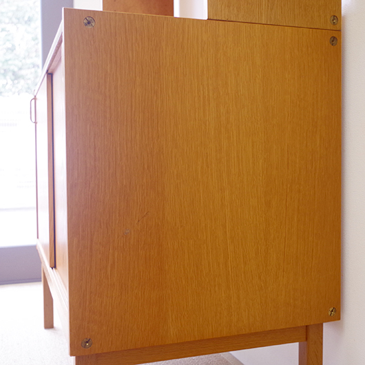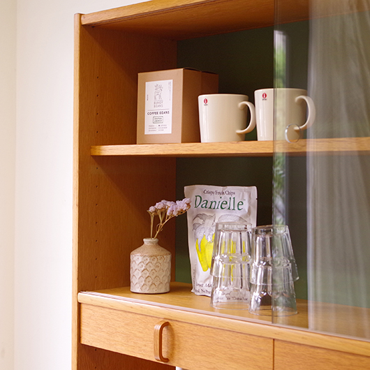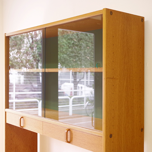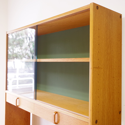 Bertil Fridhagenがデザインしました、スウェーデンBodafors製のヴィンテージ カップボード。上部にはガラス扉付の棚と小引き出し、オープンスペースを挟んで下側は収納部となっています。上部背面はスウェーデンらしいスモーキーグリーンのペイントが施され、全体の雰囲気を印象深いものにしています。本体の樹種であるオーク材の色味との相性も良く、北欧らしい雰囲気の差し色がアクセントとして効いています。 上下に分けて見せる収納、隠す収納と組み合わすことができる利便性の高い一台です。また背板の抜けた部分は高さもあるため、電子レンジやオーディオなどを置くことができ、さらに後ろから配線を逃がすなど現代の生活に合った食器棚ではないでしょうか。 丁寧な修復を行いまして、全体的に良好な状態です。全体に取りきれない小キズや棚板の経年感などがございます。雰囲気を損ねない程度のものですが、それらを考慮したお値段となっております。詳しくは画像にてご確認ください。