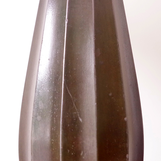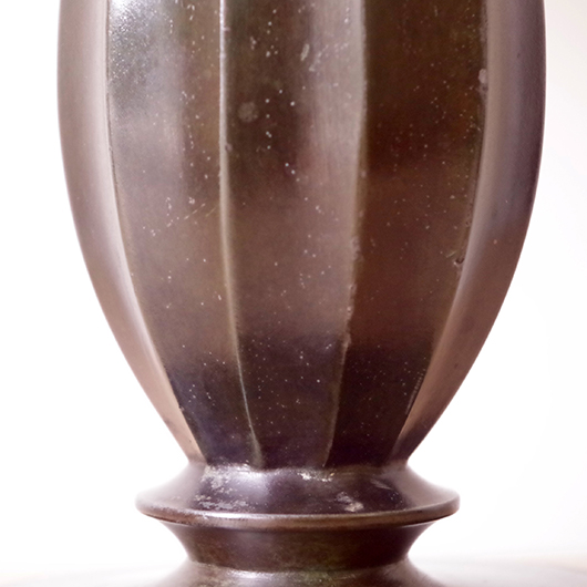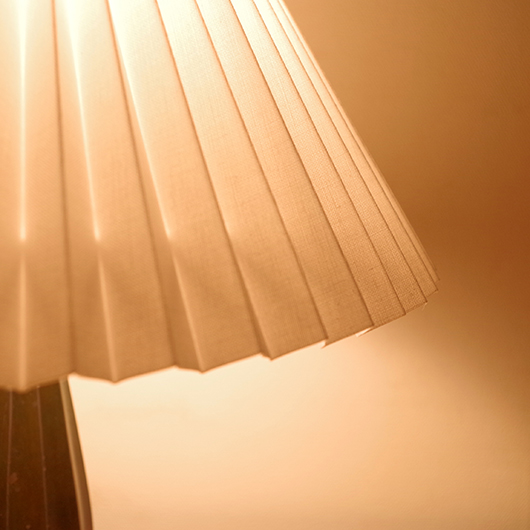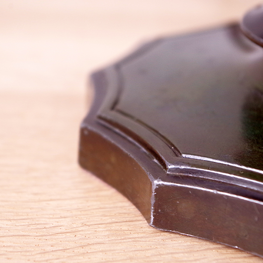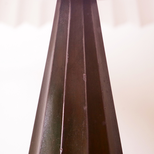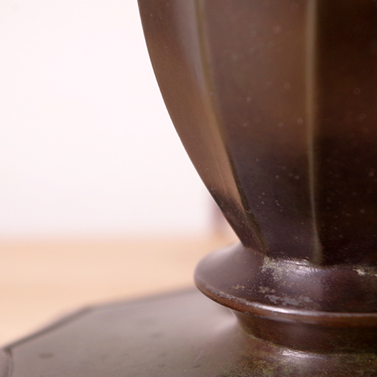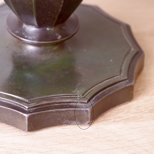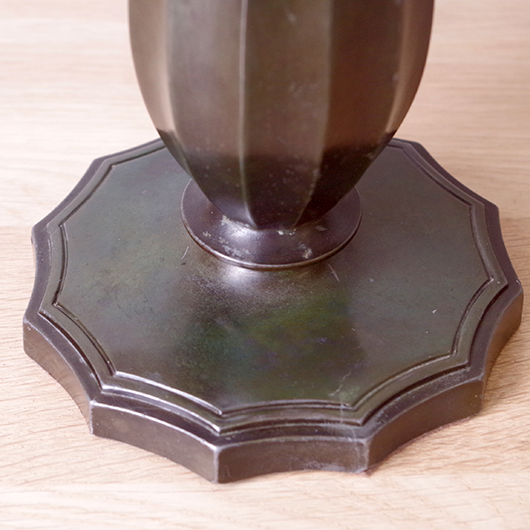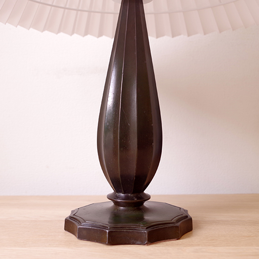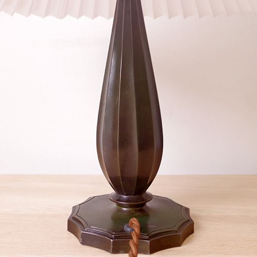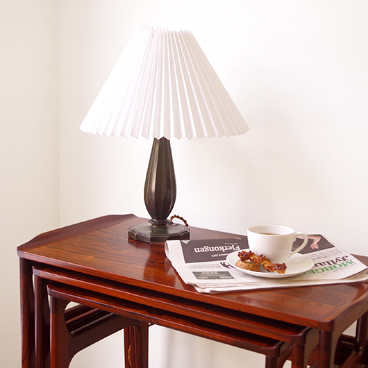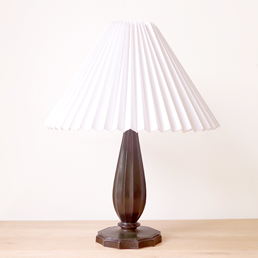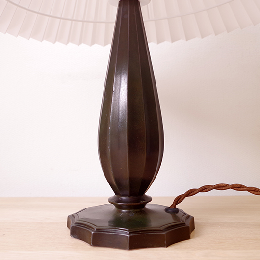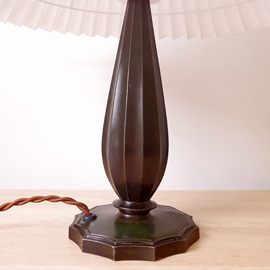 20世紀初頭に活躍したデンマークの銀細工師・装飾彫刻家であるJust Andersenのデザインによるテーブルランプ。凛とした佇まいの小ぶりながらに存在感があります。素材であるDisko metalは自身の開発した鉛とアンチモンの合金で、生まれ故郷であるグリーンランド(デンマーク領)のディスコ湾にちなんで名付けられました。そのわずかに深緑を帯びた色味は、金属でありながらどこかぬくもりを感じるものです。暗く厳しい長い冬のお供に生まれた、北欧ならではの素晴らしい作品ではないでしょうか。デンマークではこのような小ぶりなサイズのランプは出窓などにも置かれているのをよく見かけます。 合わせたシェードはデンマーク製の新しいもので、光を灯すとプリーツが美しい陰影を作り出してくれます(一部不規則なプリーツ箇所は、製品クオリティとしてご了承ください)。新しく交換したコードなども、ヴィンテージの風合いに合うデザインをセレクトました。 電気工事士の資格を持つ職人によりソケット・コード・プラグ等の電気に関わる部分は全て交換しまして、電気用品安全法に基づいた点検なども行いPSEマークを表示しておりますので、新しいもの同様に安心してご使用いただけます(詳しくは下記をご覧ください)。 丁寧に修復等を施し、綺麗な状態です。わずかに支柱部分に傾きが見られますが、角度により気づくか気づかないか程度のものです。ベース部分に落下による思われるクラックが入っております。使用には問題のないごく小さなものですが、それを考慮したお値段となっております。詳しくは画像にてご確認ください。