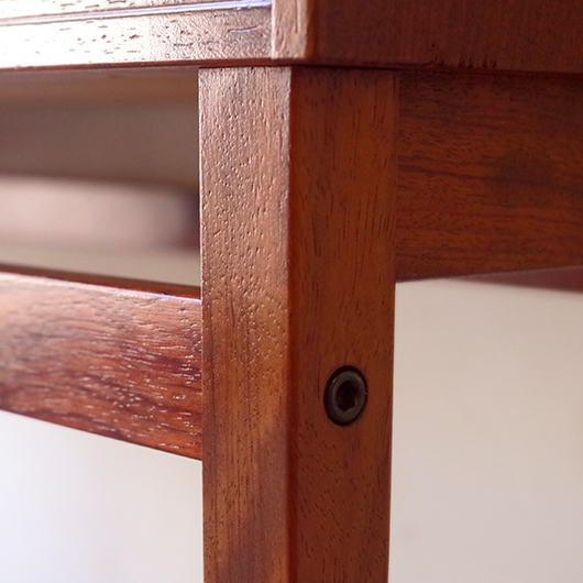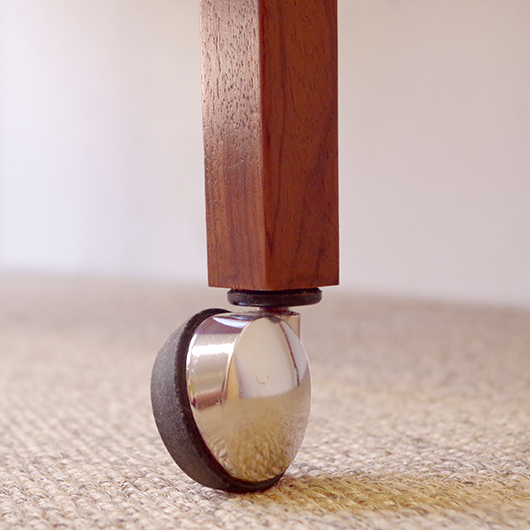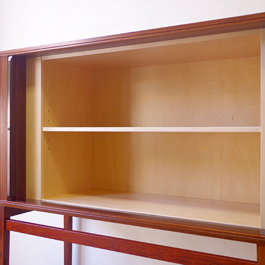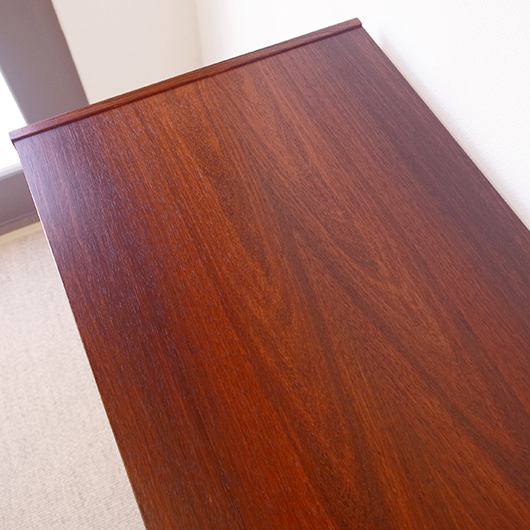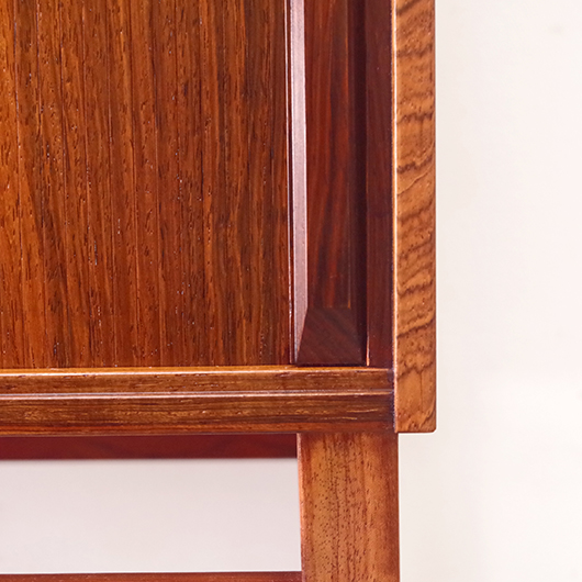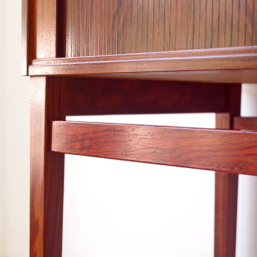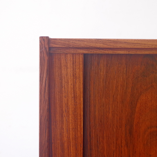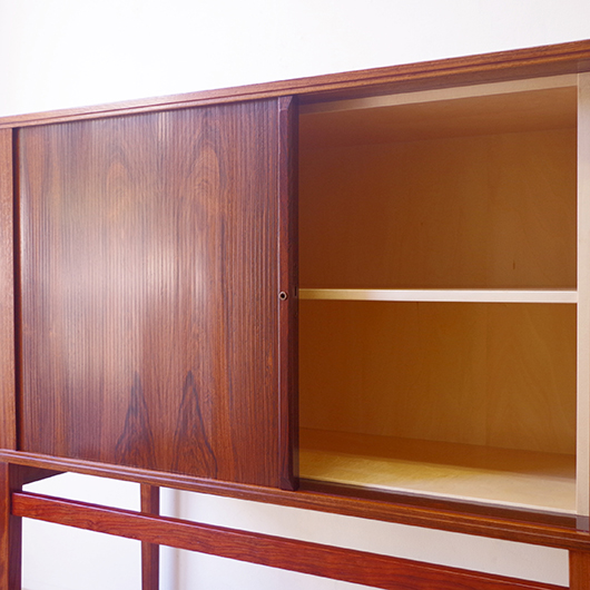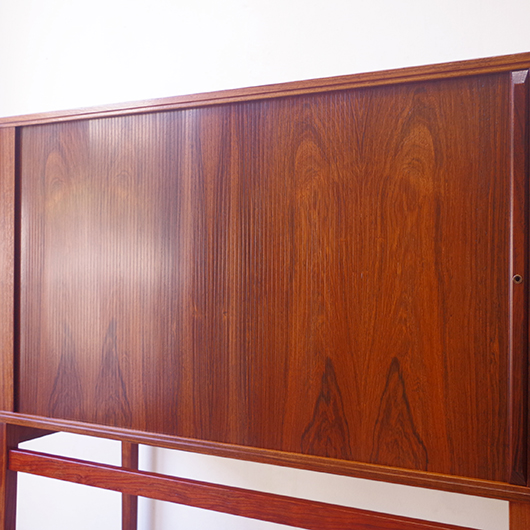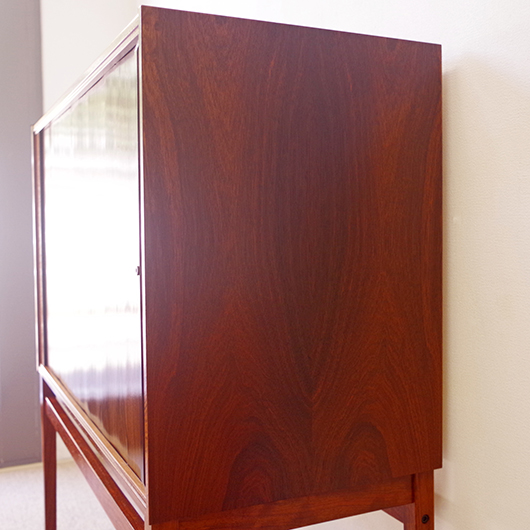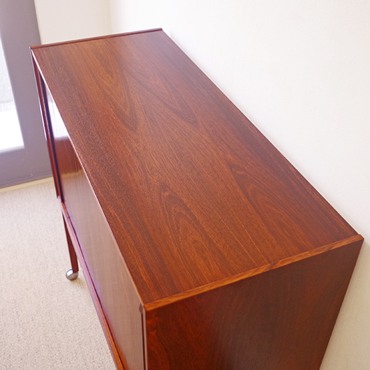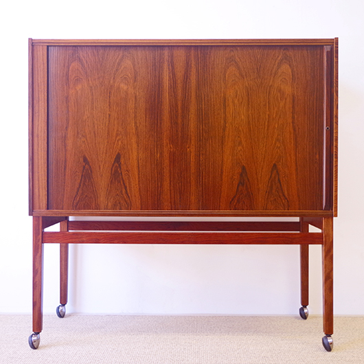 1950〜1960年代デンマーク製のヴィンテージ キャビネット。正面からよく見ると細かなスリットが入っており、取っ手を横に引くとクルクルと側面に回り込む蛇腹式の扉となっています。近くで見ても分からないほどのスリットに、高度な技術が伺えます。すっきりとした脚部の先にはキャスターが付いており、モダンで洗練された印象に仕上げられています。素材にはワシントン条約のレッドリストに入っている希少な高級木材であるローズウッドが用いられ、その見事な木目を堪能できます。 元々はブラウン管テレビを収納するために作られていたもののようですが、今回は現代の暮らしで使いやすいように、可動式棚板の付いた収納部としてキャビネット内部を新たに造作しております。同様のデザインで作られていたものではオーディオメーカーBang & Olufsen社があり、今回の品もデザインや作りなど非常に似ておりますが、古い資料では調べきれませんでした。 本体は全体を丁寧に研磨をした後に再塗装を行い、自然な艶の非常に綺麗な状態です。詳しくは画像にてご確認ください。