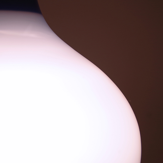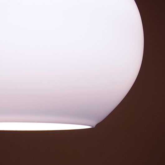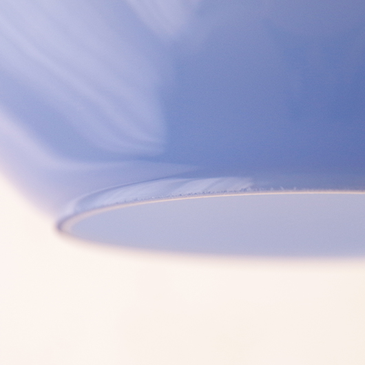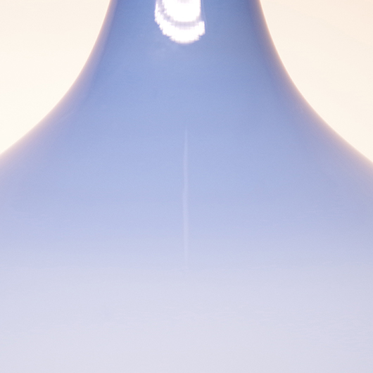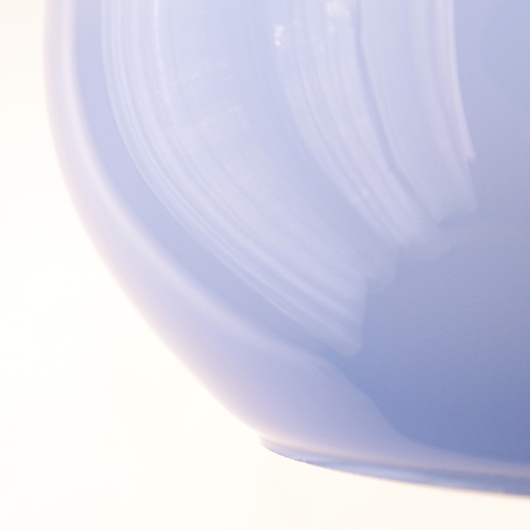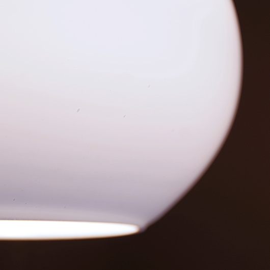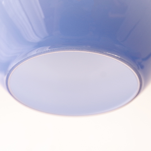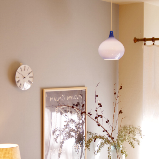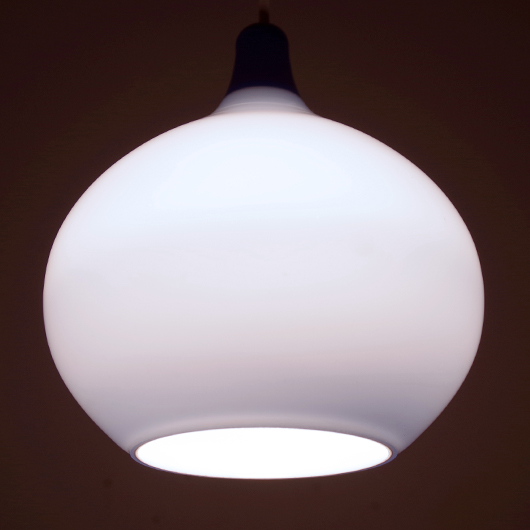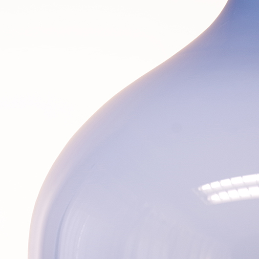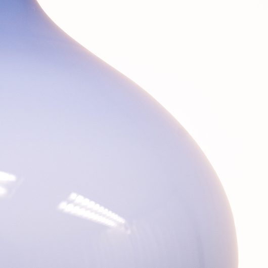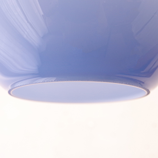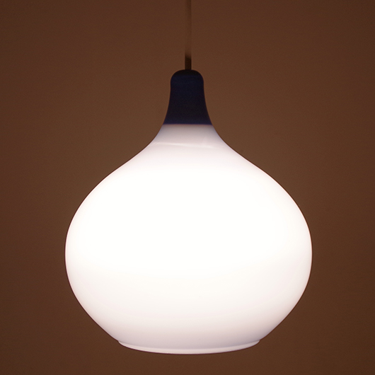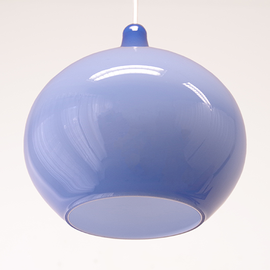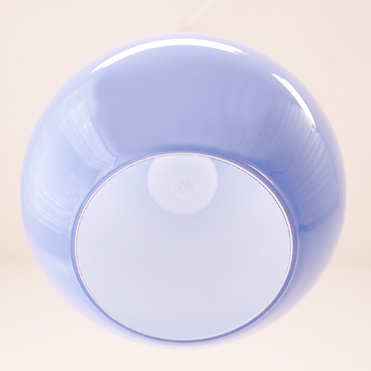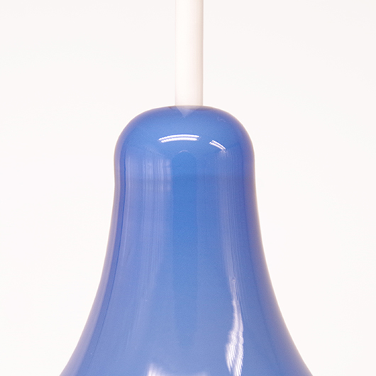 デンマークのKemp&Lauritzen社とノルウェー最古のガラスメーカー1762年創業のHadeland Glassverkが製造しました、Winding&Wrightデザインのヴィンテージペンダント。ホワイト色ガラスの上にライトブルーのガラスを重ねて熔着する、内被(うちき)せガラス技法で作られています。内側の白い面に光源が当たるため、光を灯した際に外側のガラスの色が影響しないようです。まろやかで白みがかったブルーとラベンダー色の中間のような、何ともつかない微妙で美しい色合いです。日中はその色味を、そして明かりを灯した際は雫のような有機的なフォルムをお楽しみいただけることと思います。 ダイニングテーブル上部に象徴的に掛けるほかにもサニタリールームや玄関など、省スペースでの使用にも良さそうです。古い資料を読むと、ライトブルーの他にオレンジとレッドの3色で作り、一軒家やアパートメント、レストランやホテルなど、様々な場所のコーナーを彩るようにデザインされたそうです。 電気工事士の資格を持つ職人によりソケット・コード・プラグ等の電気に関わる部分は全て交換し、電気用品安全法に基づいた点検なども行いPSEマークを表示しておりますので、新しいもの同様に安心してご使用いただけます(詳しくは下記をご覧ください)。全体的に綺麗な状態です。詳しくは画像をご確認ください。