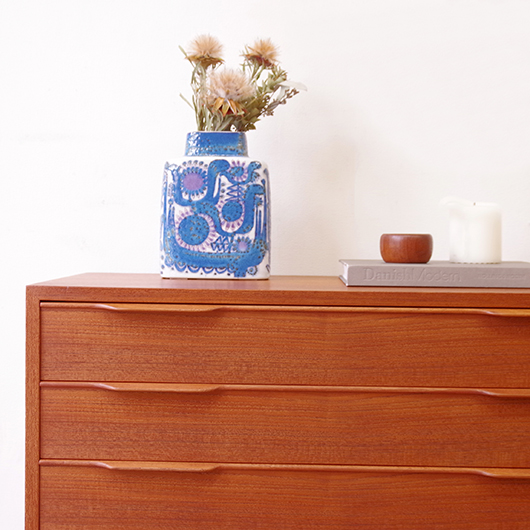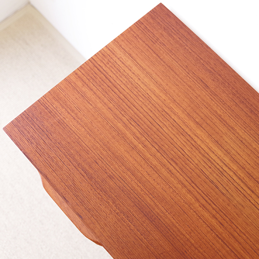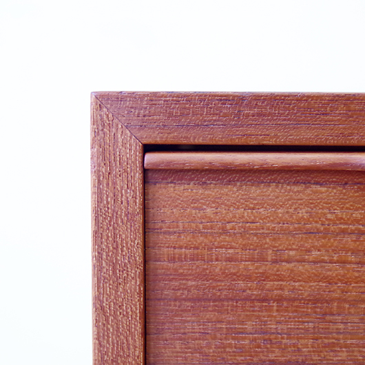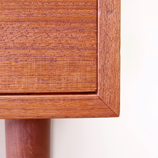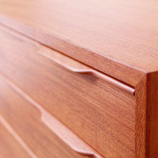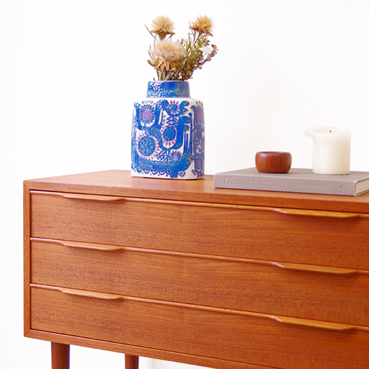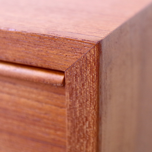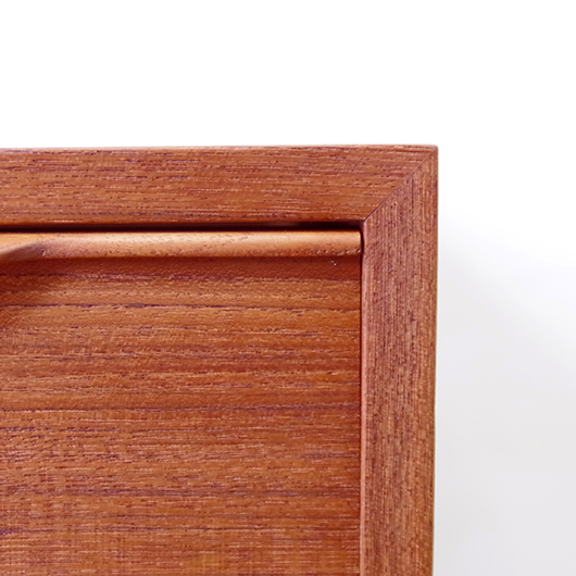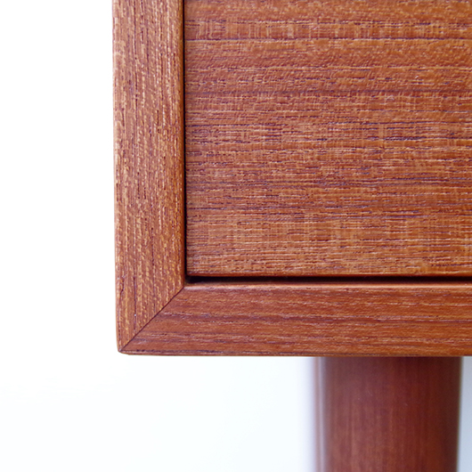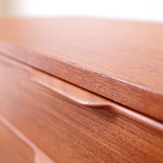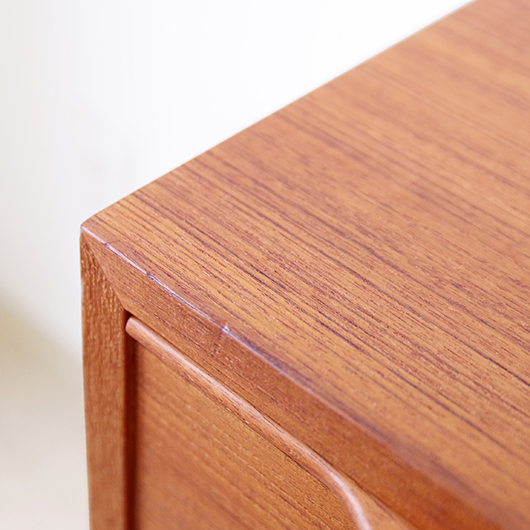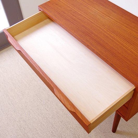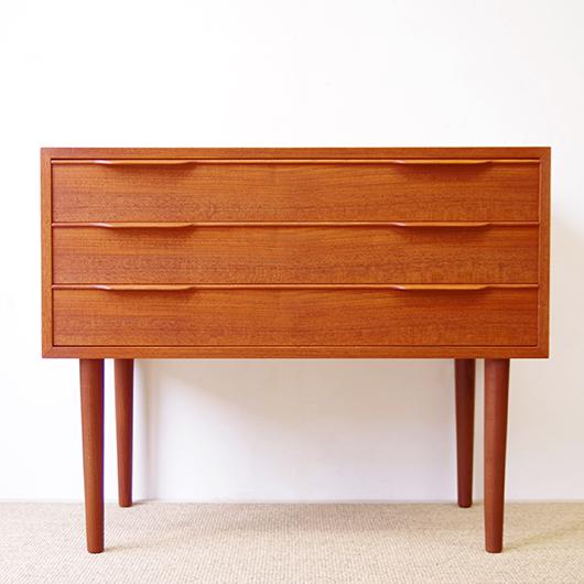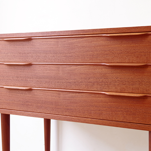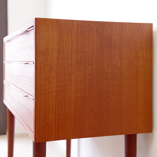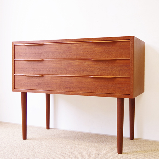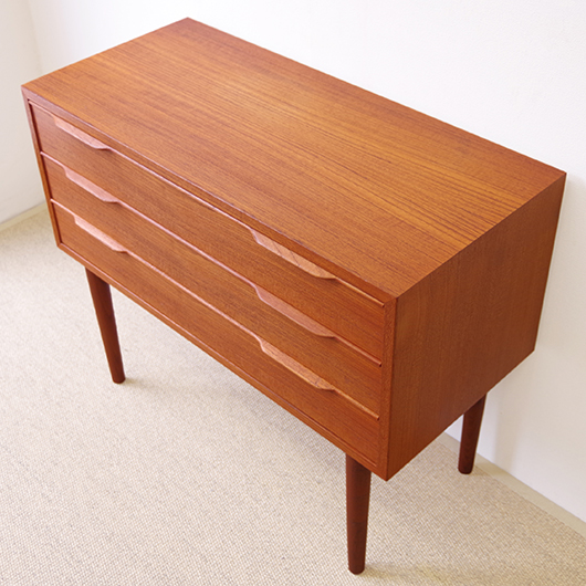 1960年代デンマーク製のヴィンテージ3段チェスト。引出しの縁に沿って付けられたチーク無垢材を丁寧に削り出した取っ手が印象的で、工芸的な美しさを感じます。そして横長のフォルムにすらりと伸びた脚部と、凛とした佇まいが目を引きます。 玄関やリビングなどに置いて、文具など細かなものを収納していただけます。また天板には小物や花瓶などをディスプレイしたり、お気に入りのワンコーナーを作ってはいかがでしょうか。程よい高さのため、上の空間にポスターや壁掛けミラーを合わせても良さそうです。 丁寧な修復を行いまして、綺麗な状態です。引出しの底板も新しい物に交換しておりますので、清潔にお使いいただけます。極僅かな小キズなど見られますが、気にならない程度と思います。詳しくは画像にてご確認下さい。