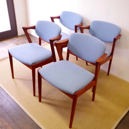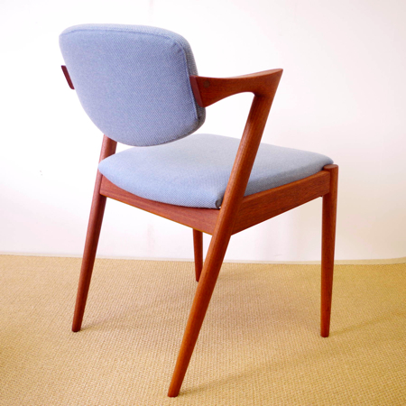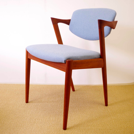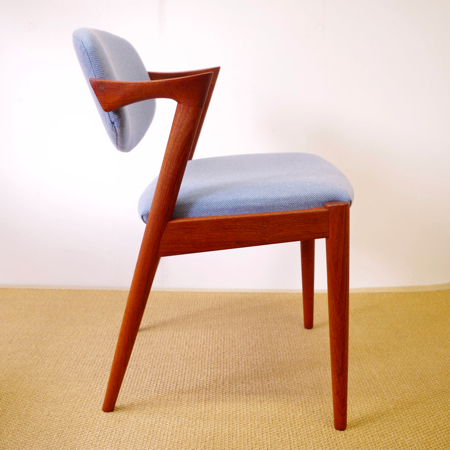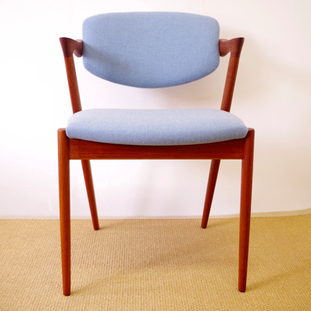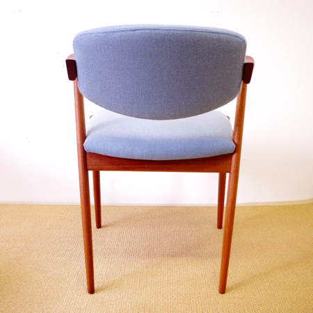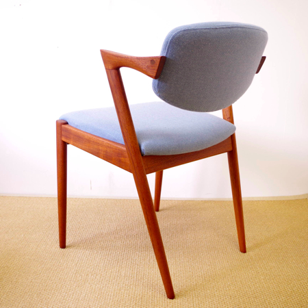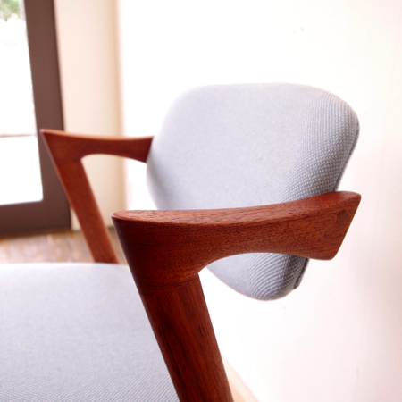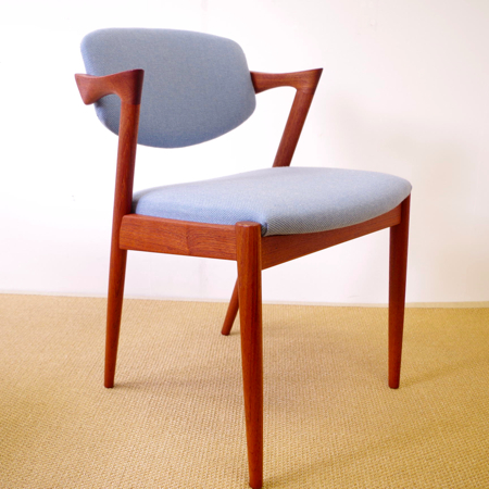 1950年代に活躍した家具デザイナーの一人、Kai Kristiansen(カイ・クリスチャンセン)デザインによるダイニングチェアNo.42のヴィンテージです。 背もたれからアームレスト、そして脚部へと繋がる美しいラインが特徴で、後ろ脚が少し内側にすぼまるデザインのため、テーブルに納めた時もすっきりとしています。 背もたれが身体に沿うように僅かに動くこと、そして肘が掛けやすい小さなアームと、デザインと座り心地の良さを両立させています。 小キズやスレががほとんどなく、とても綺麗な状態です。