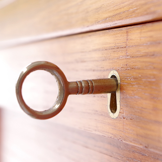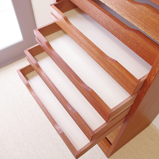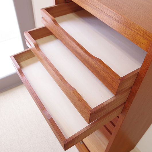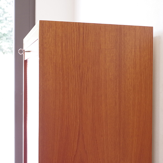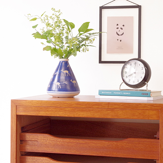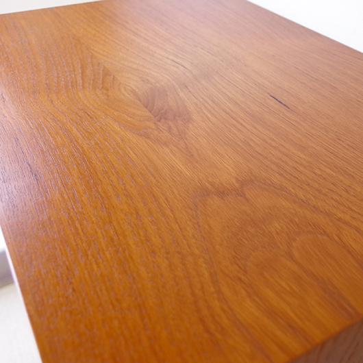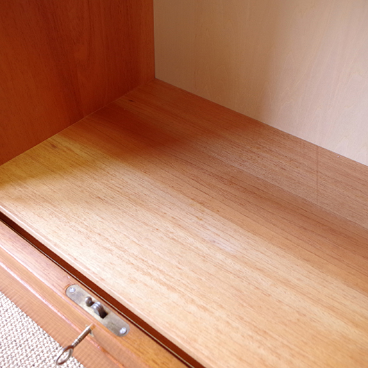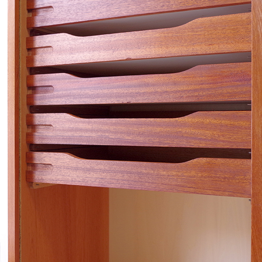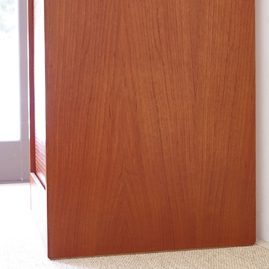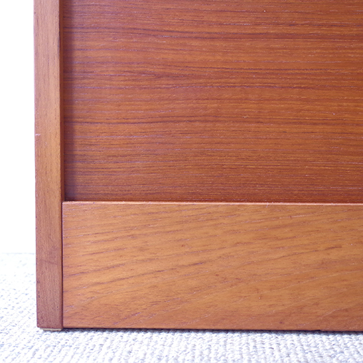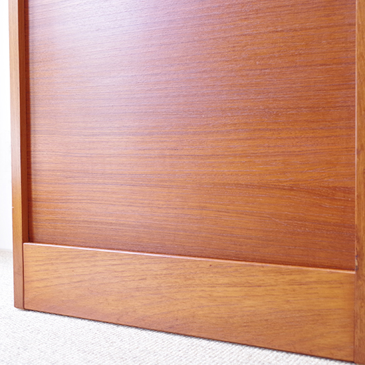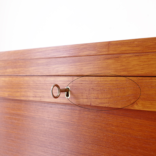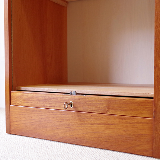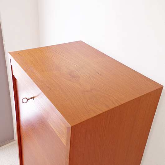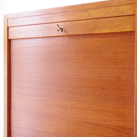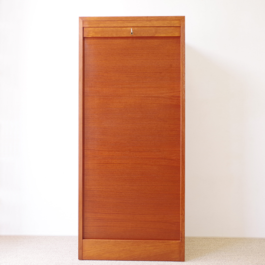 1960年代デンマーク製のヴィンテージロールフロントキャビネット。正面のチーク材の美しい木目をよく見ると細かなスリットが入っており、鍵を回すと下側にサッと巻き込まれていく縦型の蛇腹式扉となっています。近くで見ても分からないほどの細かなスリットは楽しい驚きを与えてくれるとともに、丁寧で高度な技術であることが伺えます。 内部は収納ケースが7段備わっており、それぞれネームタグ用のスリットが付いています。また下方にはケースのないオープン部分があるため、背の高いものなどを自由に収納していただけます。 扉を閉じた状態では花瓶などを置く花台など、天板上にお気に入りの小物をディスプレイして楽しめそうです。細かく仕切られた内部ケースには書類はもちろん、切り抜きや布などのコレクションなどを分かりやすく種分けする、実用的な一台として活躍してくれそうです(※収納ケースはA3が入るサイズです)。 丁寧な修復を施し、全体的にとても綺麗な状態です。背板や収納ケースの底板はすべて交換しておりますので、清潔にお使いいただけます。正面鍵付近などに小キズやスレなど見られますが、気にならない程度と思います。詳しくは画像にてご確認ください。