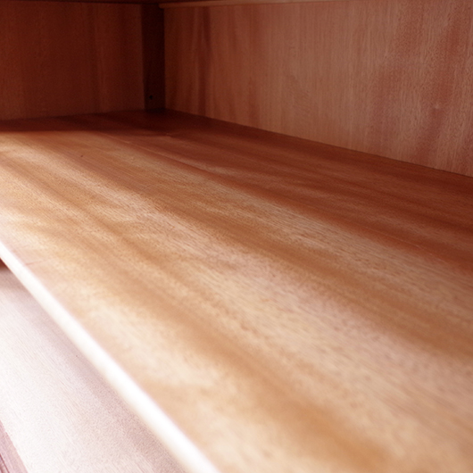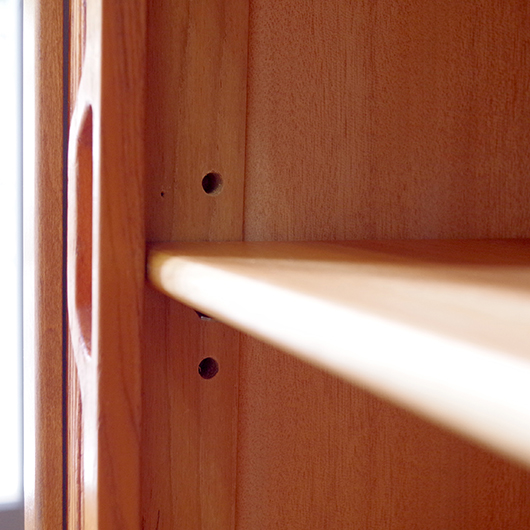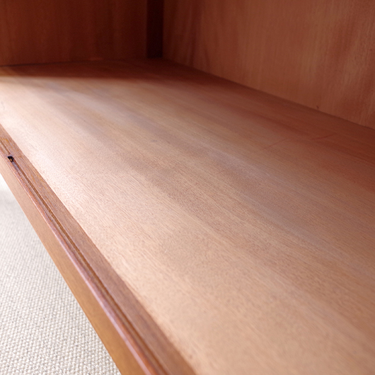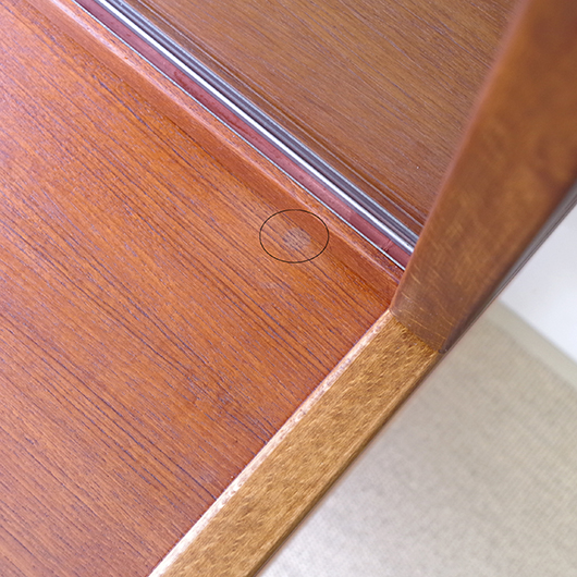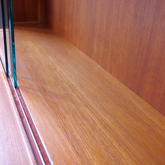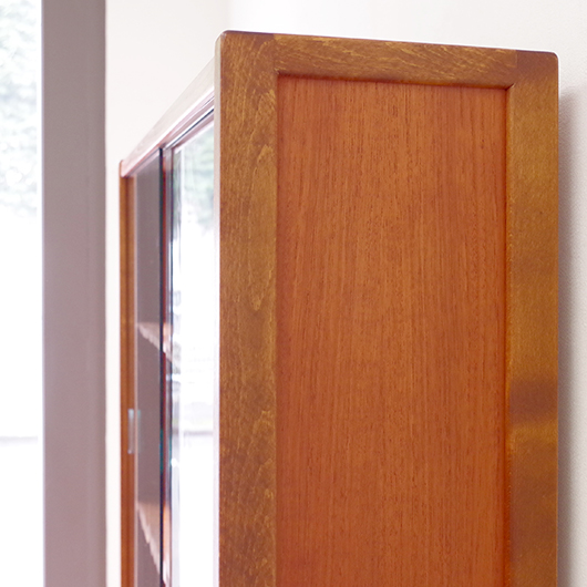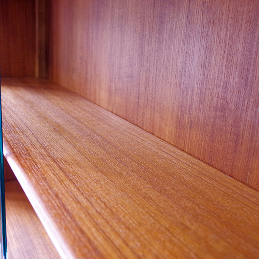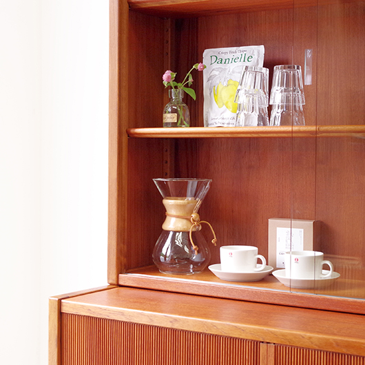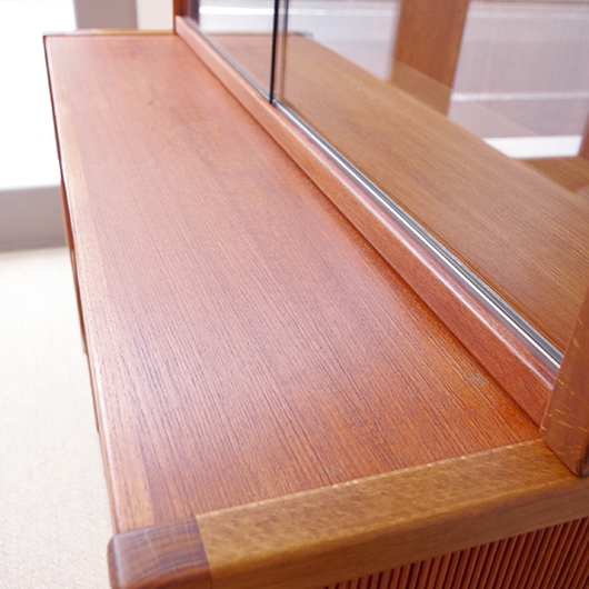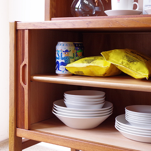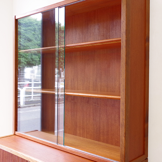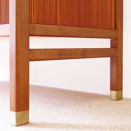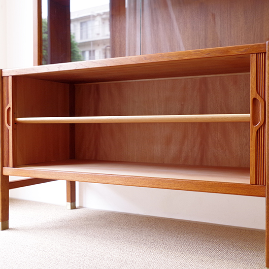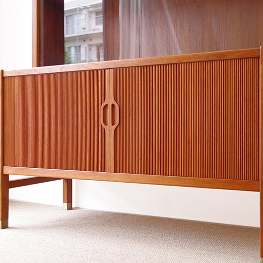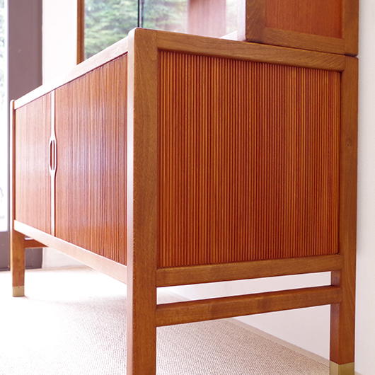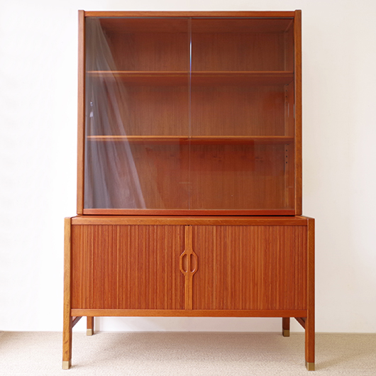 Carl-Axel Acking のデザインによる、1950年代スウェーデンBodafors製の蛇腹&ガラス扉式のキャビネット。上段はガラス扉の中に可動式の棚板が2枚、程よい奥行きで収納力もしっかりと備えています。この時代には扉を含め木材のみで構成された家具が多かったため、ガラスを合わせたキャビネットは当時の人々にモダンに映ったのではと思います。 一方の下段はこのキャビネットを特徴づけているロールフロント(蛇腹)式の扉。左右に扉を引くとクルクルと背面方向へ収まり、当時の職人の高い技術に驚かされます。一般的な蛇腹キャビネットの場合は側面部分は隠れている構造がほとんどで正面部分でしか蛇腹構造を確認できませんが、こちらは両側面まで見せる独創的な構造となっており、背面に回り込んでいく様は非常に見応えがあります。また中心にはチーク無垢材を贅沢にくり抜いた取っ手がつき、その素材感もお楽しみいただけます。扉内部にはこちらも可動式の棚板が1枚付属します。 脚先には真鍮製の靴下を履き、全体のエレガントな雰囲気を強調したデザインとなっております。セットバックした上段にガラス扉の組み合わせ、そして脚部の抜けなど、サイズの割りに圧迫感を感じさせないデザインもポイントのひとつかと思います。 リビングダイニングにて食器類を収納してカップボードとして、またリビングではたくさんの書籍を収納したりと、工芸的な美しさと実用性を兼ねた一台です。 丁寧な修復を施しまして、全体として綺麗な状態です。天板に角度によって見えるごくうっすららとしたシミ箇所など見られますが、まず気にならない程度かと思います。またガラスに小さなチップなど見られますが、ゆらぎのある古いガラスの雰囲気が非常に良いために、あえて交換をせずにオリジナルのままとしております。詳しくは画像にてご確認ください。