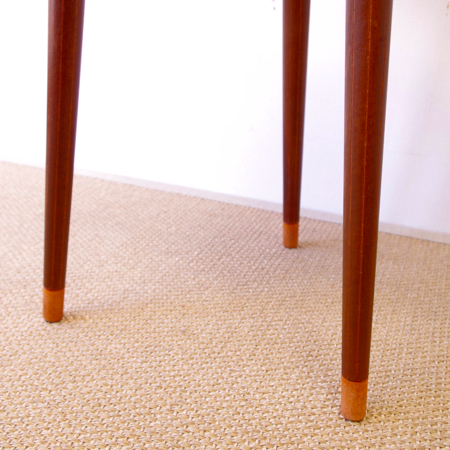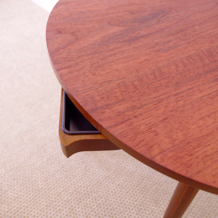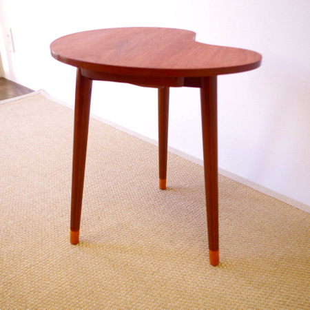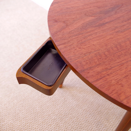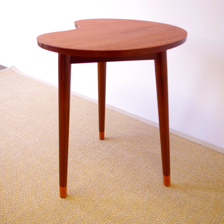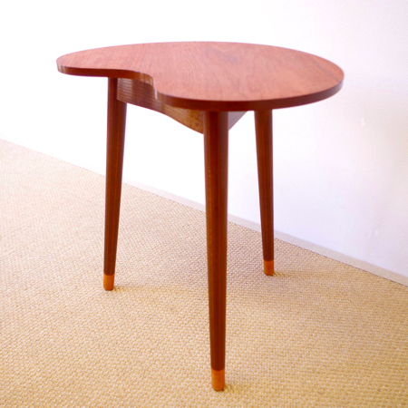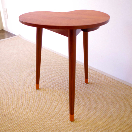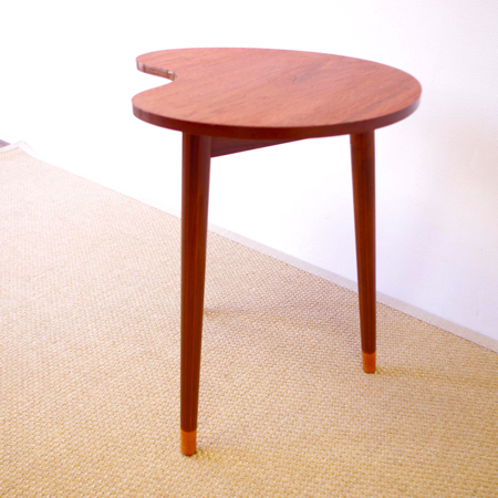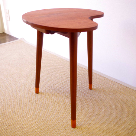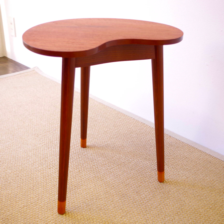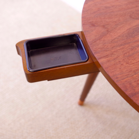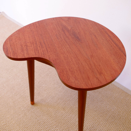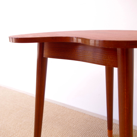 デンマーク製ヴィンテージビーンズテーブルです。 ころんと豆の形に似た天板が特徴的なサイドテーブルで、この形はただ可愛らしさのためではなく、凹みの部分をソファに沿わせるように置くことができる使い勝手の良さも考えられております。 天板下の幕板部分にはアシュトレイが隠されていて、すっとスライドさせるだけでお使いいただけます。脚部にも特徴があり、削り出されたストライプのラインが印象的です。また脚先だけ色味を変えることで、チーク材の落ち着いた雰囲気に軽やかさを与えています。 アシュトレイ内部のプラスチック部分にカケがございますが、その他は目立ったキズもなくとても綺麗な状態です。