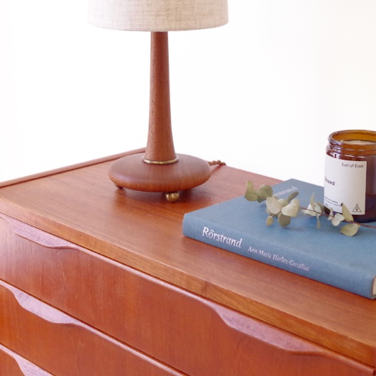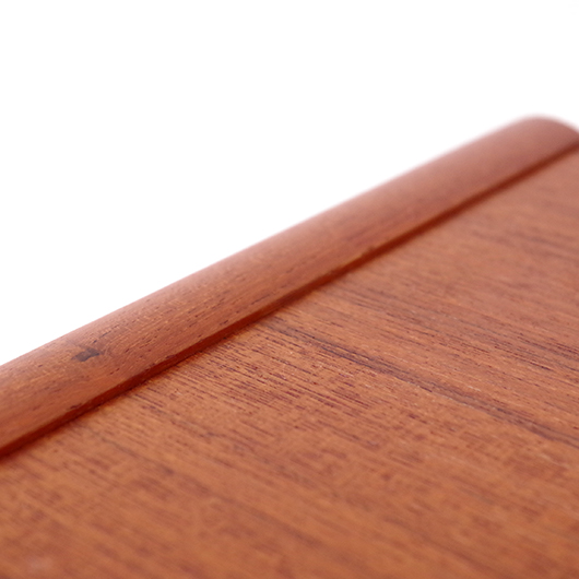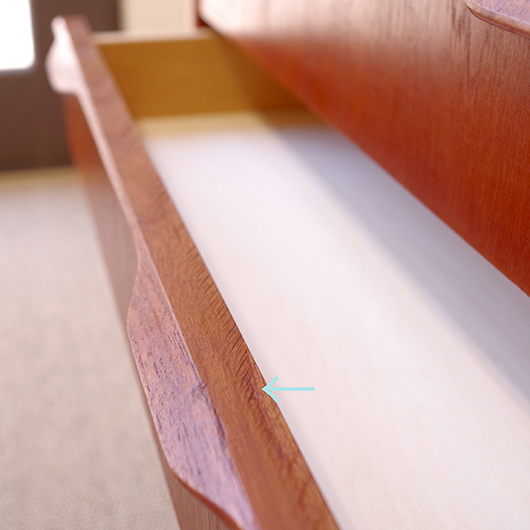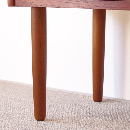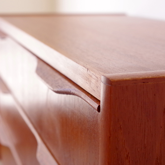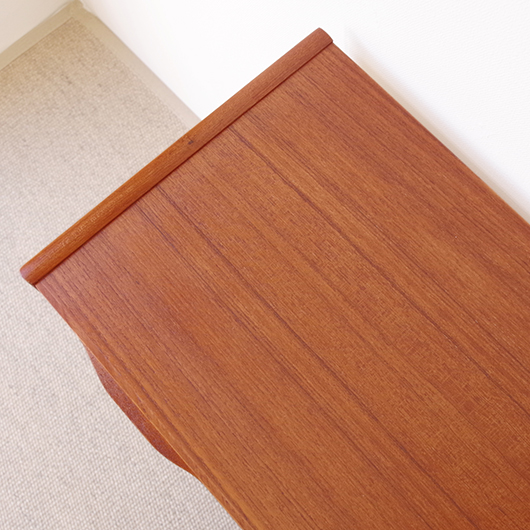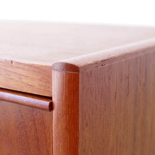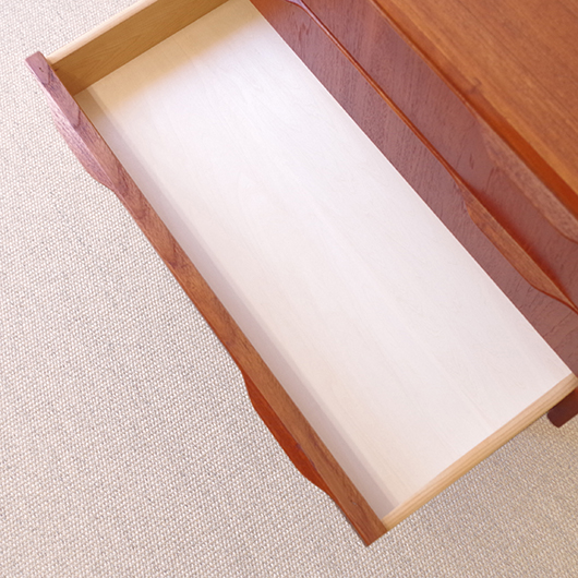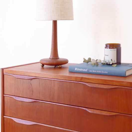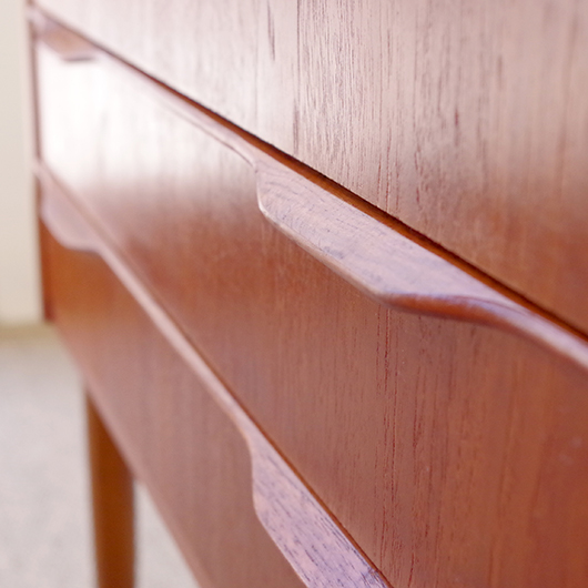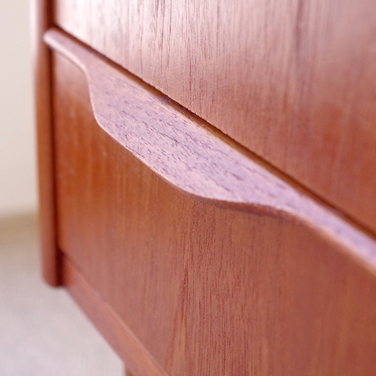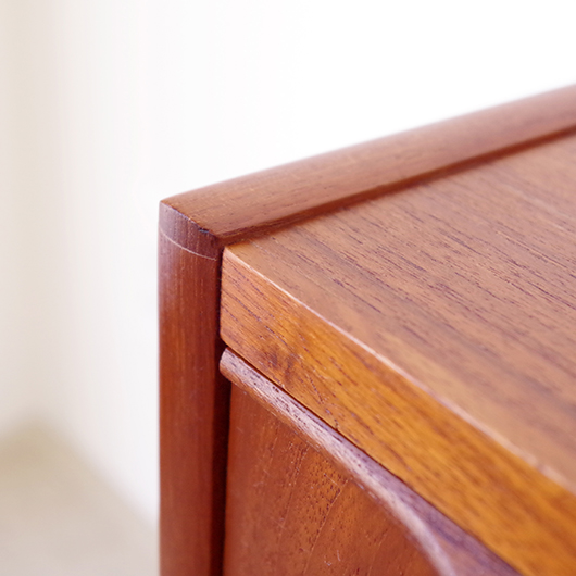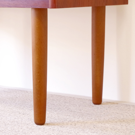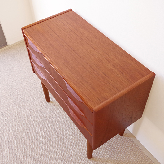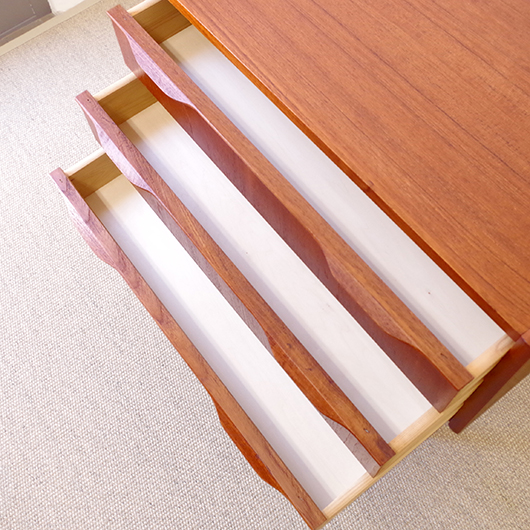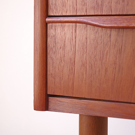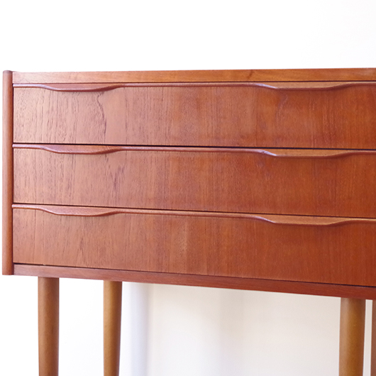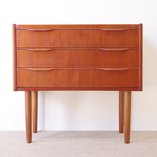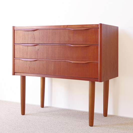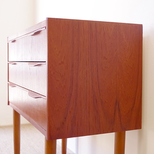 1960年代デンマーク製のヴィンテージ3段スモールチェスト。引出しの縁に沿って付けられた無垢材の取っ手は指掛かりも良く、すっきりとした印象を与えてくれます。正面から見て上下に揃った木目も、丁寧に作られたデンマーク製のヴィンテージらしさのひとつで、スラリと伸びる脚部を含めて小ぶりながらに見応えもたっぷりです。 玄関やリビングはもちろんベッドサイドなどに置いて、文具など細かなものを収納していただけます。天板には小物や花瓶などをディスプレイしたり、ベッドサイドではテーブルランプや読みかけの本などを収納したりと様々な使い方が思い浮かびます。程よい高さのため、上部の空間にポスターや壁掛けミラーを合わせても良さそうです。 丁寧な修復を行いまして、綺麗な状態です。引出しの底板と背板も新しい物に交換しておりますので、清潔にお使いいただけます(水色の矢印箇所は製造工程でできたもので、製品クオリティとしてご了承ください)。詳しくは画像にてご確認ください。