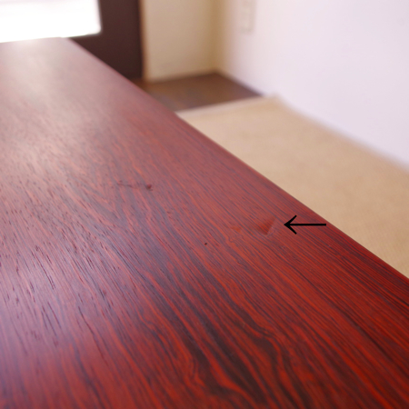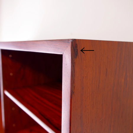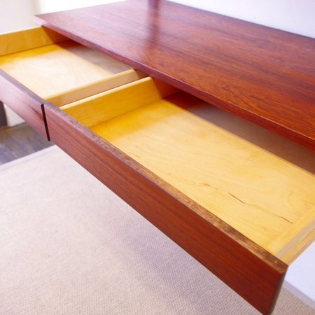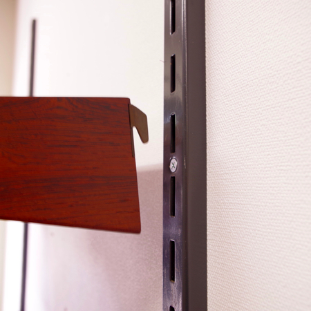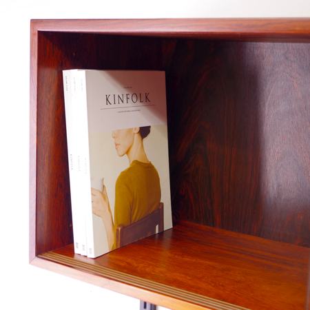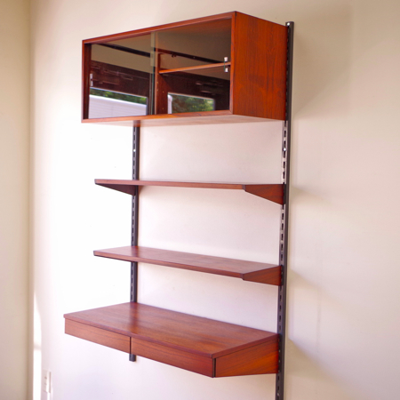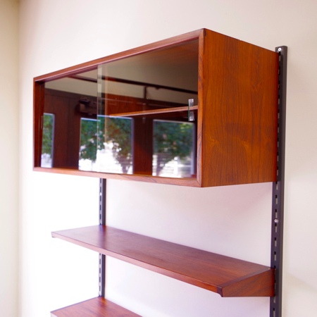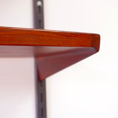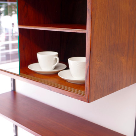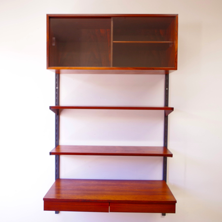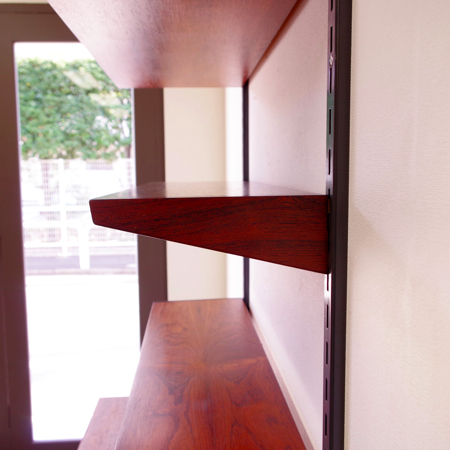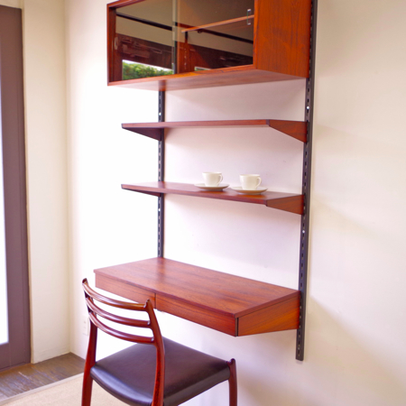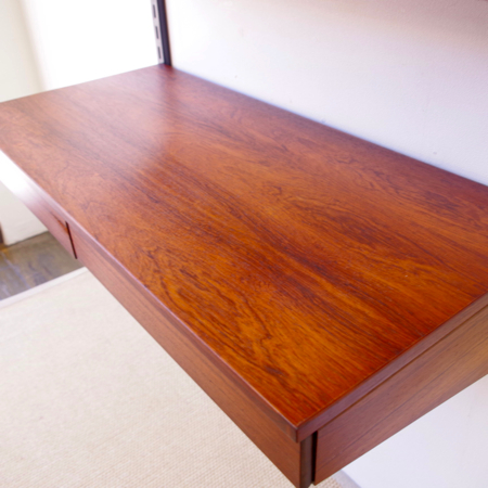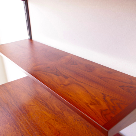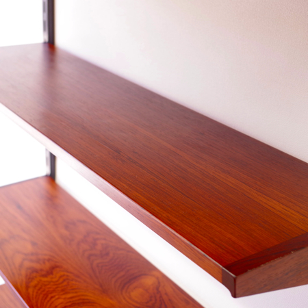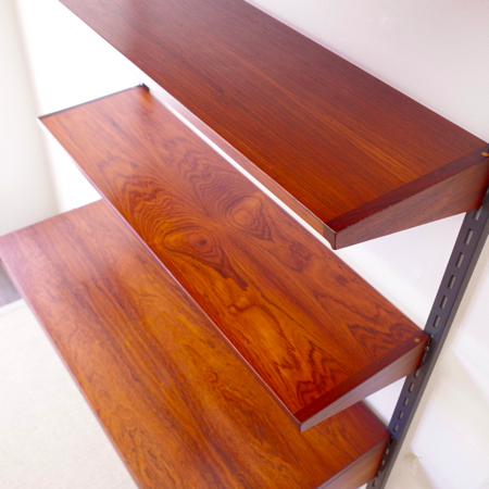 1950年代に活躍した家具デザイナーの一人、カイ・クリスチャンセン(Kai Kristiansen)がデザインしましたウォールユニットです。 スチール製の支柱を壁に留めてガラスキャビネット、棚板、デスク天板などをお好みの位置へ簡単に取り付けることができます。画像の取り付け位置はその一例で、載せるものに合わせて自由に組み替えることができます。 今では大変希少となった杢目の美しいローズウッド材が使用されており、とても落ち着いた佇まいです。棚板左右のウィング部分にはローズウッド無垢材の削り出しによる見事な造形が見られ、全体のアクセントとしても効いています。 キャビネットの上部に凹みやキズ、エッジに若干のダメージ、側面に補修個所などがございます。画像のように高い位置にてご使用の場合は気にならないかと思います。全体としては綺麗で良好な状態です。詳しくは画像にてご確認ください。