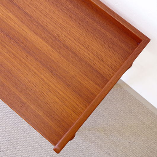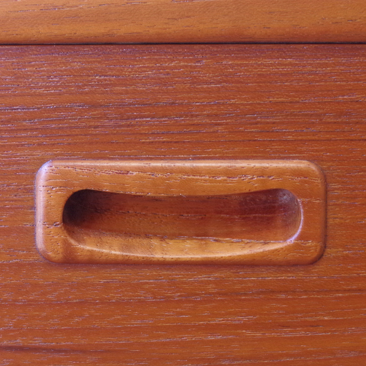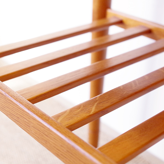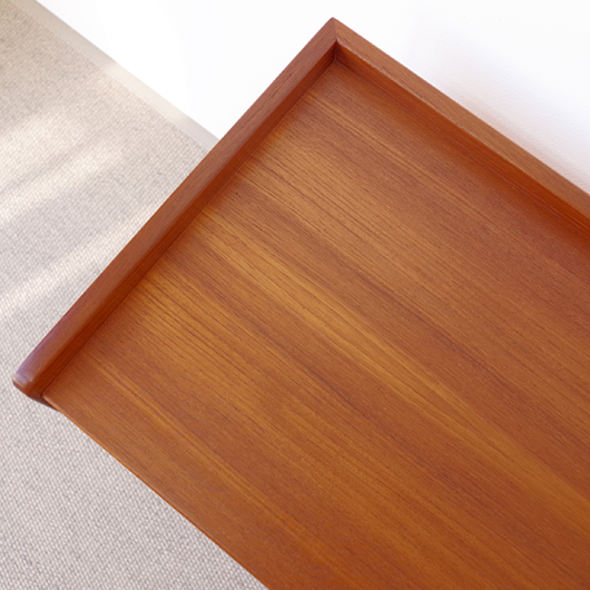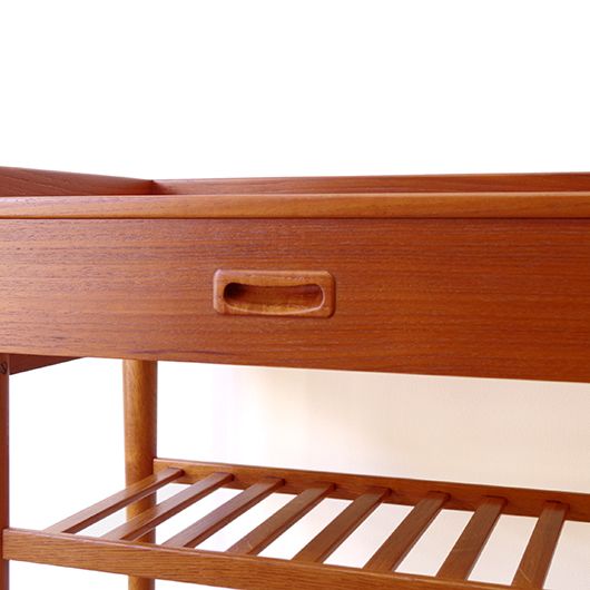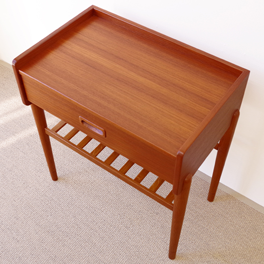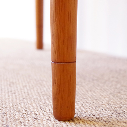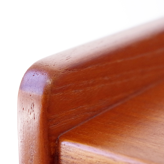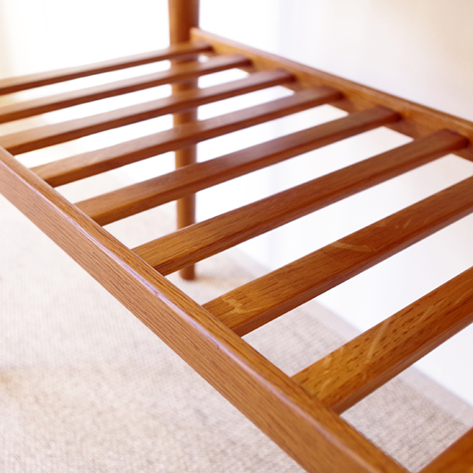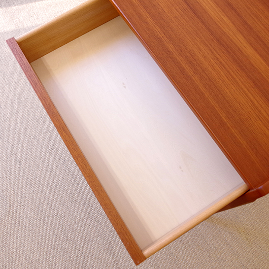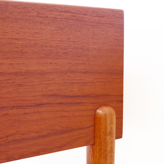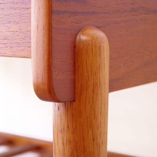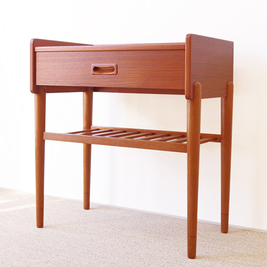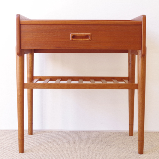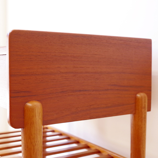 1960年代Gunni Omannのデザインによる、Omann Jun's Møbelfabrik製のヴィンテージ ベッドサイド チェストmodel.128。チーク材の本体にオーク材の脚部と、異なる樹種のコントラストが印象的です。デザインの特徴となっているのは脚部のデザインで、丸みのある円柱の脚部を側面にはさみように取り付けられています。そして下方にラダー状のラックが付いていたり、脚部先端に切り返しをつけたりと細部にまで細やかに作られた上質な一台です。 ナイトスタンド、ナイトテーブルとも呼ばれるこちらは、ベッドの横に置いてテーブルランプや目覚まし時計を乗せ、ラックには読みかけの雑誌をサッと収納したりと、使い勝手の良さも伺えます。また天板3方向に立ち上が理があることで、照明や花瓶なども安心して置くことができます。 丁寧な修復を施しまして、非常に綺麗な状態です。引き出しの底板は新しいものに交換しましたので、清潔にお使いいただけます(画像にあるメーカースタンプは、交換前の古い底板裏に押されていたものです)。詳しくは画像にてご確認ください。