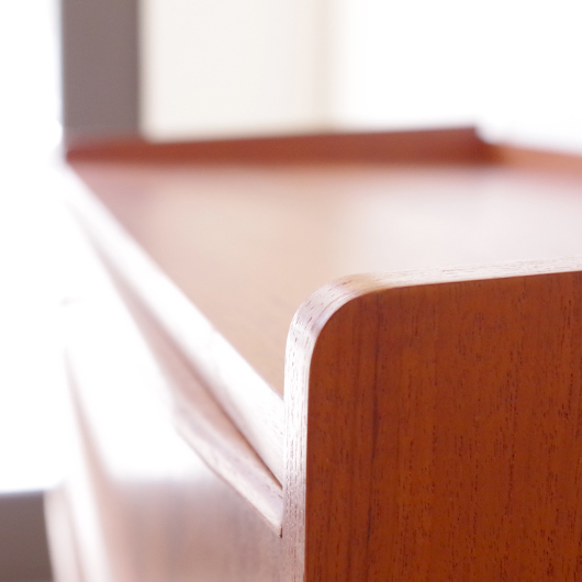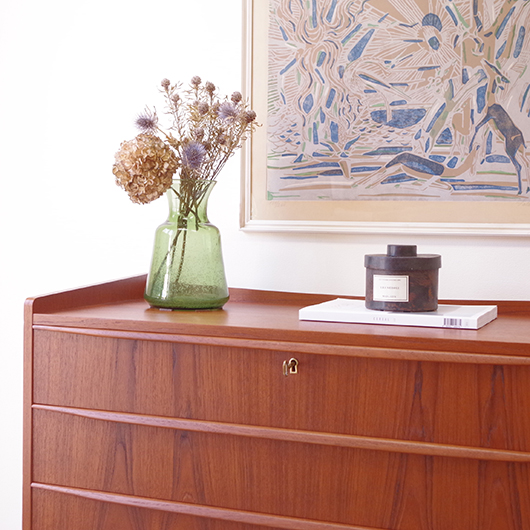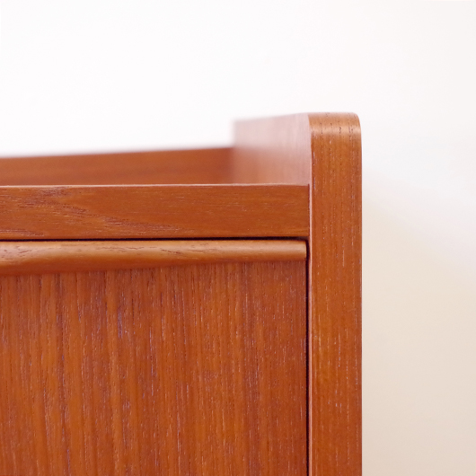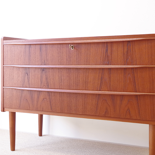 1960年代デンマーク製の、ヴィンテージ鍵付きミディアムワイドチェスト。 引出しの縁に沿って付けられた、チーク無垢材の削り出しによるバータイプの取っ手のデザインが全体をすっきりとまとめています。また側面のエッジを角を落としたアールにしたり、天板奥の緩やかな曲線を描く立ち上がりなど、細部にわたって細やかな作りであることが伺えます。 特徴は90cmを超えるワイドのあるサイズで、ゆったりと大容量の収納部はもちろん、木取りの良い木目を楽しむことができます。また正面から見て上下に揃った木目も、丁寧に作られたデンマーク製のヴィンテージらしいポイントのひとつです。最上段には雰囲気のある鍵も付属しております。 リビングや寝室などに置いて、衣類などをたっぷり収納していただけます。程よい高さの天板にはお気に入りの小物はもちろん、テーブルランプやベースなどをディスプレイしてお楽しみいただけます。 全体を丁寧にサンディング(研磨)をした後に再塗装を行い、とても綺麗な状態に仕上がりました。ごく僅かなキズなどございますが、まず気にならない程度と思います。引き出しの底板は新しいものに交換しておりますので、清潔にお使いいただけます。詳しくは画像にてご確認ください。
