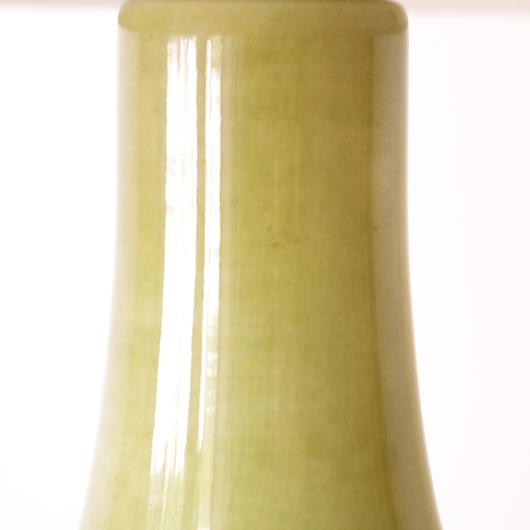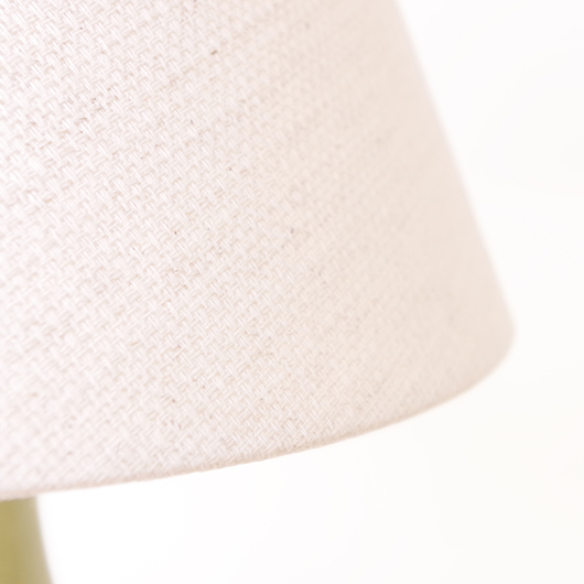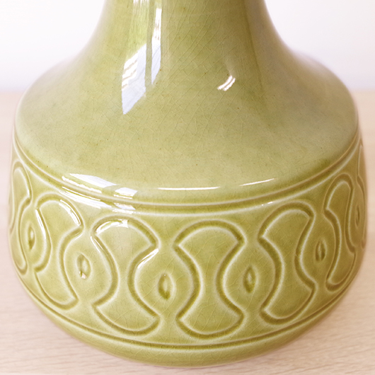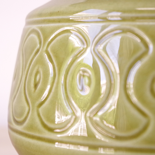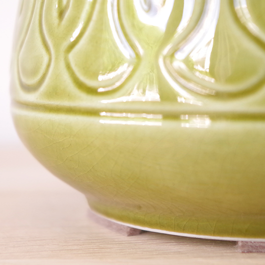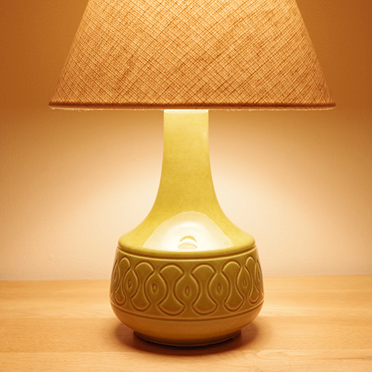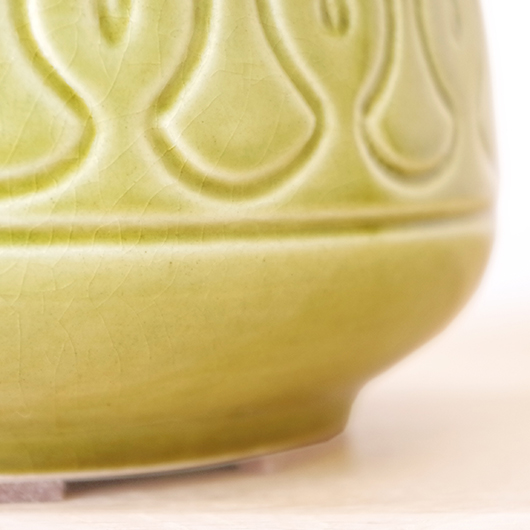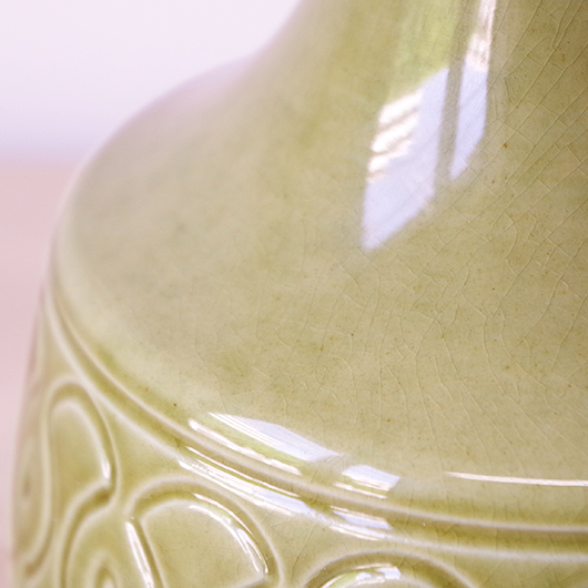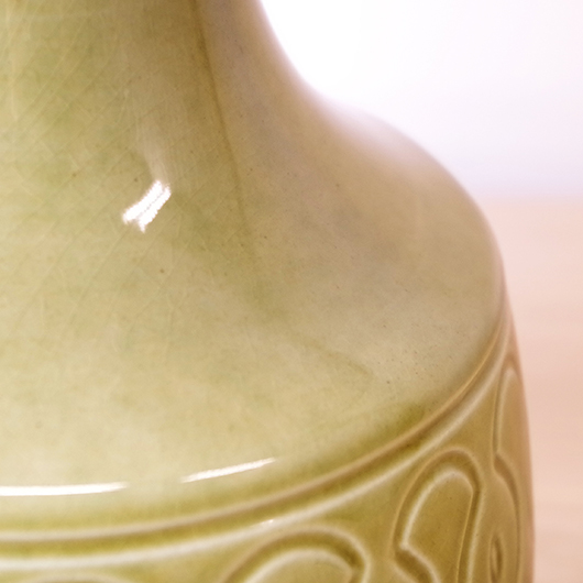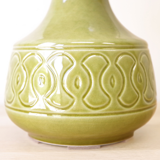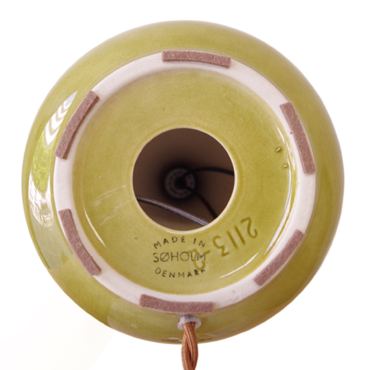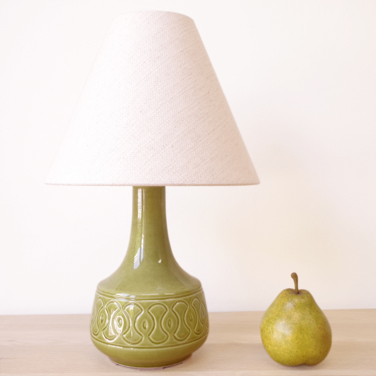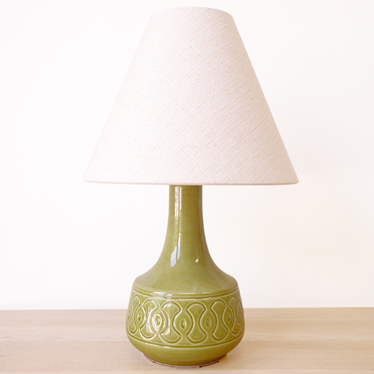 1835年にデンマークのボーンホルム島に窯を開いたSoholm窯のヴィンテージテーブルランプ。本体の艶のあるモスグリーンは、明るめなのに絶妙な色味の加減で落ち着きのある佇まいです。近くで見ると光を受けた表面に貫入が見られ、より複雑で美しい味わいを感じます。ふっくらとした本体には幾何学模様が刻まれ、その凹凸に合わせて釉薬にグラデーションが生まれることで、明かりを灯した際にまた違った表情を見せてくれます。 シェードは本体の形が美しく見えるように国内にてオーダーしたもので、明かりを灯すとコットン地の風合いがまた違った表情を作り出してくれます。新しく交換したコードなども、ヴィンテージの風合いに合うデザインをセレクトました。 電気工事士の資格を持つ職人によりソケット・コード・プラグ等の電気に関わる部分は全て交換しまして、電気用品安全法に基づいた点検なども行いPSEマークを表示しておりますので、新しいもの同様に安心してご使用いただけます(下記をご覧ください)。表面に見える貫入は陶土と釉薬の収縮率の違いにより現れるもので、ヒビではございません。詳しくは画像にてご確認ください。