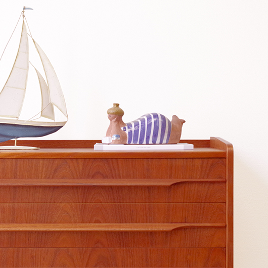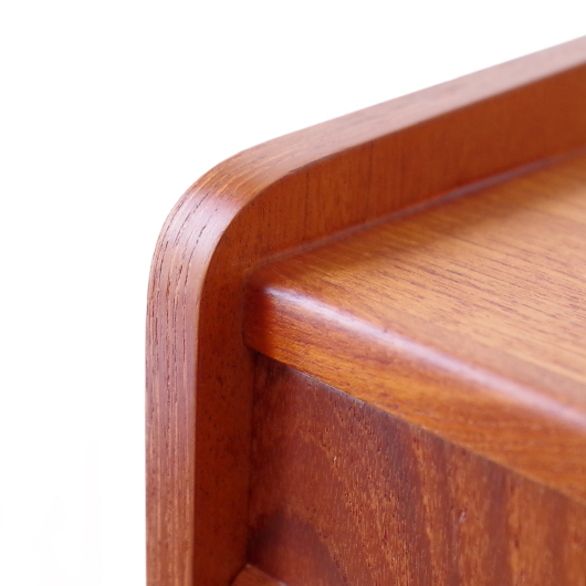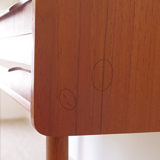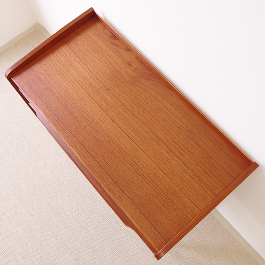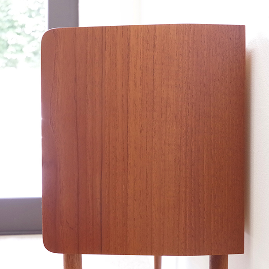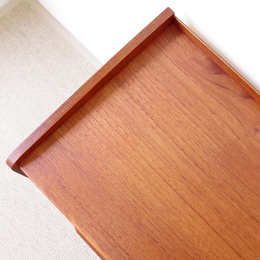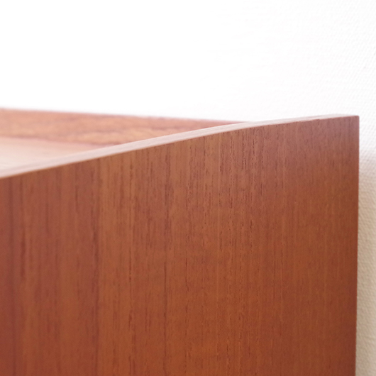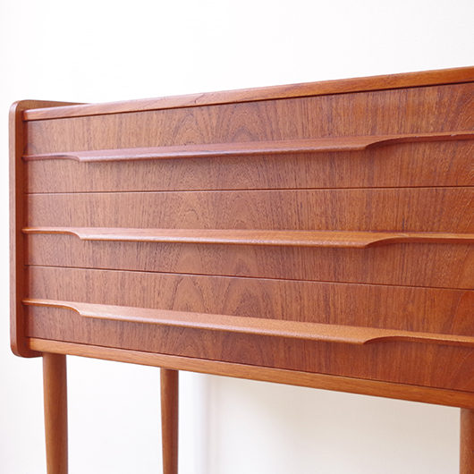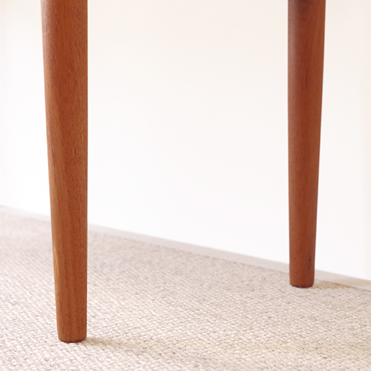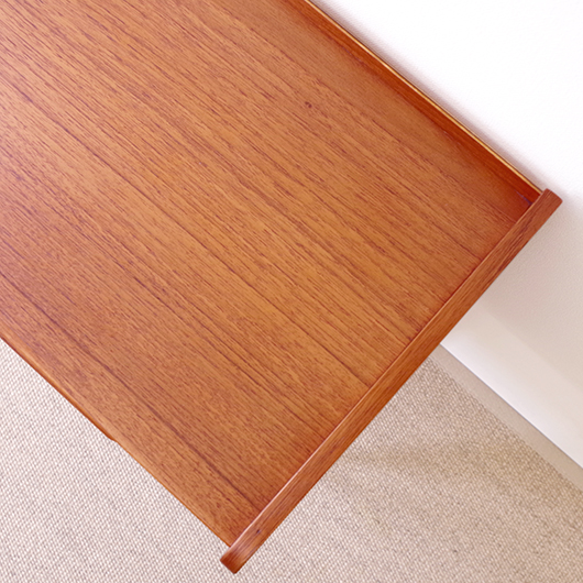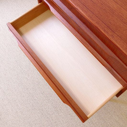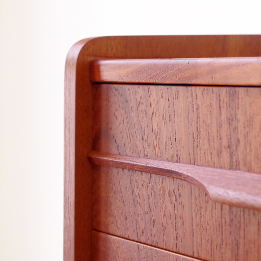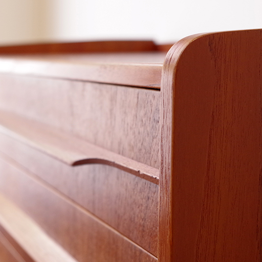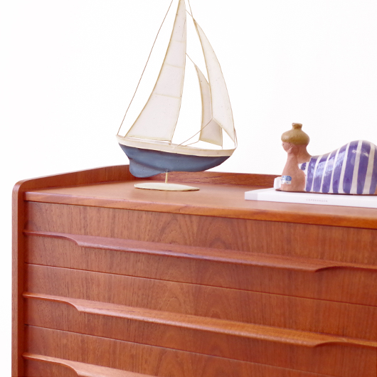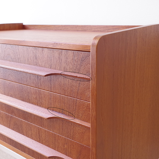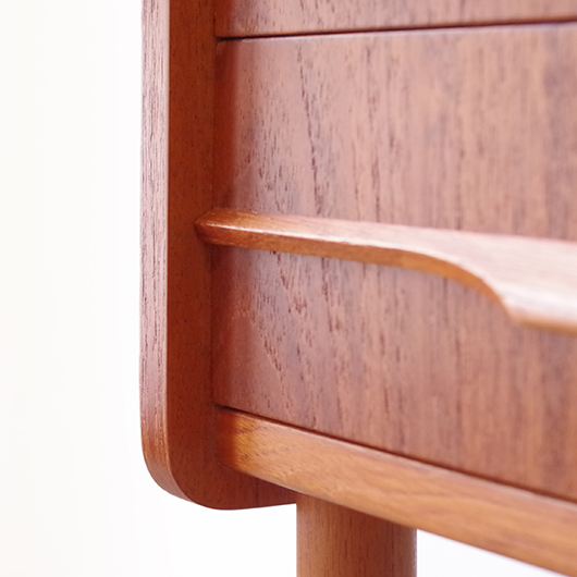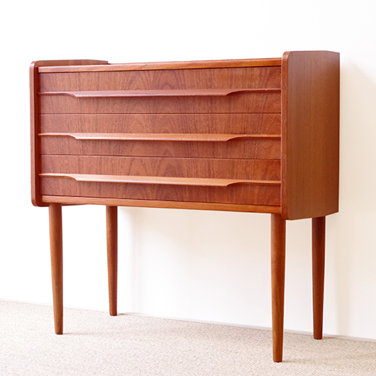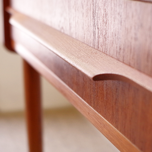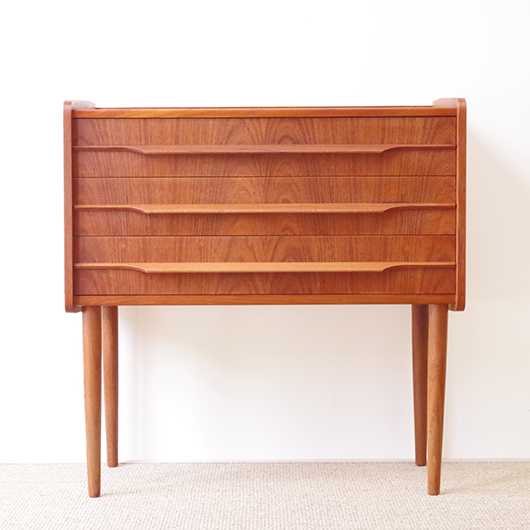 1960年代デンマーク製のヴィンテージ3段チェスト。 小ぶりなサイズの本体からスラリと細長い脚部が伸びた、北欧ヴィンテージらしい佇まいです。両サイドの側板の正面が緩やかなアールを描いていることで、すっきりとした中にやわらかな雰囲気をプラスしています。 チーク無垢材の取っ手は引き出し正面の真ん中に取り付けられており、エッジに取り付けられたものと比べるとよりすっきりと直線を意識させてくれます。そして正面から見て上下に揃った木目も、丁寧に作られたデンマーク製のヴィンテージらしいポイントのひとつです。 寝室やリビングなどに置いて、細々としたものをまとめて収納してはいかがでしょうか。天板にはお気に入りの小物などをディスプレイするのも、楽しみのひとつかと思います。程よい高さのため、上の空間にポスターや壁掛けミラーを合わせても良さそうです。 丁寧な修復を行いまして、全体的に綺麗な状態です。引出しの底板は全て新しく交換しておりますので、清潔に気持ち良くお使いいただけます。補修箇所や僅かな打キズなどございますが、雰囲気を損ねるほどでなはいかと思います。詳しくは画像にてご確認下さい。