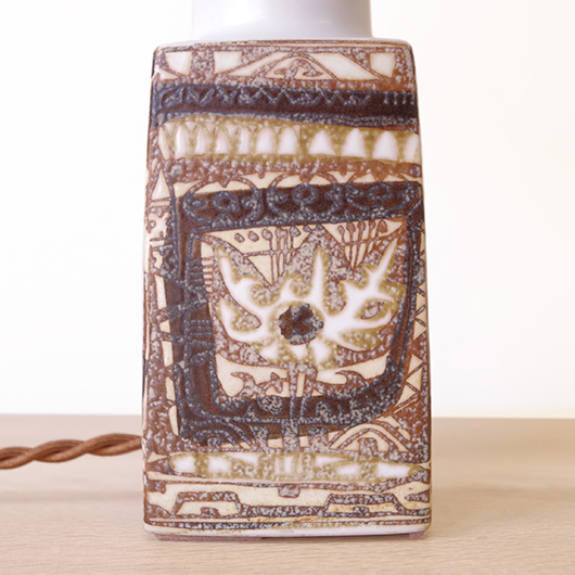 1969〜1973年に製造されたロイヤルコペンハーゲンBACAシリーズのベースを使用しました、デンマークの照明メーカーFog & Morup社のテーブルランプ。 現在のロイヤルコペンハーゲンには見られない表情豊かな色合いは、ファイアンス窯により作り出されたヴィンテージならではのもの。ブラウンやベージュといったアースカラーの、穏やかで優しい色合いとなっております。絵柄はニルス・トーソンによるデザインで、鳥や魚がのびのびとしたフリーハンドで描かれております。また照明としてだけでなく、鑑賞用としても楽しませてくれます。 シェードは本体の形が美しく見えるように国内にてオーダーしたもので、明かりを灯すとリネンの生地の風合いがまた違った表情を作り出してくれます。新しく交換したコードなども、ヴィンテージの風合いに合うデザインをセレクトました。 電気工事士の資格を持つ職人によりソケット・コード・プラグ等の電気に関わる部分は全て交換しまして、電気用品安全法に基づいた点検なども行いPSEマークを表示しておりますので、新しいもの同様に安心してご使用いただけます(詳しくは下記をご覧ください)。 ヒビやチップなどなく、綺麗な状態です(本体表面に見られる部分は"貫入"と呼ばれる陶土と釉薬の収縮率の違いにより現れるもので、ヒビではございません)。詳しくは画像にてご覧ください。