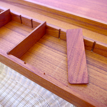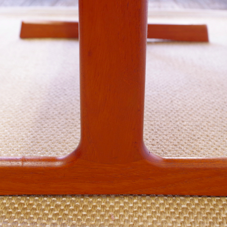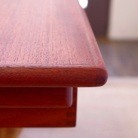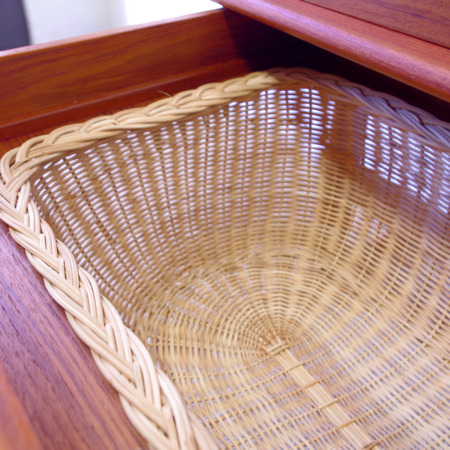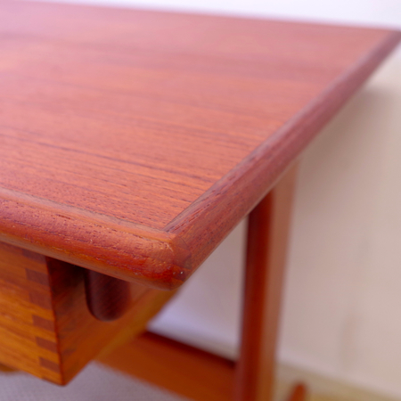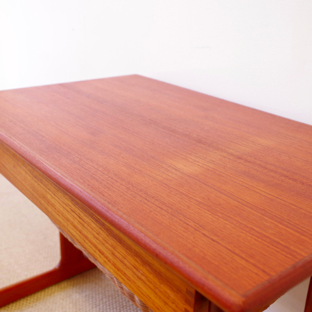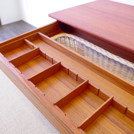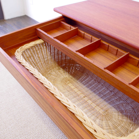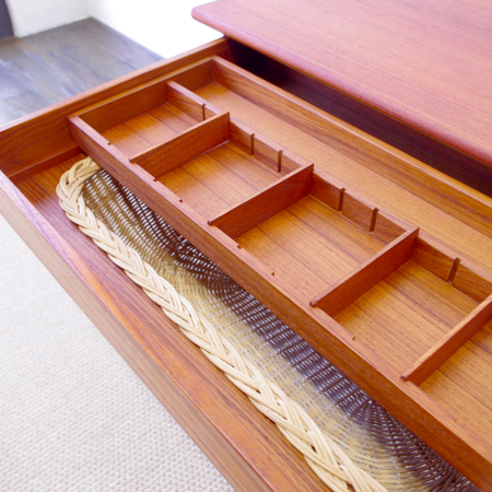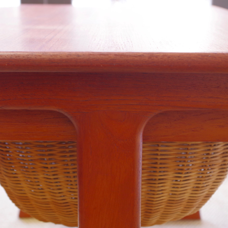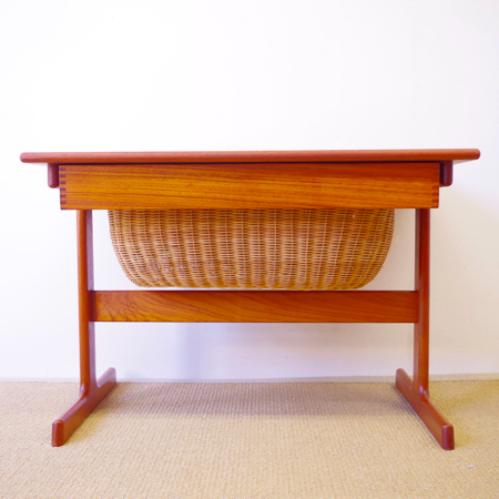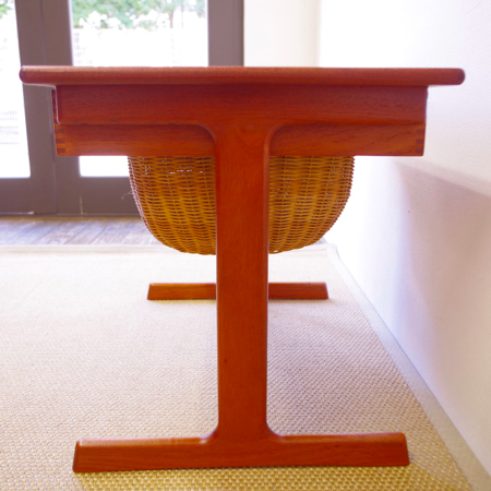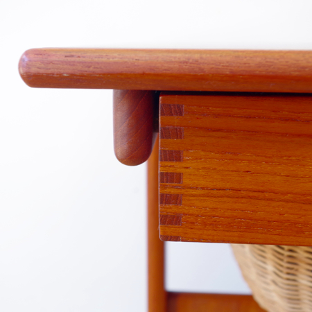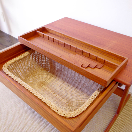 1960年代デンマーク製のソーイングテーブルです。 引出しの中は珍しい可動式の仕切りとなっており、下側のラタンのカゴへと繋がっております。また細かな仕切り板が全て動かせますので、入れるものに合わせて自在に変えることができるようになっております。内部の仕切りも全てチーク材が用いられた贅沢な造りです。一般的なものは裁縫道具をすっきりと収納できるように細かな固定式の仕切りが多いのですが、こちらはソーイングというだけでなく、より幅広くお使いいただけるかと思います。 引出しの接合部であったり、細部を見ますととても丁寧に作られていることがよく分かります。しっかりとしたメンテナンスを施しまして、目立ったキズのない大変綺麗な状態です。
