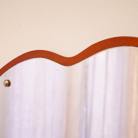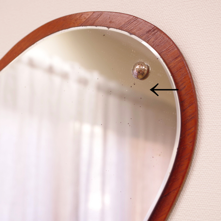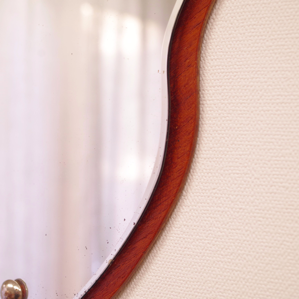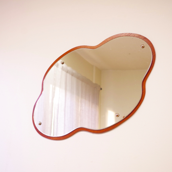 デンマーク製のヴィンテージ壁掛けミラーです。 雲のようなふわりとした形で、お部屋の壁を華やかに彩ってくれます。四角や少し変形した鏡が多い中、この様な表情のある形をしたものはまず見かけません。チーク材の土台が縁取りのように後ろを支え、柔らかな表情ながら確りとした作りであることが分かります。 鏡の端や内部に経年感がございますので、画像にてご確認下さい。裏側に壁掛け用のフックが付いております。