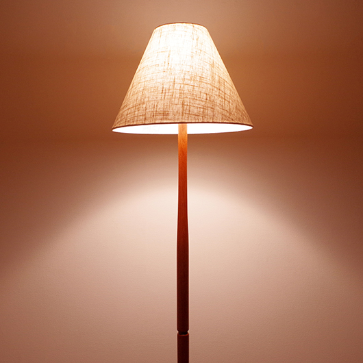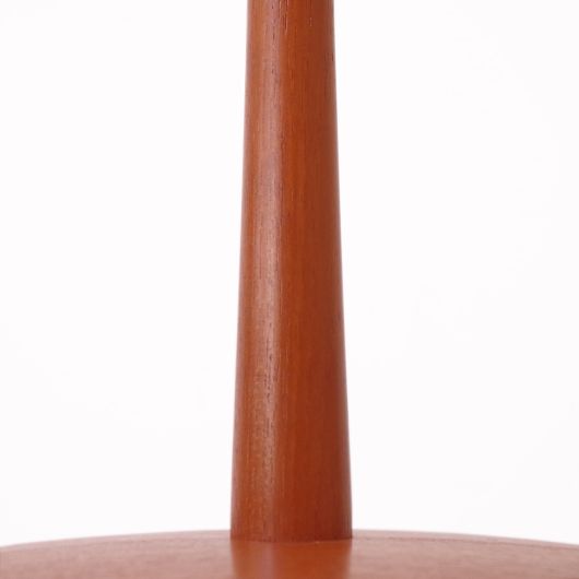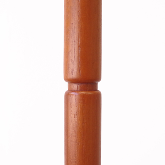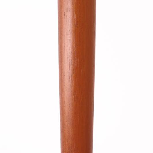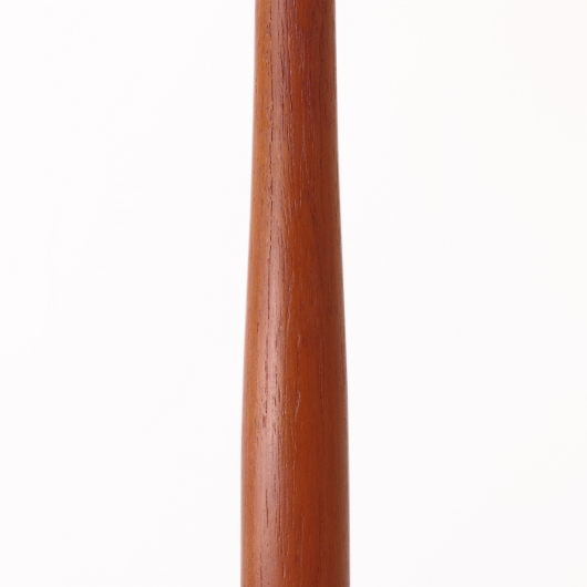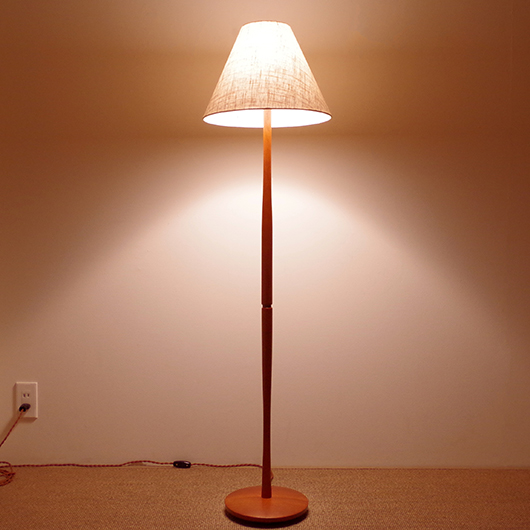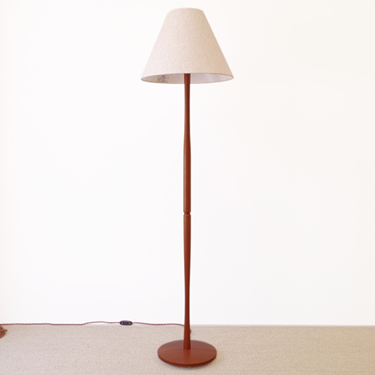 1960年代スウェーデン製のヴィンテージフロアランプ。 2パーツに分かれた支柱は中央の接合部から一旦くびれを持たせ、そこから先端に向かって再度膨らみを持たせるという、ゆるやかな曲線が美しい一灯です。素材にはチーク無垢材を贅沢に用いており、まるで凸レンズのように膨らみのある非常に見応えのあるものです。 シェードは本体の形が美しく見えるように国内にてオーダーしたもので、明かりを灯すとリネン地の風合いがまた違った表情を作り出してくれます。新しく交換したコードなども、ヴィンテージの風合いに合うデザインをセレクトました。 高さの抑えられたもののため、ソファ横に置いて手元を照らす直接照明としていかがでしょうか。お使いのインテリアにプラスするだけで、やわらかな灯りによってお部屋の雰囲気をぐっと増してくれることと思います。 電気工事士の資格を持つ職人によりソケット・コード・プラグ等の電気に関わる部分は全て交換し、電気用品安全法に基づいた点検なども行いPSEマークを表示しておりますので、新しいもの同様に安心してご使用いただけます(詳細下記ご参照)。 丁寧な修復を行い、全体的に非常に綺麗な状態です。ごく僅かな小キズなどございますが、まず気にならない程度かと思います。そのほか細部の状態などは、画像をご参照ください。