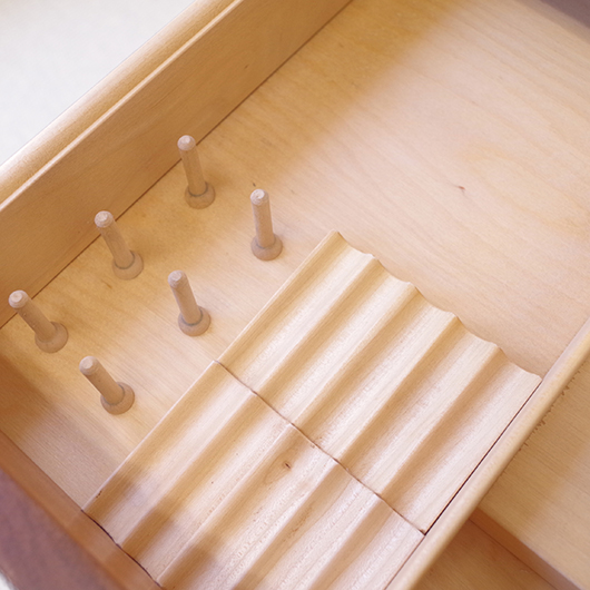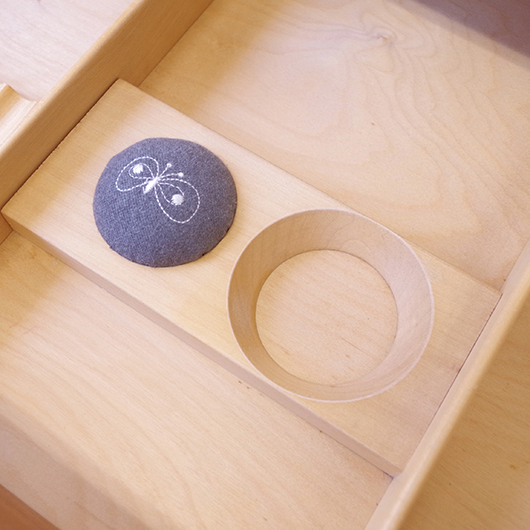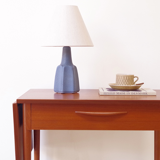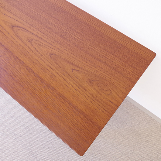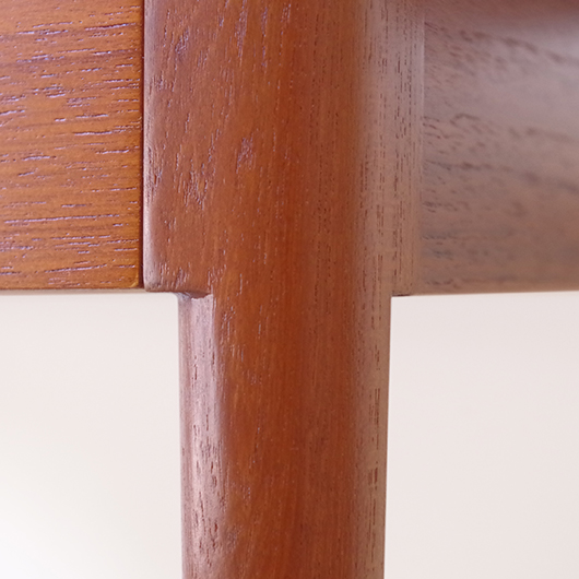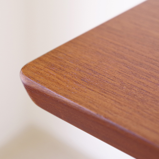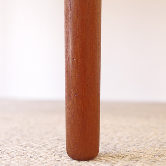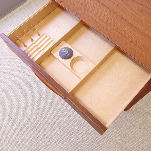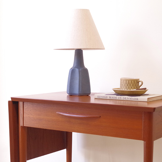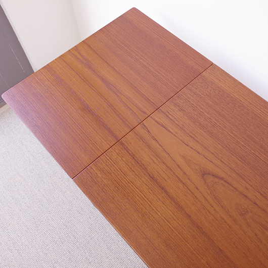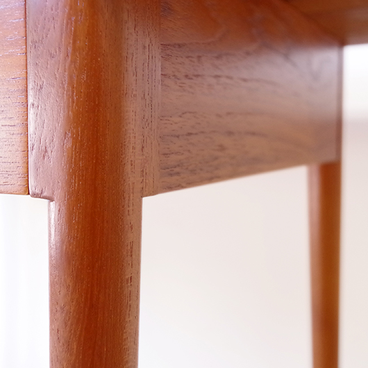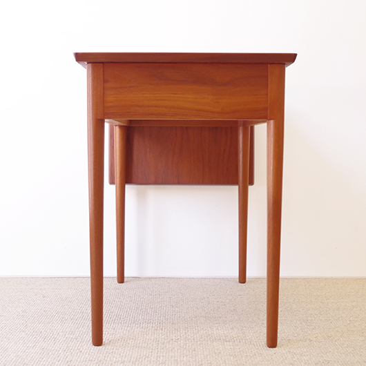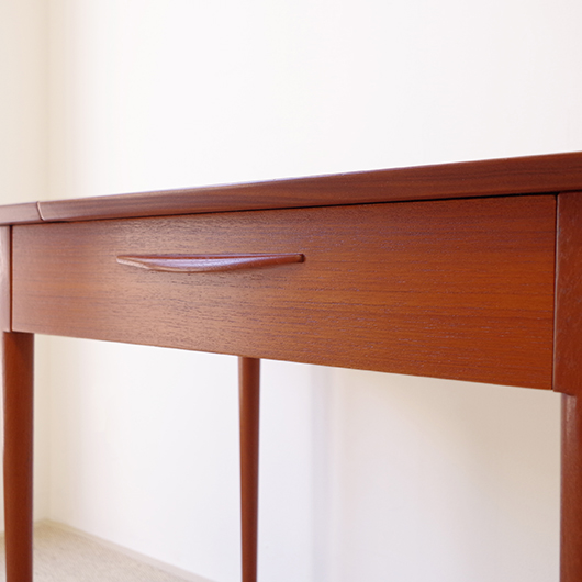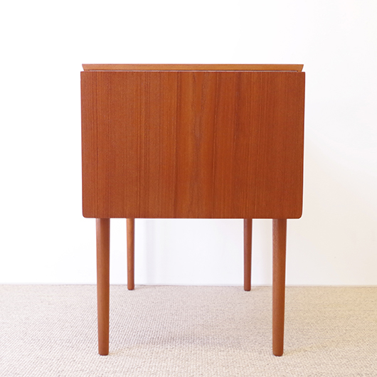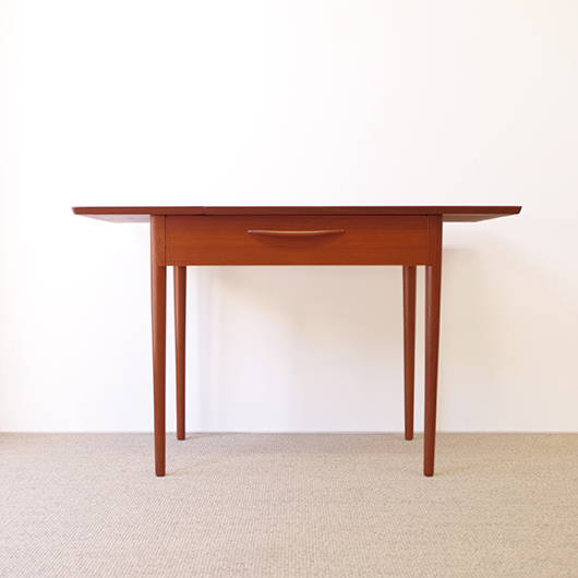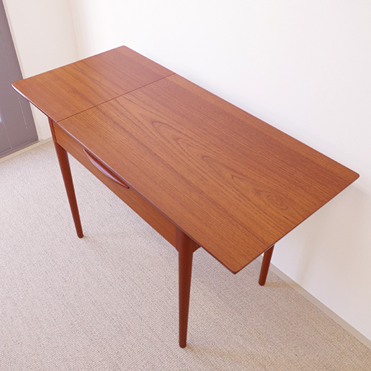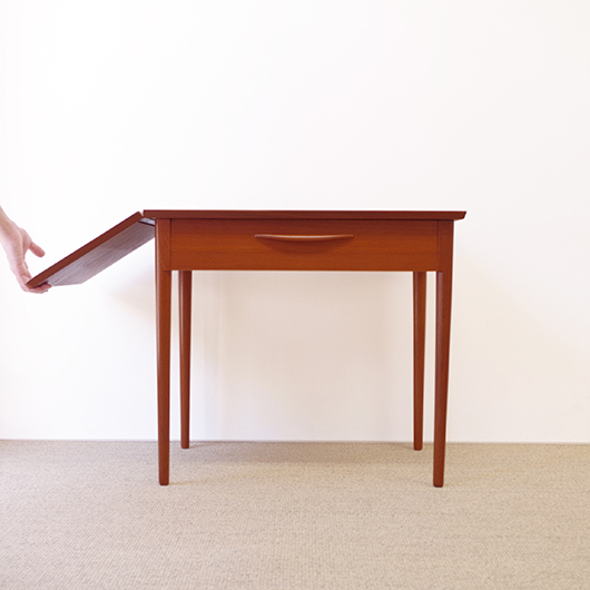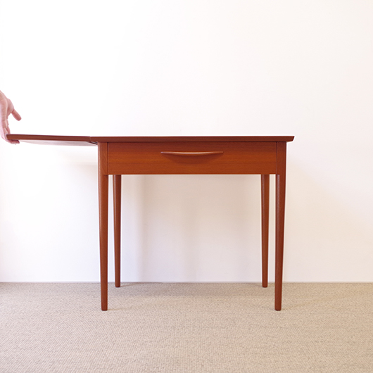 1960年代デンマーク製の ヴィンテージソーイングテーブル。 天板の下に引き出しが付き、その中に細々とした裁縫道具を効率よく収納できる作りとなっております。引き出しの中はボビン立てや細かな仕切りがあったり、ピンクッションまで付いています。 一番の特徴となっているのは天板の構造で、天板横に吊り下がったドロップリーフを引き上げて横にスライドさせると、広い天板へと変化するギミックがユニークです。伸張後は90cmを超えた広々とした天板となり、リーフ板と綺麗に繋がる木目も見所です。 夜の長い北欧諸国では裁縫が盛んなゆえ、裁縫道具をひとまとめに収納できるこのような家具が作られました。もちろん多目的に使用できるためソーイングにこだわらず、ソファ脇などに置いてリビングに散らかりがちな文具やアクセサリーなどのこまかなものを収納したりと、現代の暮らしに合わせた使い方が思い浮かびます。特にこちらはすっきりとしたデザインと伸張できる天板ということで、コーヒーテーブルとして使用しても良さそうです。 全体を丁寧にサンディング(研磨)した後に再塗装を行い、全体的にとても綺麗な状態です。ピンクッションはmina perhonen dop chouchoにて張り替えを行いました。脚部などに僅かな小キズは残りますが、まず気にならない程度と思います。そのほか細部の状態などは、画像をご参照ください。