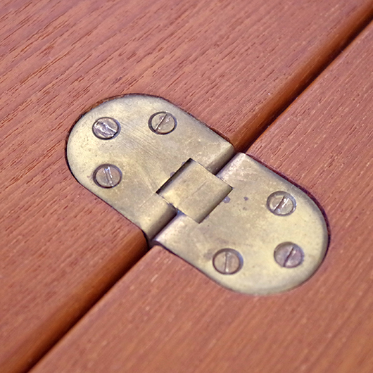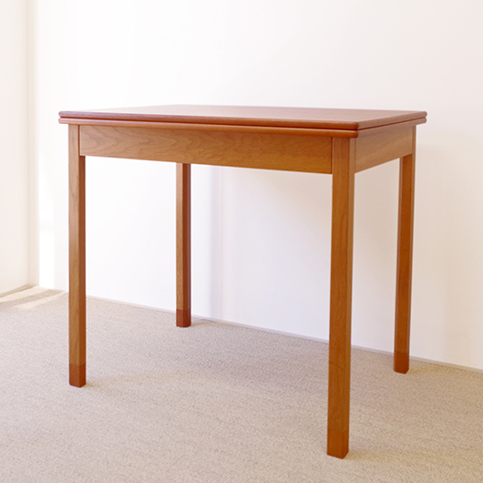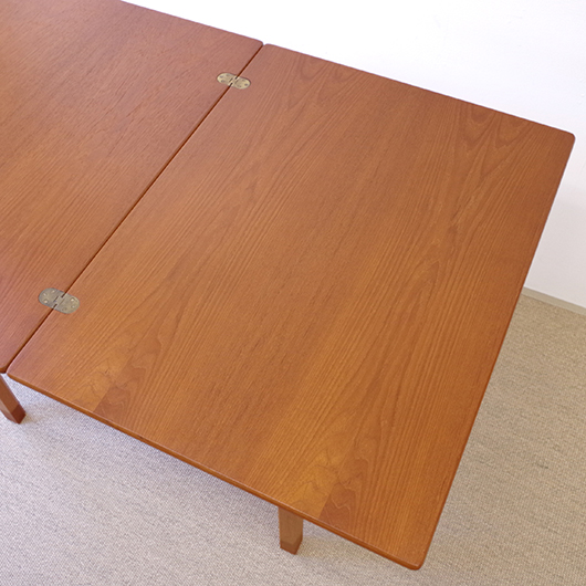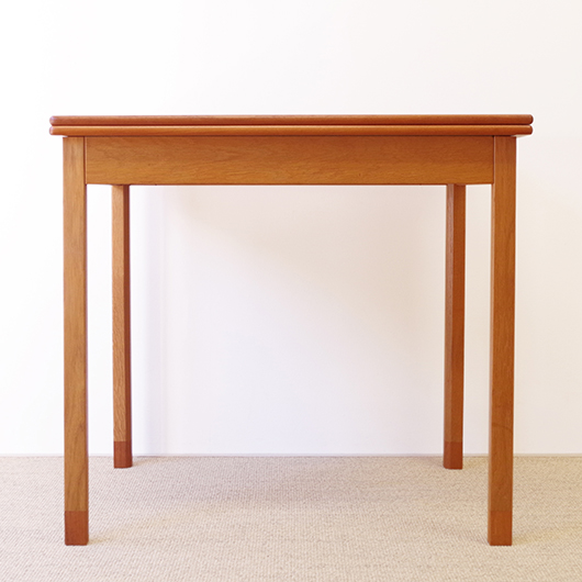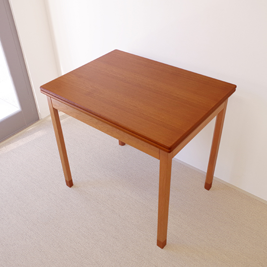 Ejner Larsen のデザインによる1950〜1960年代デンマークSKM Kolding製ヴィンテージ フォールディングテーブル。 デザインの特徴としては、何といっても天板が2枚に折りたたまれていること。半円状にスライドさせて上の1枚をパタンと片側に返すだけで、倍のサイズに広げることができます。1人でも簡単に行うことができる利便性だけでなく、このユニークなギミックにも驚かされます。 天板はチーク材、脚部と幕板にはオーク材と、色味の異なる樹種を用いてコントラストを効かせております。そして脚先に靴下を履いたような愛嬌のあるデザインは汚れやすい先端を保護する役割も担い、さらに脚部内側の角を落として5角形にするなど、細部にまで丁寧に設計されていることが伺えます。そして広げた際に見える真鍮金具も、鈍色に経年変化したヴィンテージならではの美しさです。 普段はコンパクトな2人掛けとして、来客時はゆったり広々と、そんなシーンに応じた使い方のできる利便性の高いテーブルです。また高さやサイズ感も程よいため、デスクとしての使用もおすすめです。 全体を丁寧に研磨(サンディング)をして小キズや輪ジミを取り除き、その後に再塗装を行い、自然な艶の良い雰囲気に仕上がりました。多少の水濡れにも問題のない塗装を施しておりますので、安心してご使用いただけます。わずかな打ちキズなどはございますが、全体として非常に綺麗な状態です。そのほか細部の状態などは、画像をご参照ください。