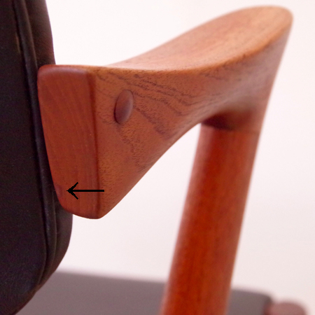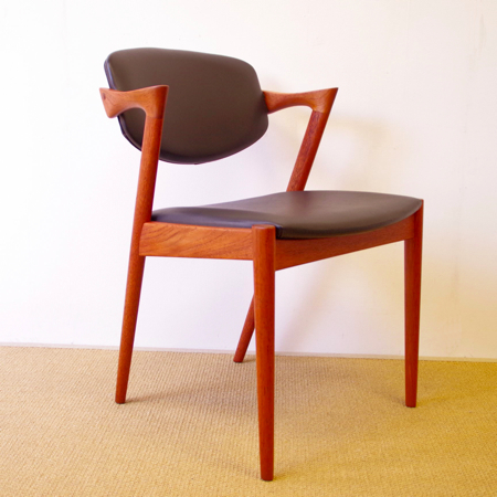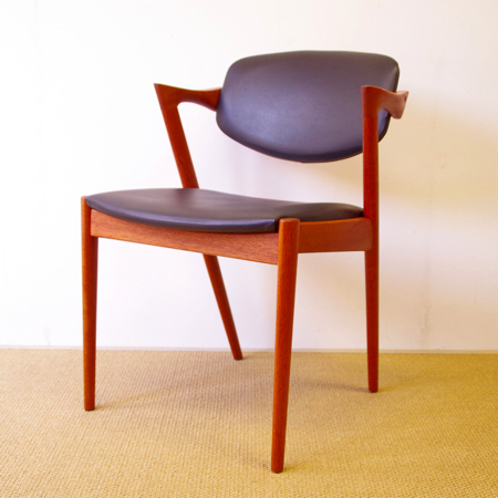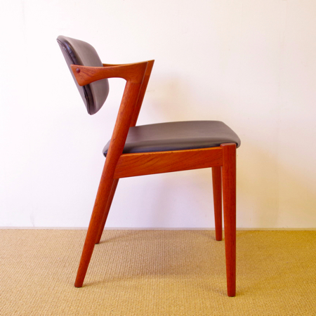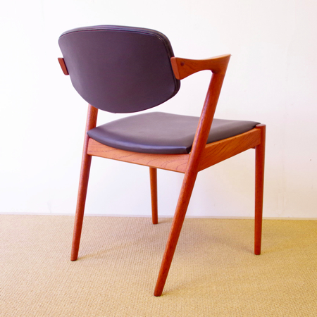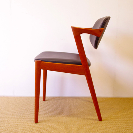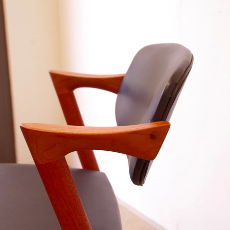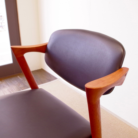 1950年代に活躍した家具デザイナーの一人、Kai Kristiansen(カイ・クリスチャンセン)デザインによるダイニングチェアNo.42のヴィンテージです。 背もたれからアームレスト、そして脚部へと繋がる美しいラインが特徴で、後ろ脚が少し内側にすぼまるデザインのため、テーブルに納めた時もすっきりとしています。背もたれが身体に沿うように僅かに動くこと、そして肘が掛けやすい小さなアームと、デザインと座り心地の良さを両立させています。 アームの裏側に小さな補修後がございますので、少しお安くご提供させていただきます。また画像は張替え前となり、ご購入後に生地をお選びいただけます。詳細につきましては、下記の【張替代込みの商品について】をお読みください。