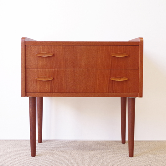 1960年代デンマーク製のヴィンテージ2段スモールチェスト。 ボート型の取手がついた引き出しや側面にアールを持たせたりと、全体的にやわらかな雰囲気です。また正面から見て上下に揃った木目も、丁寧に作られたデンマーク製のヴィンテージらしさのひとつです。スラリと伸びる脚部を含めて小ぶりながらに見応えたっぷりです。 玄関やリビングはもちろんベッドサイドなどに置いて、文具など細かなものを収納していただけます。天板には小物や花瓶などをディスプレイしたり、ベッドサイドではテーブルランプや目覚まし時計を置いたりと様々な使い方が思い浮かびます。程よい高さのため、上部の空間にポスターや壁掛けミラーを合わせても良さそうです。 丁寧な修復を行いまして、綺麗な状態です。引出しの底板と背板も新しい物に交換しておりますので、清潔にお使いいただけます。側面エッジなどに小キズなど残りますが、雰囲気を損ねない程度かと思います。そのほか細部の状態などは、画像をご参照ください。