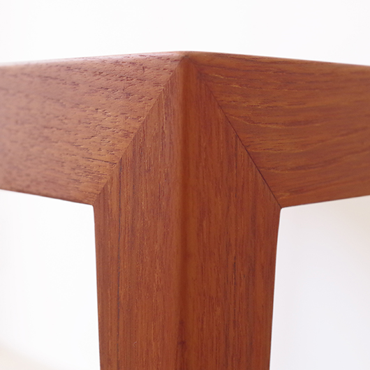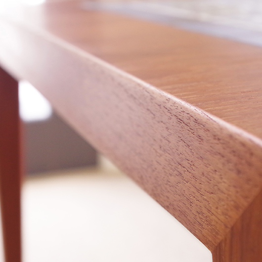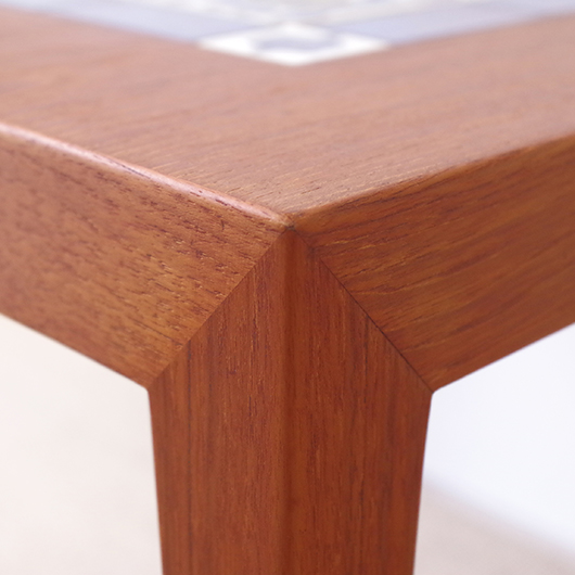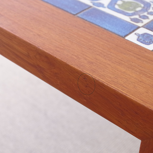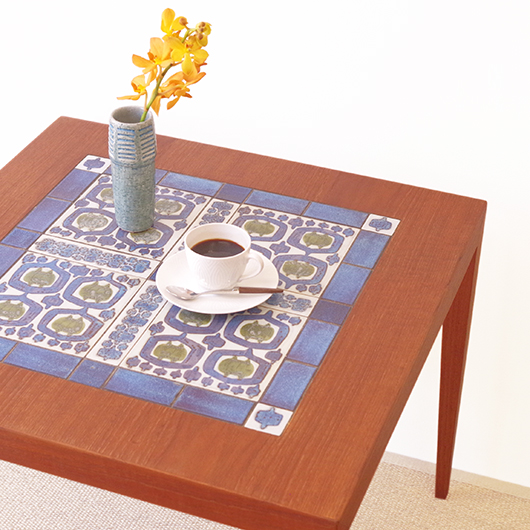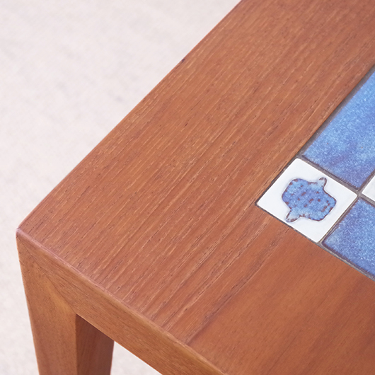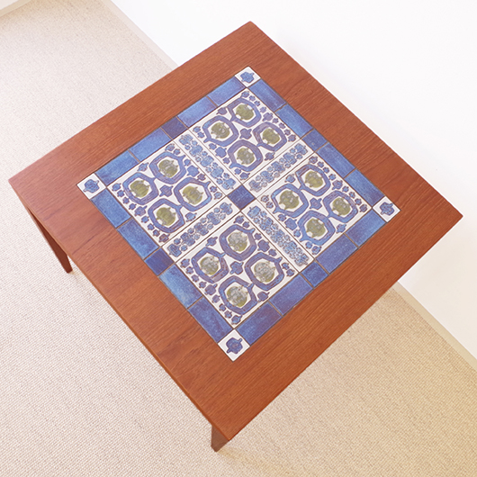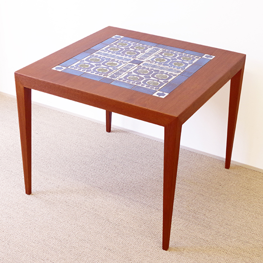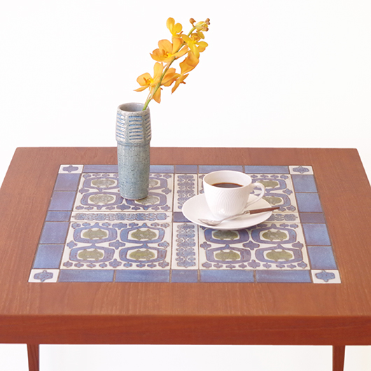 Haslev社とRoyal Copenhagenのコラボレーションによる、1960年代デンマーク製ヴィンテージ タイルトップテーブル。 天板にはロイヤルコペンハーゲンTENERAシリーズのタイルが敷き詰められ、モダンな絵柄を深い藍色のグラデーションで落ち着きを添えています。タイルを敷き詰めることで輪染みを気にせずにカップなどを載せることができ、デザイン性はもちろん実用性も兼ね備えております。 木部はローズウッド材やマホガニー材を用いたものが多い中、こちらはあまり見かけないチーク材が用いられたタイプのもので、他のものと比べて軽快さを感じます。 ソファの前に置いてコーヒーテーブルとして、また正方形のフォルムを生かしてコーナーテーブルとして使っても良さそうです。美しいタイルに負けない精巧で上質なフレームを合わせた、ヴィンテージでしか手に入らない贅沢な一品です。 丁寧な修復を施しまして、全体的に綺麗な状態です。僅かな小キズなどございますが、まず気にならない程度かと思います。そのほか細部の状態などは、画像をご参照ください。