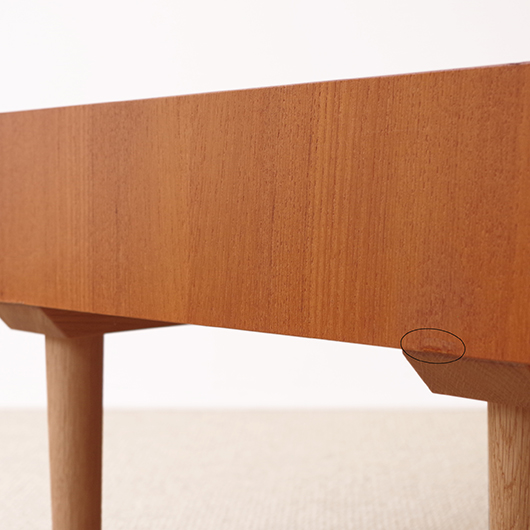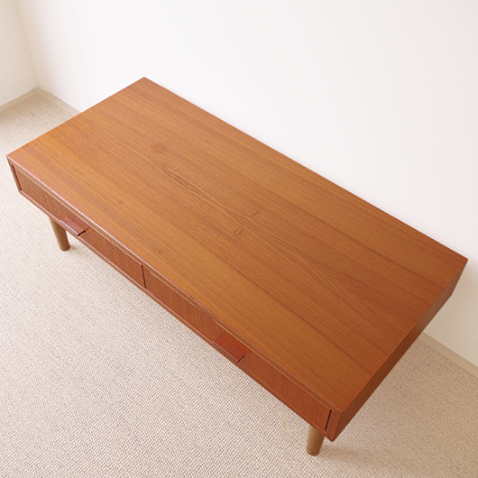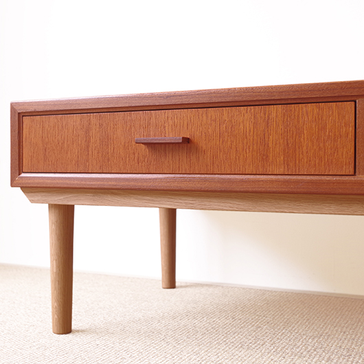 1960年代スウェーデン製 のヴィンテージ テレビボード。 幅そして奥行きのある天板下には引き出しが横並びに付き、そこから丸脚がスッと伸びた安定感のあるフォルムです。 素材は本体が明るめのチーク材、脚部はオーク材が用いられ、その色味のコントラストによって軽やかさが生まれているようです。 低めの天板を生かして上部には薄型テレビを備え付けても、バランス良く空間がまとまりそうです。またはテレビを上方に壁付けして広い天板には大きめの花器やテーブルランプなどを置き、雰囲気のある空間を作ってはいかがでしょうか。 丁寧な修復を施しまして、全体的にきれいな状態です。引き出しの底板は新しいものに交換し、清潔にお使いいただけます。所々に小キズなどございますが、雰囲気を損ねるほどではないかと思います。そのほか細部の状態などは、画像をご参照ください。