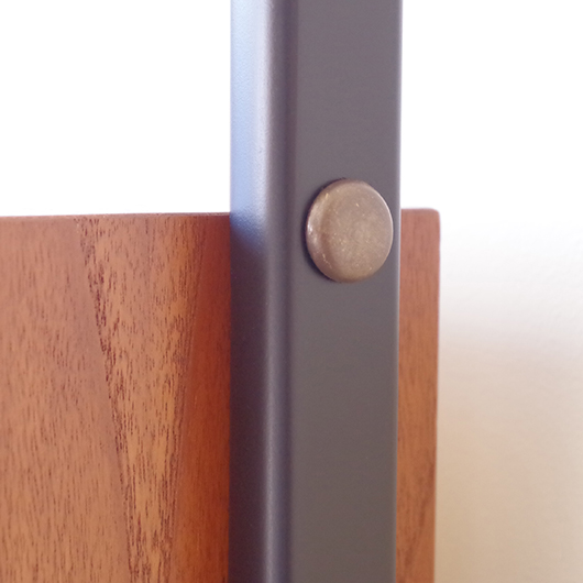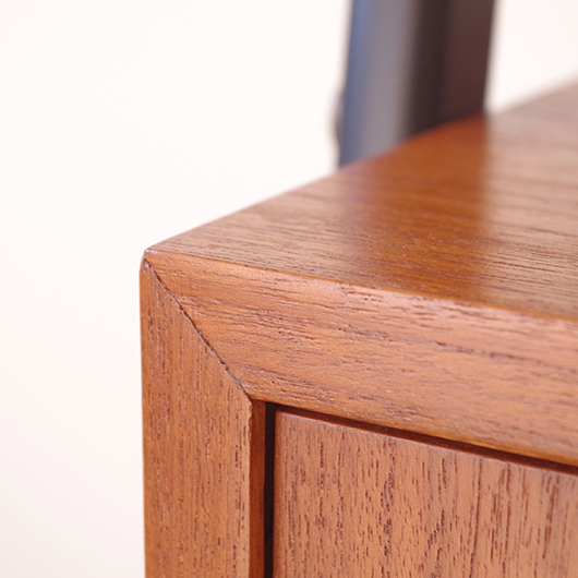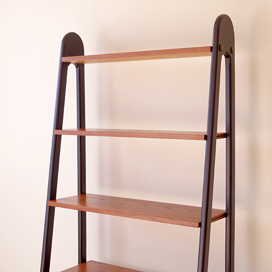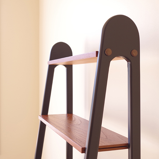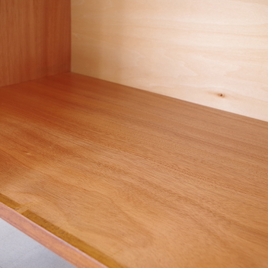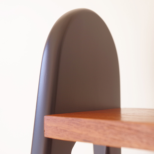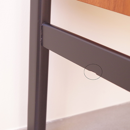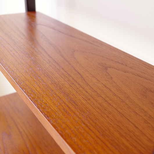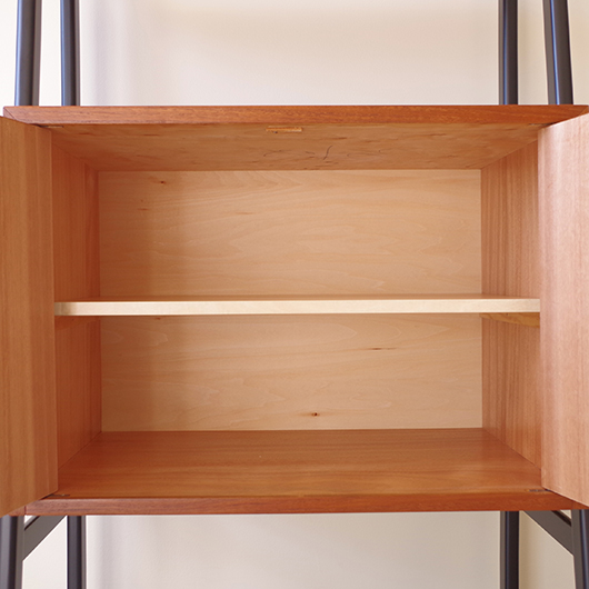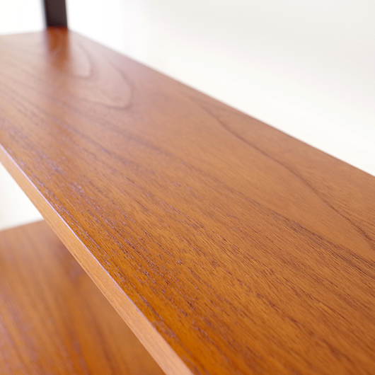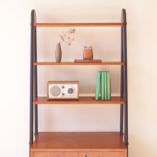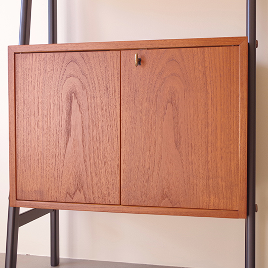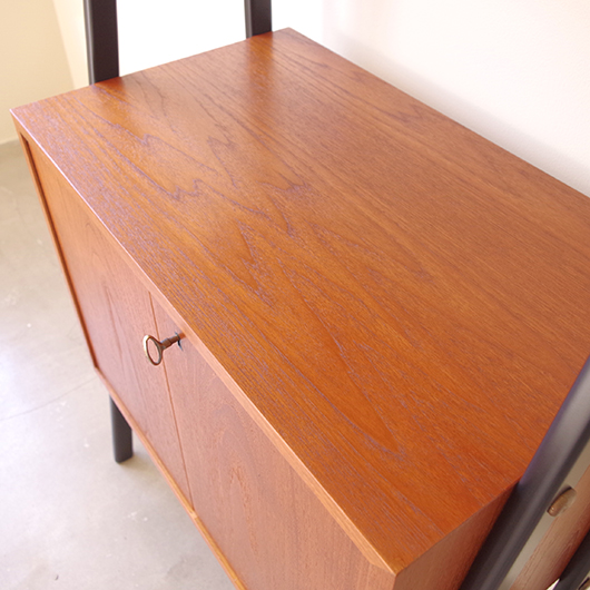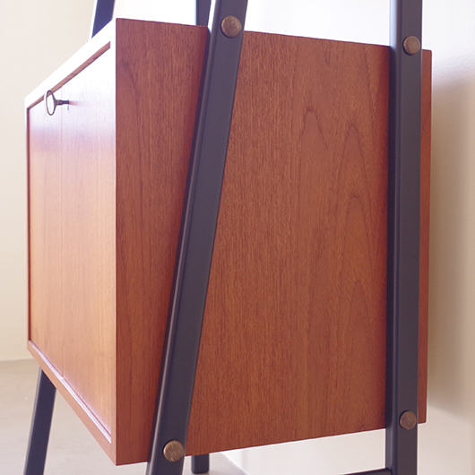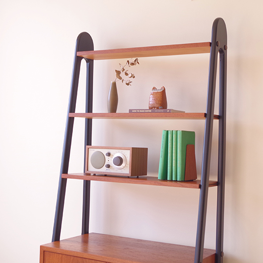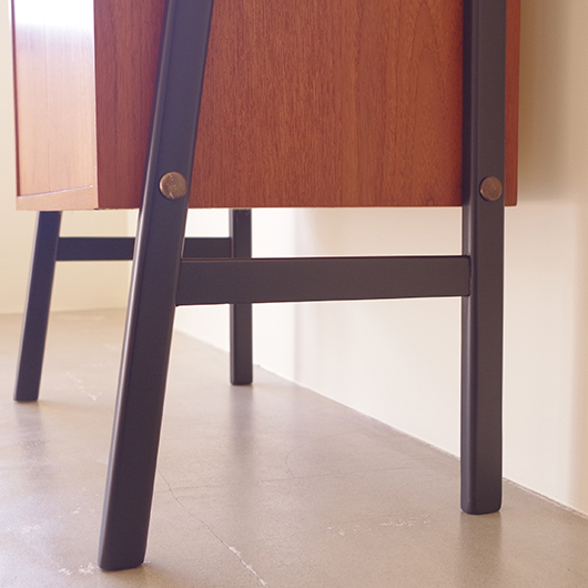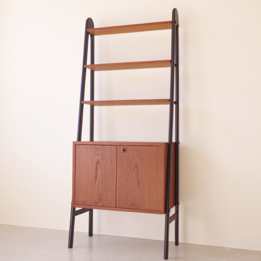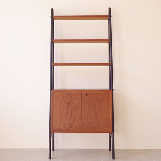 1960年代スウェーデン製のヴィンテージ オープンシェルフ。 ブラックにペイントされたV時のフレームで側面から本体を支える構造のシェルフで、斜めに伸びる前脚が印象的です。上部は3枚の棚板が備わり、下部は扉を開けると取り外し可能な棚板の付いた収納部となっております。 本体は明るい色味のチーク材が用いられ、そこにブラックにペイントされたフレームを合わせることで全体を引き締めています。また側面数カ所見られるビス隠しが真鍮製のため、ヴィンテージらしさを感じる装飾の意味合いも持たせているようです。 飾り棚や食器棚など、それぞれの暮らしに合った使い方が考えられます。そして背板や側面までも抜けた軽やかな作りは、壁面の色や壁紙などを生かしたコーディネートをお楽しみいただけます。また幅を抑えたサイズ感のため様々な場所で活躍してくれることと思います。 全体を丁寧にサンディング(研磨)をした後に再塗装を行い、非常に綺麗な状態に仕上がりました。そのほか細部の状態などは、画像をご参照ください。