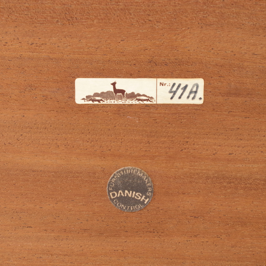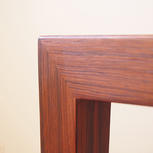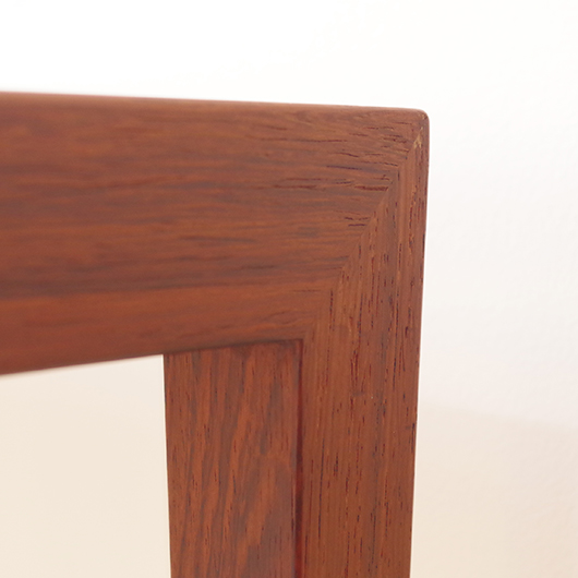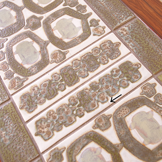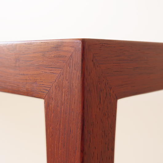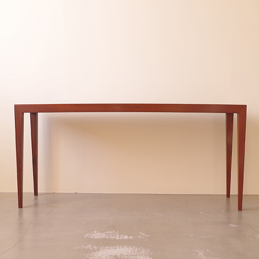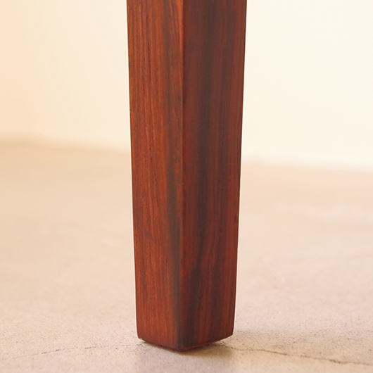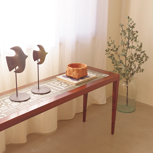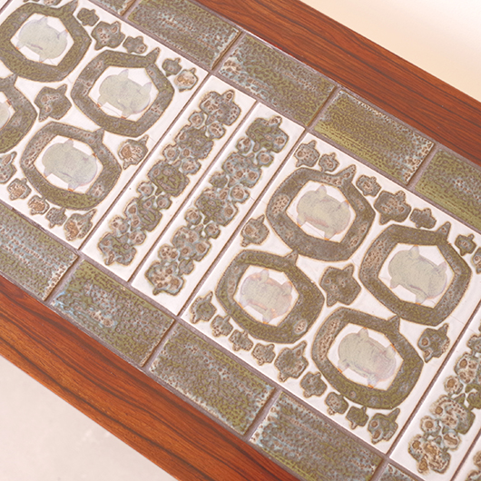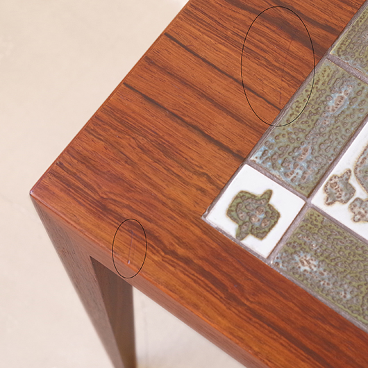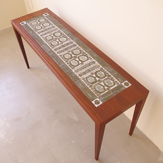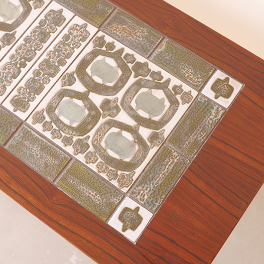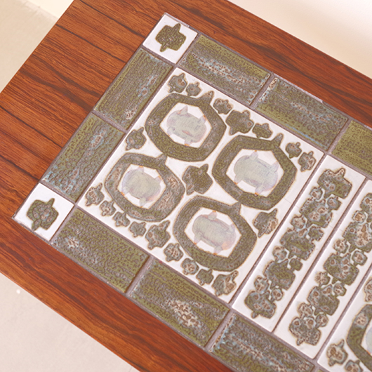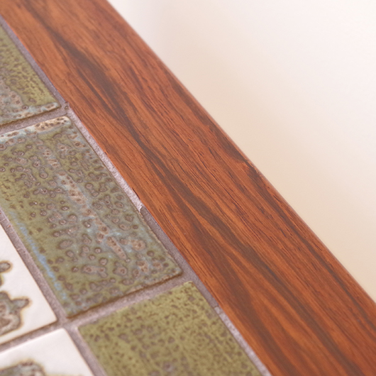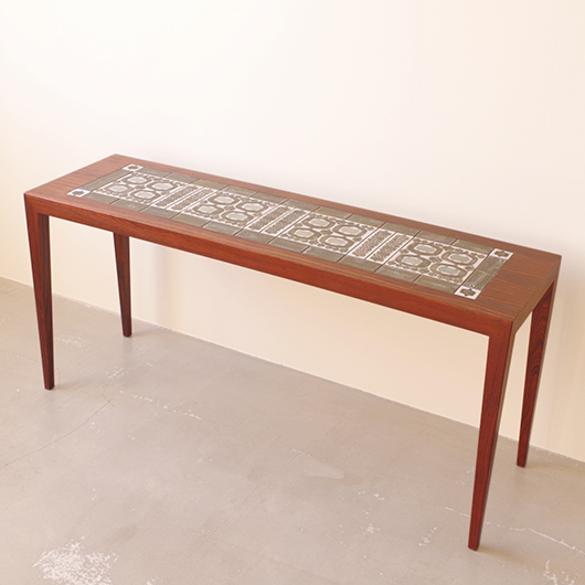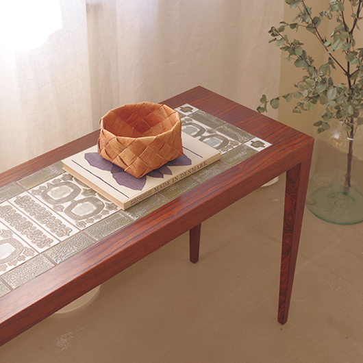 Haslev社とロイヤルコペンハーゲンがコラボレーションをした、1960年代頃のデンマーク製タイルトップテーブル。天板にはロイヤルコペンハーゲンTENERAシリーズのタイルが敷き詰められ、落ち着いたモスグリーンを主としたニュアンスのある色味のタイルはモダンな絵柄の多いテネラシリーズの中でも他のインテリアにも合わせやすのではないでしょうか。 フレームの素材には素材にはワシントン条約のレッドリストに入っている高級木材ローズウッドが用いられております。随所に見所のある木目が見られ、素材感もお楽しみいただけることと思います。 緻密に合わさった接合部や華奢な脚部など、Haslev社ならではの高い技術を伺うことができます。美しいタイルに負けない精巧で上質なフレームを合わせ、ヴィンテージでしか手に入らない贅沢な一台です。 タイルを敷き詰めることで輪染みを気にせずにカップなどを載せることができ、デザイン性はもちろん実用性も兼ね備えております。ソファ前に置いてセンターテーブルとして、また窓際に置いて観葉植物や雑誌を置くコンソールテーブルとしてなど、空間に華やかさを添えてくれることでしょう。 丁寧な修復を行いまして、全体的に良好な状態です。木部天板に小傷や擦れ、タイルの表面にうっすらとクラックが見られます。普段使いには問題のないものかと思いますが、それを考慮したお得なお値段となっております。そのほか細部の状態などは、画像をご参照ください。