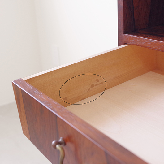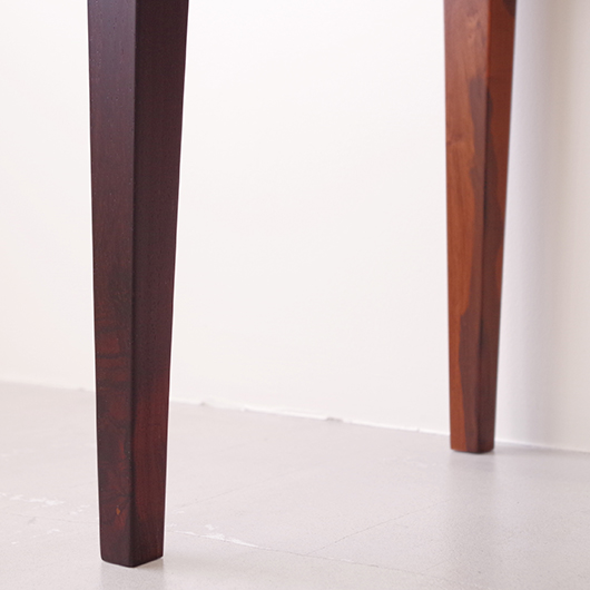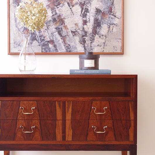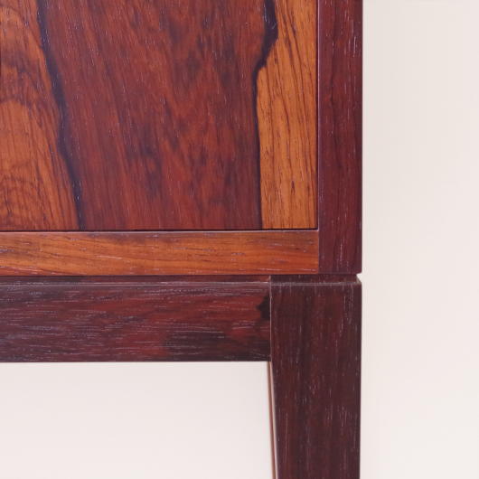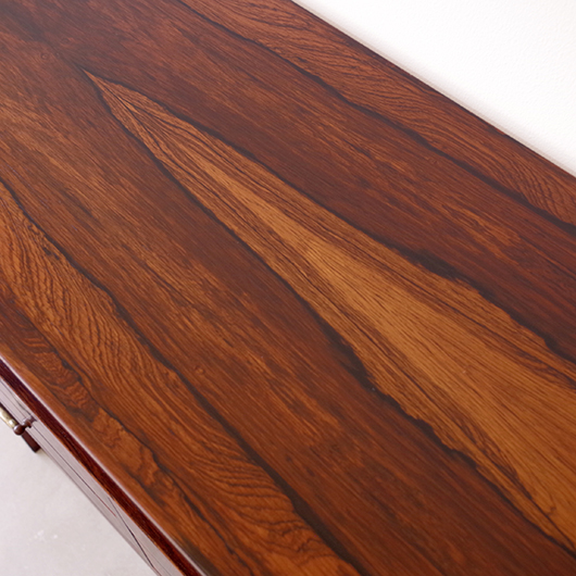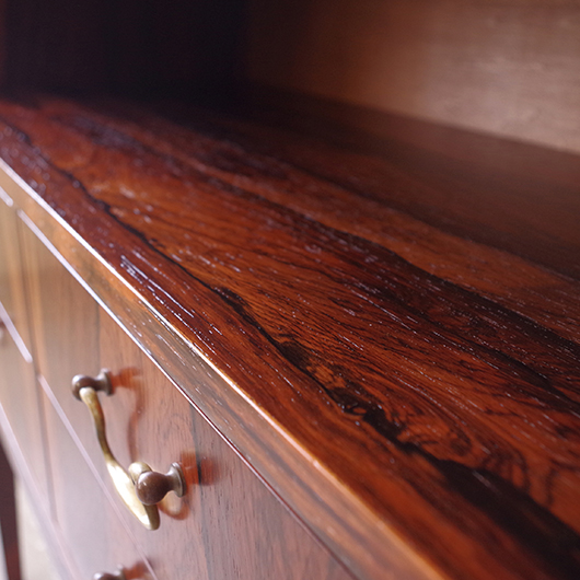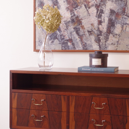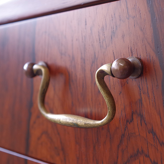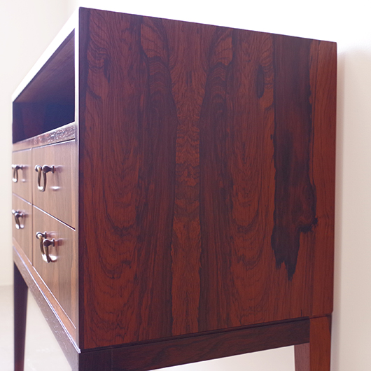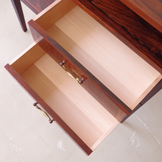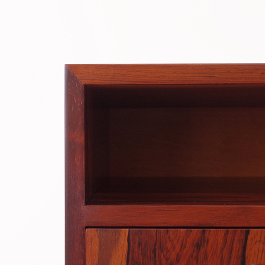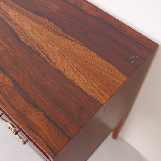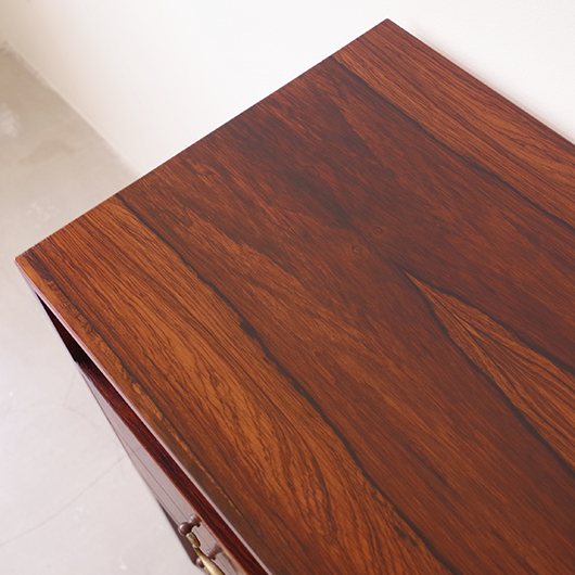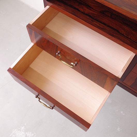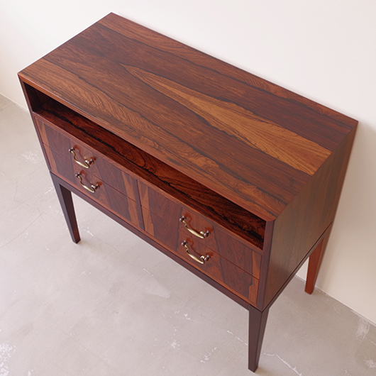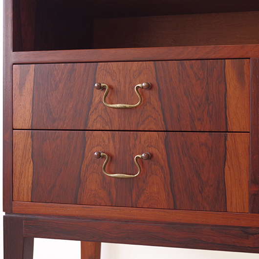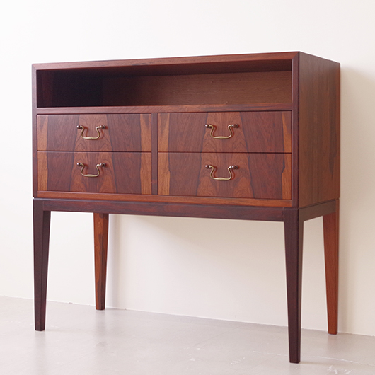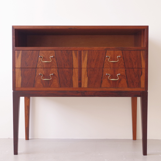 1940〜1950年代デンマーク製の、ヴィンテージキャビネット。 中心で左右に分かれたダブルチェスト仕様の引出しが2段と、最上部は引出しのないオープンスペースになっております。取っ手はスワンネックと呼ばれるチッペンデール様式のハンドルが組み合わさり、当時デンマーク家具がモダンになる過程にあった時代ならではのエレガントさを感じるものです。 一番の見所はその素材で、ワシントン条約のレッドリストに入っている希少な高級木材であるローズウッドが用いられております。またこちらは特に木取りが良くローズウッドらしいダイナミックな杢が天板や正面部分など随所に感じられます。 脚部の抜け感など軽やかさを出しつつ、エレガントな美しさの際立つデザインです。デザイナーや工房は調べきれませんでしたが、非常に上質な一台です。 リビングや寝室などに置いて文具や小物などを、玄関でシューケア用品など細かなものをまとめて収納してはいかがでしょうか。そして上部壁面に絵画やミラーを合わせたり、天板に花器を置いたりと象徴的なコーナーを作り出すことができそうです。 全体を丁寧にサンディング(研磨)をした後に再塗装を行い、自然な艶の良い雰囲気に仕上がりました。引出し底板は新しく交換済みのため、清潔にお使いいただけます。全体的に非常に綺麗な状態です。そのほか細部の状態などは、画像をご参照ください。