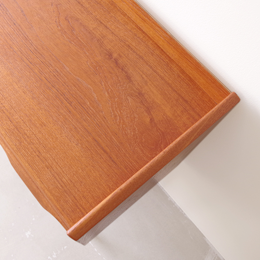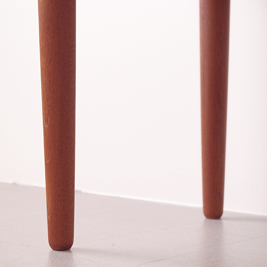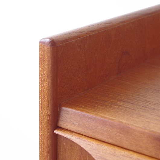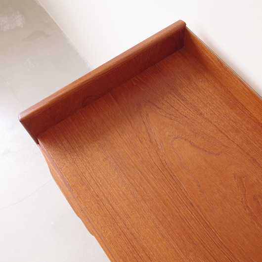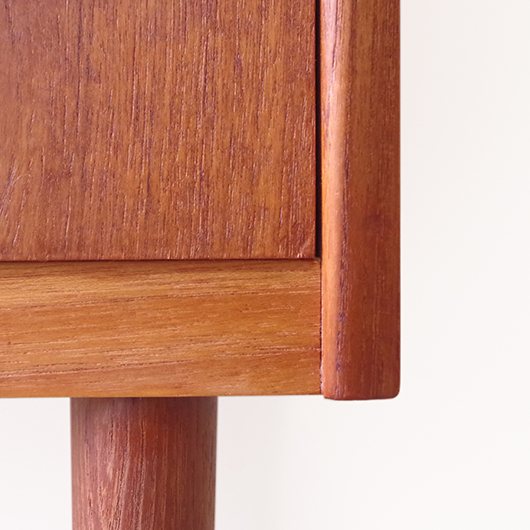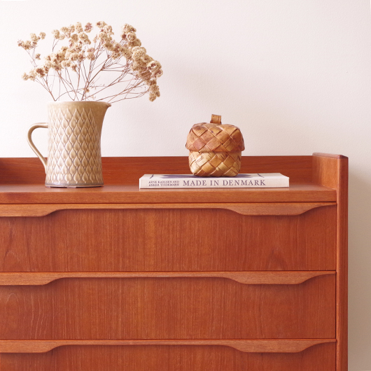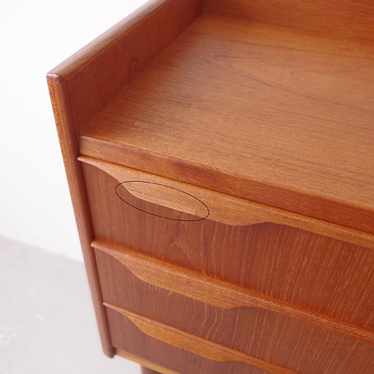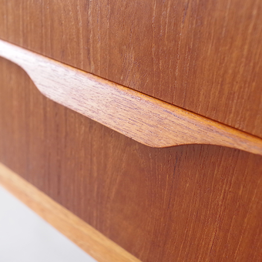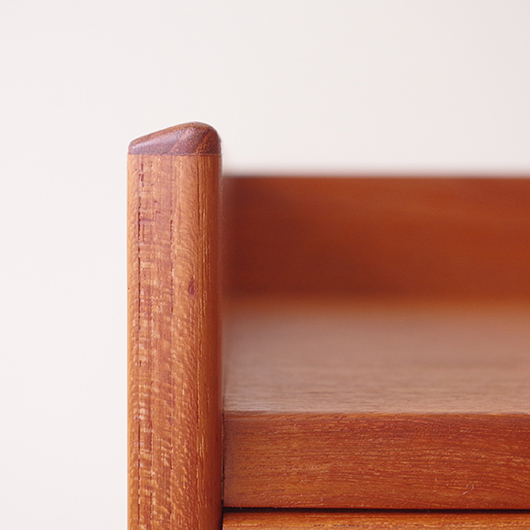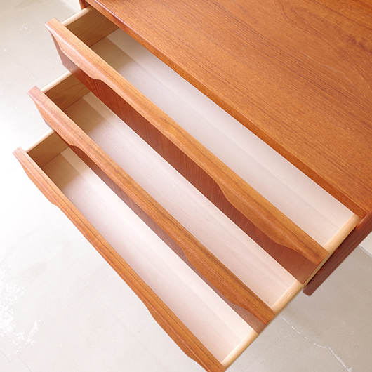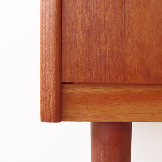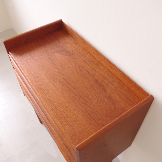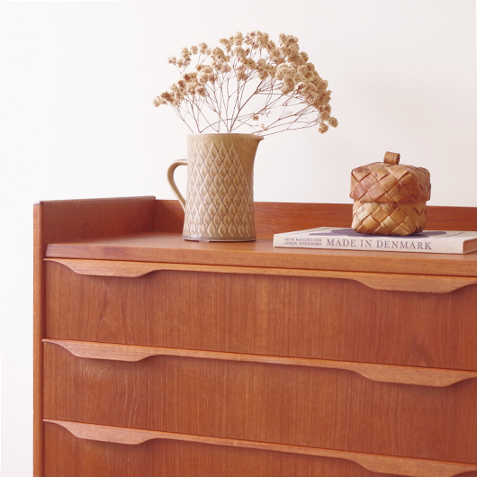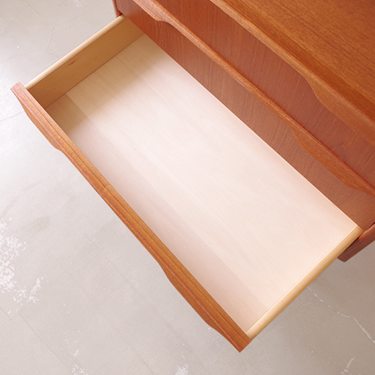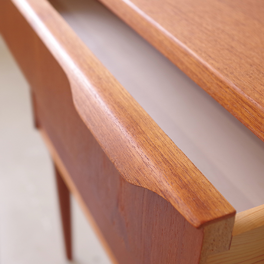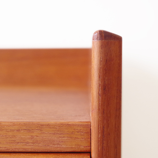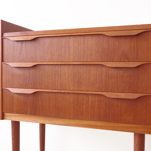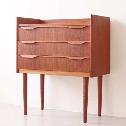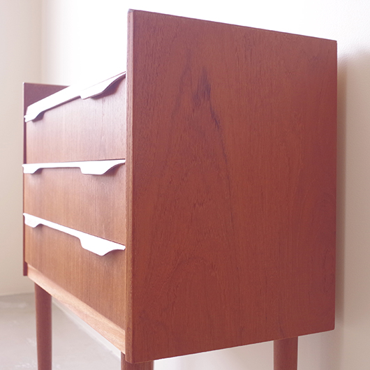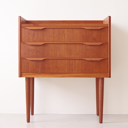 1960年代デンマーク製のヴィンテージ3段スモールチェスト。引出しの縁に沿って付けられたの取っ手はプライウッドの特性を生かしたカーブが特徴で指掛かりも良く、すっきりとした印象を与えてくれます。正面から見て上下に揃った木目も、丁寧に作られたデンマーク製のヴィンテージらしさのひとつで、スラリと伸びる脚部を含めて小ぶりながらに見応えもたっぷりです。 玄関やリビングはもちろんベッドサイドなどに置いて、文具など細かなものを収納していただけます。天板には小物や花瓶などをディスプレイしたり、ベッドサイドではテーブルランプや目覚まし時計を置いたりと様々な使い方が思い浮かびます。程よい高さのため、上部の空間にポスターや壁掛けミラーを合わせても良さそうです。 丁寧な修復を行いまして、全体的に綺麗な状態です。引出しの底板は新しいものに交換しておりますので、清潔にお使いいただけます。取っ手に突板の補修箇所や僅かな小キズなど残りますが、まず気にならない程度と思います。そのほか細部の状態などは、画像をご参照ください。