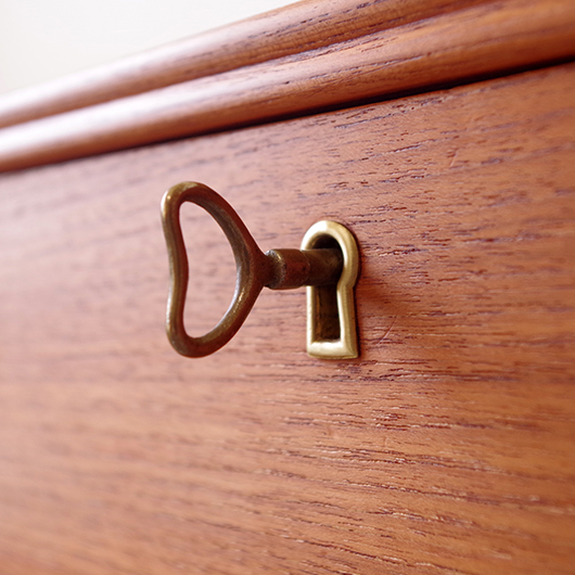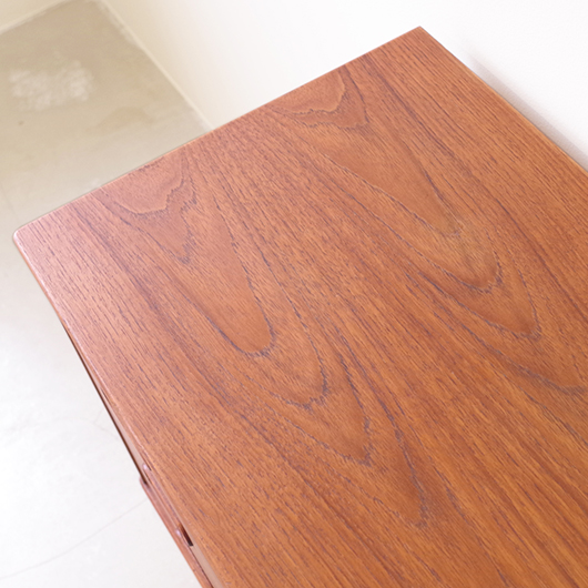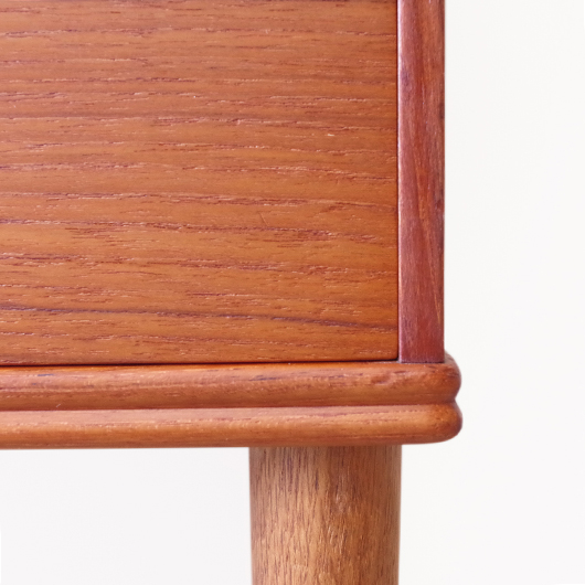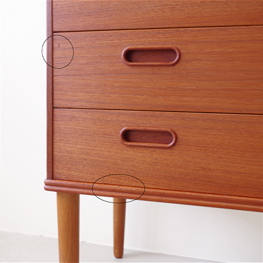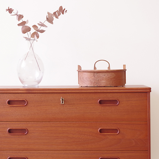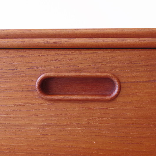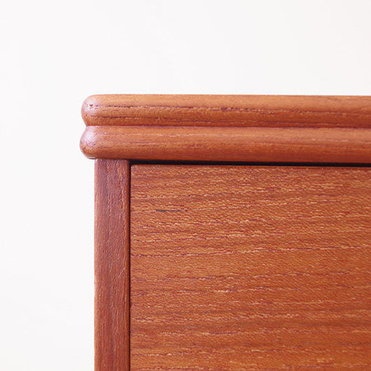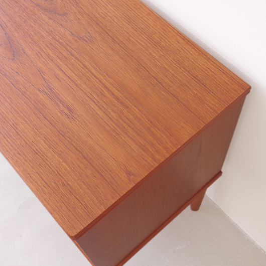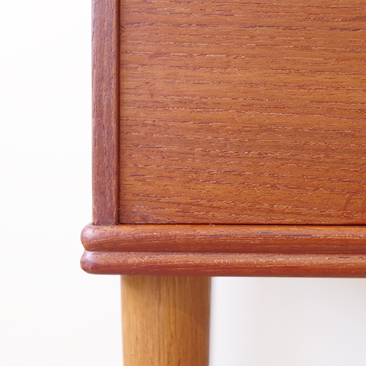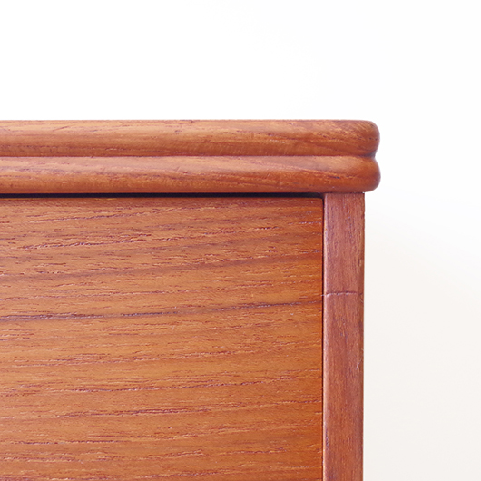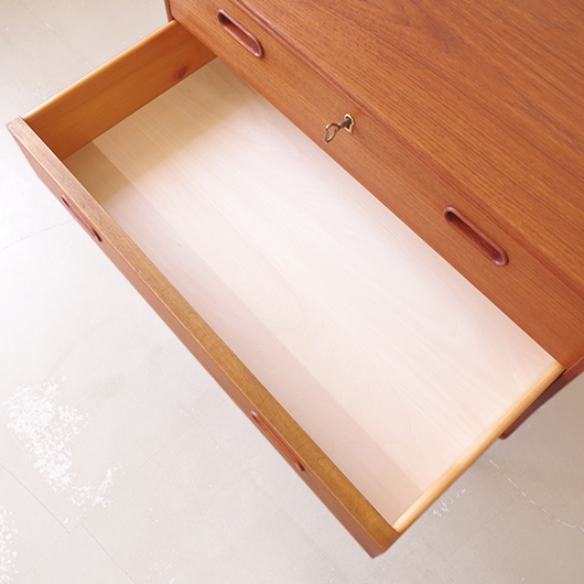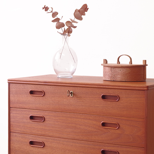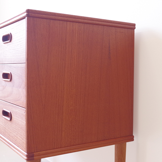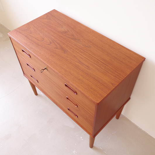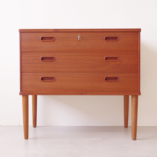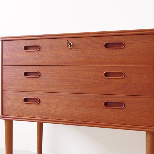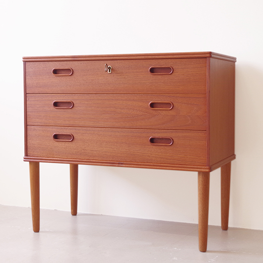 1960年代デンマークVinde Møbelfabrik製のヴィンテージ3段ミディアムチェスト。 上下のエッジにはまるでモールディングのような縁取りがあり、すっきりとした中に上質なエレガントさをプラスしています。本体をくり抜いて取り付けられたチーク無垢材のオーバル型取っ手も、全体のデザイン性に合ったものというだけでなく、指がかりの良い使い勝手も考えられたものです。また最上段に付いた雰囲気のある鍵も、このサイズのチェストではあまり見られないものです。本体にチーク材、脚部にオーク材と色味の異なる樹種ゆえに、軽やかさを感じます。 Arne Wahl Iversenのビューローなど細部まで丁寧に作られた家具を生み出してきた同工房ゆえ、こちらのチェストも同様の上質さが生きています。 リビングや寝室に置いて細かなものを収納したり、天板には花器や陶器などを飾ったりと、暮らしの中で便利にお使いいただけると思います。程よい高さのため、上部の空間にポスターや壁掛けミラーを合わせても良さそうです。 丁寧な修復を行いまして、全体的に綺麗な状態です。引出しの底板は新しいものに交換しておりますので、清潔にお使いいただけます。天板にごくうっすらとしたシミがありますが、角度によってわかるかどうかの程度のものです。そのほか細部の状態などは、画像をご参照ください。